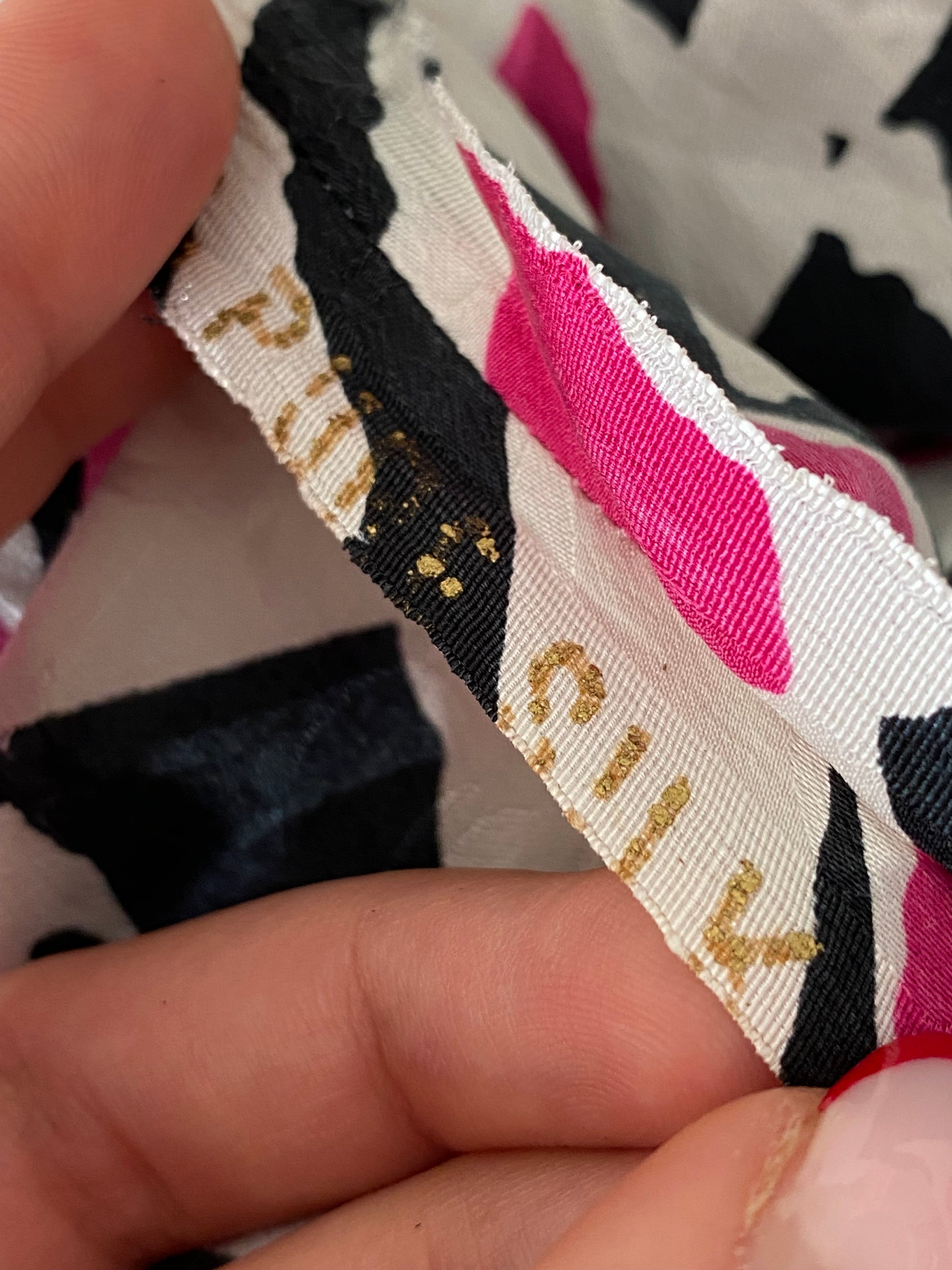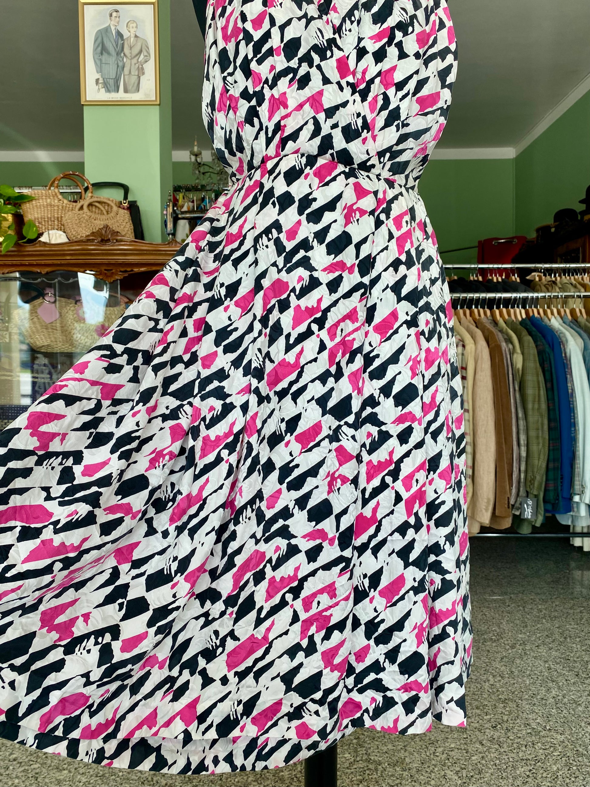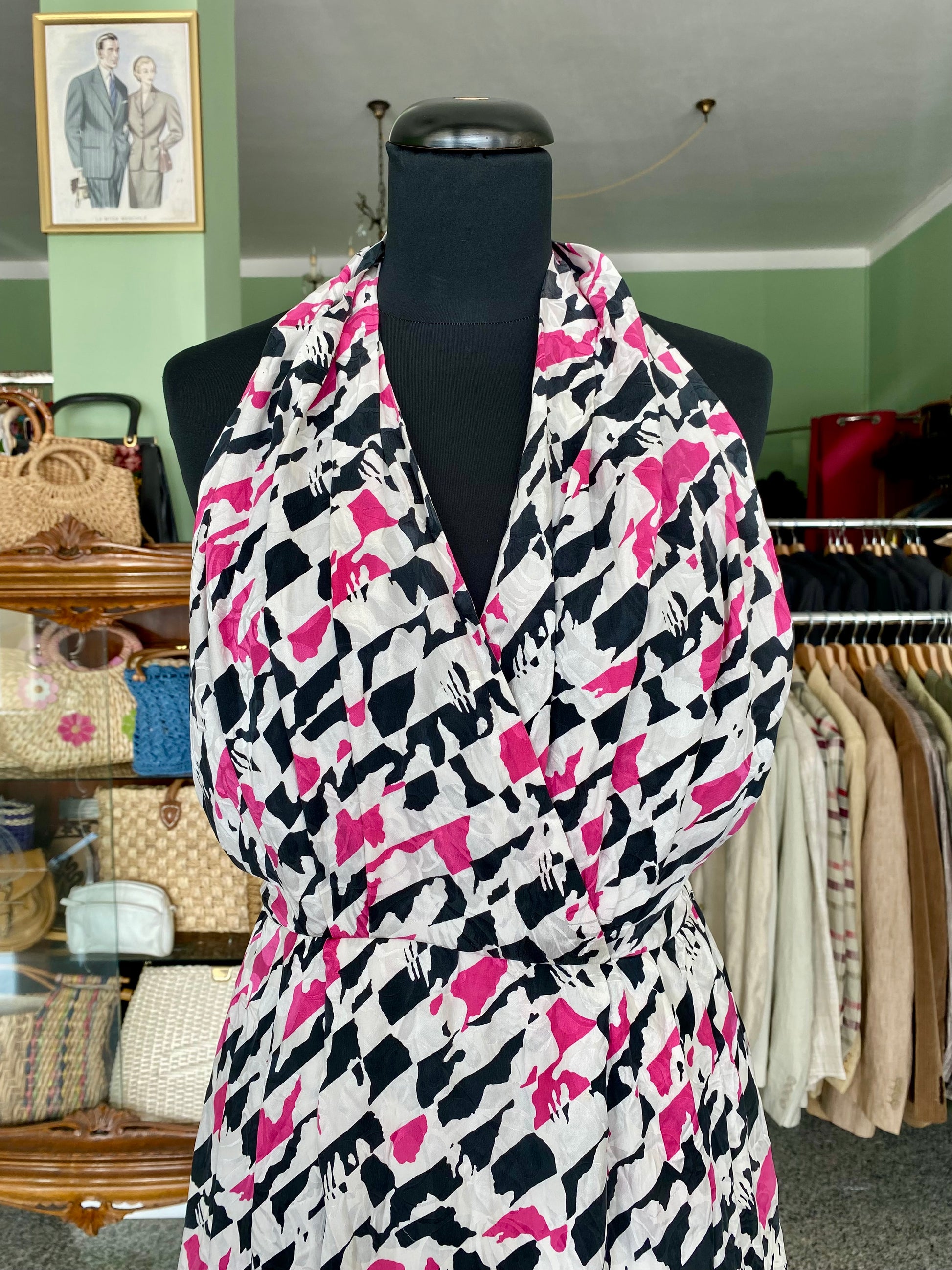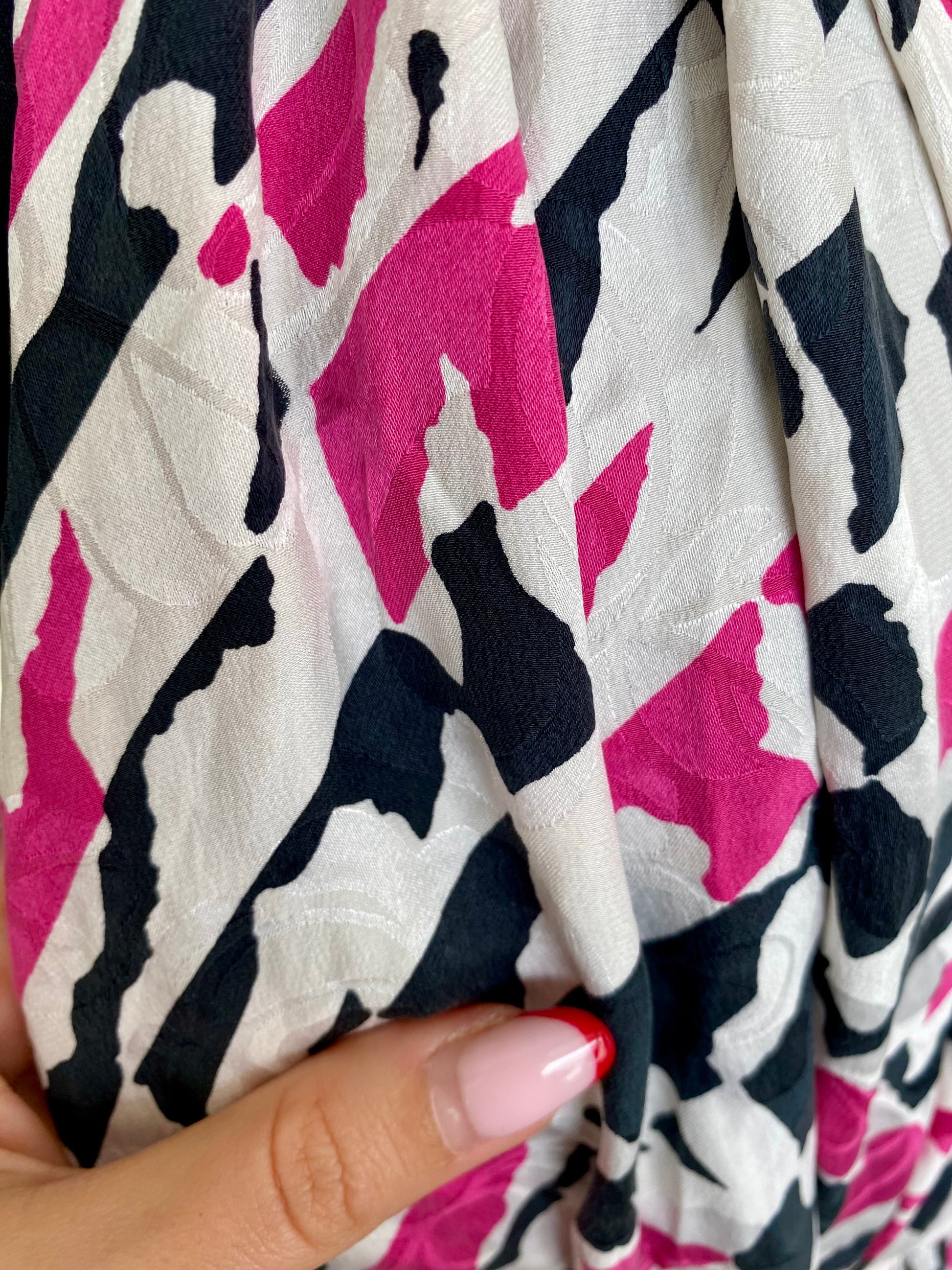 Un capo unico e di grande impatto visivo, realizzato in pura seta leggera e fluida, con una vivace stampa astratta nei toni del fucsia, nero e bianco ghiaccio.