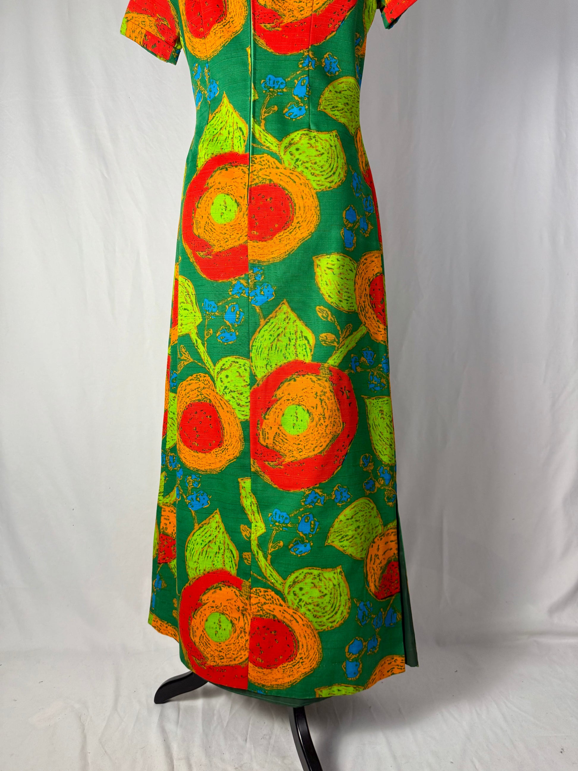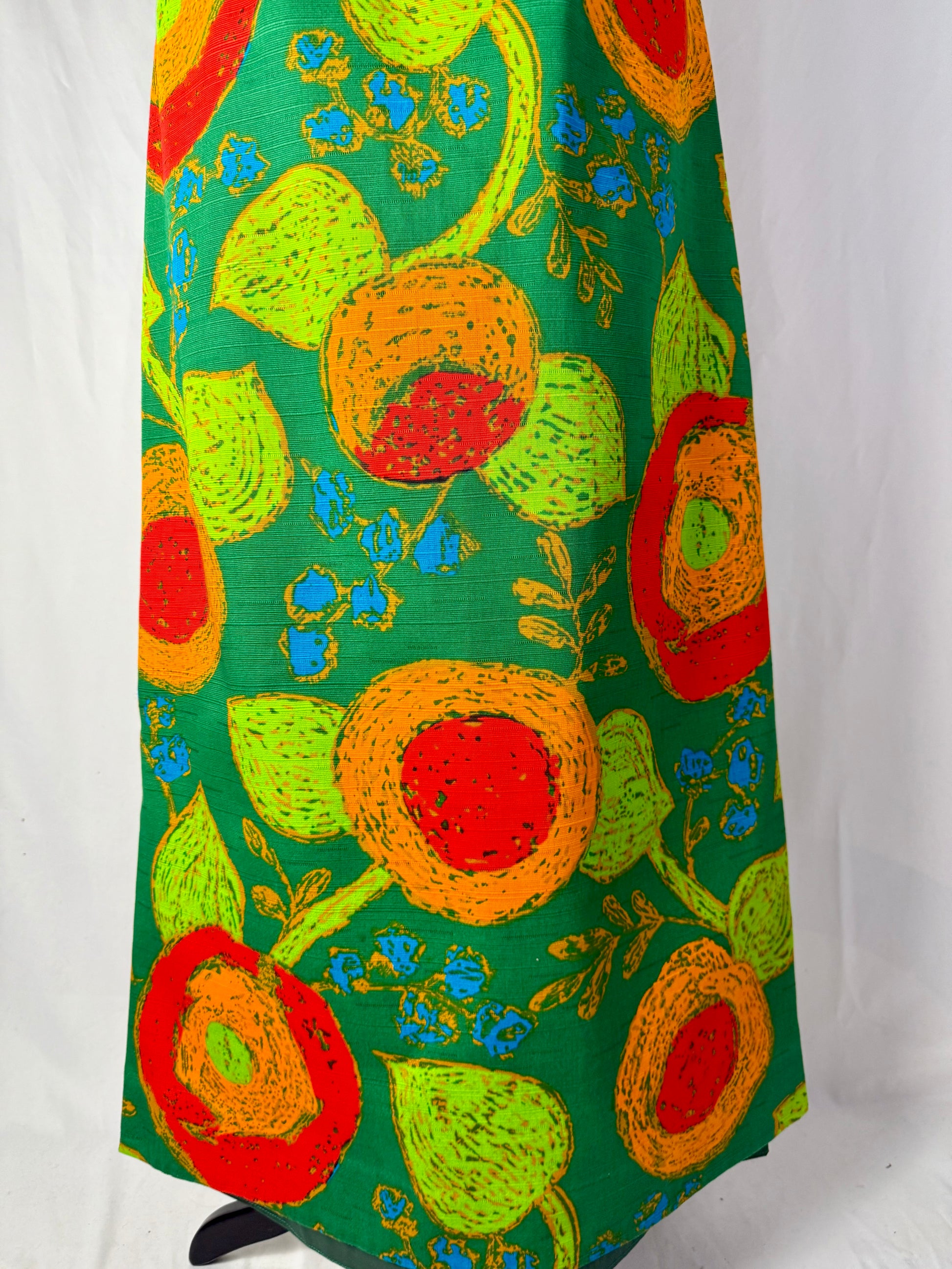 Abito lungo con linea svasata e vita leggermente alta, confezionato in cotone stampato con motivi macro floreali stilizzati nei toni accesi del verde prato, arancio, giallo e blu. Il corpino presenta un colletto a punta e maniche corte. Il taglio sagomato con pince verticali definisce la figura. L’estetica psichedelica e la palette vibrante richiamano le stampe grafiche dei primi anni Settanta, in perfetto stile “flower power”