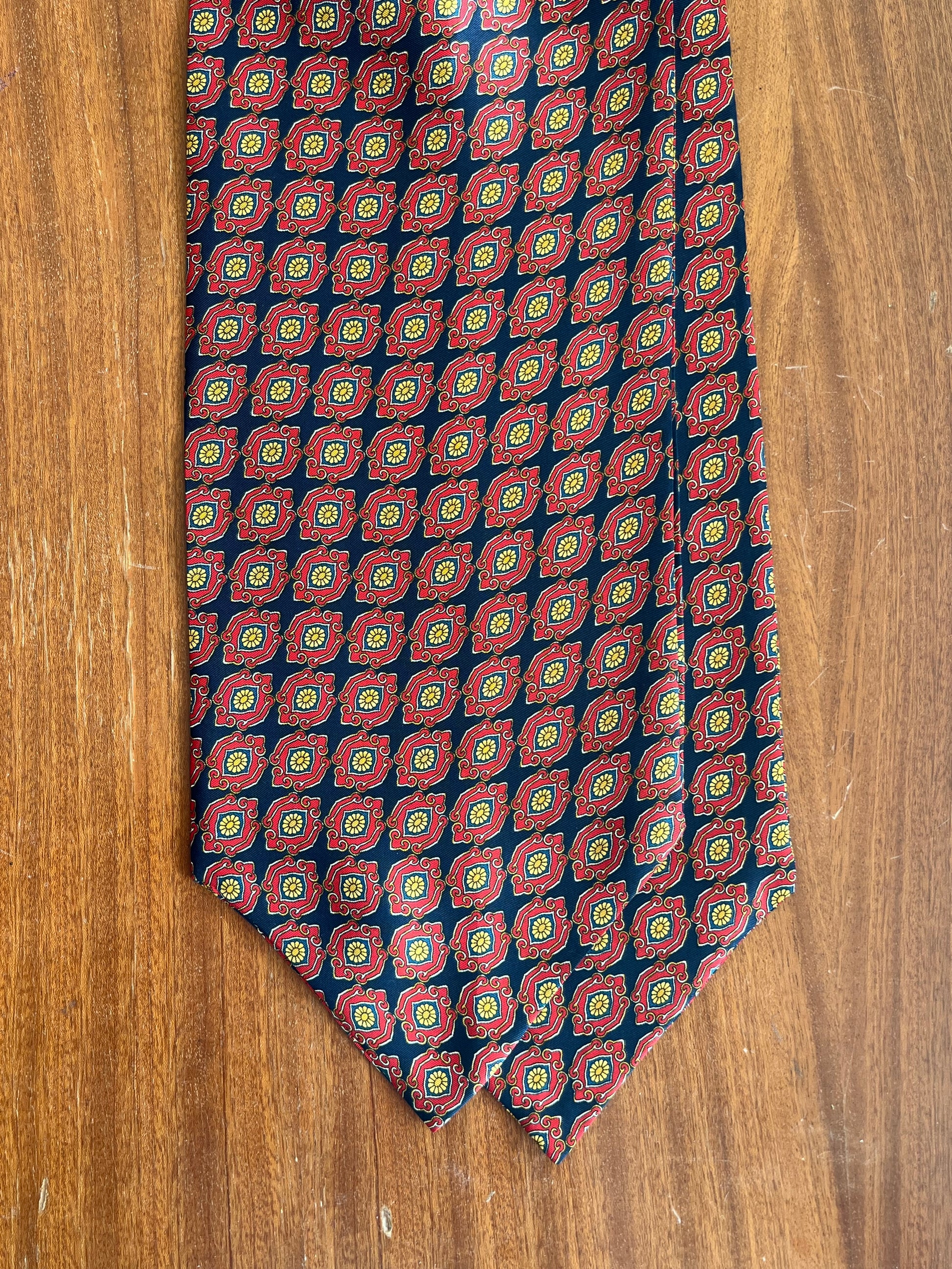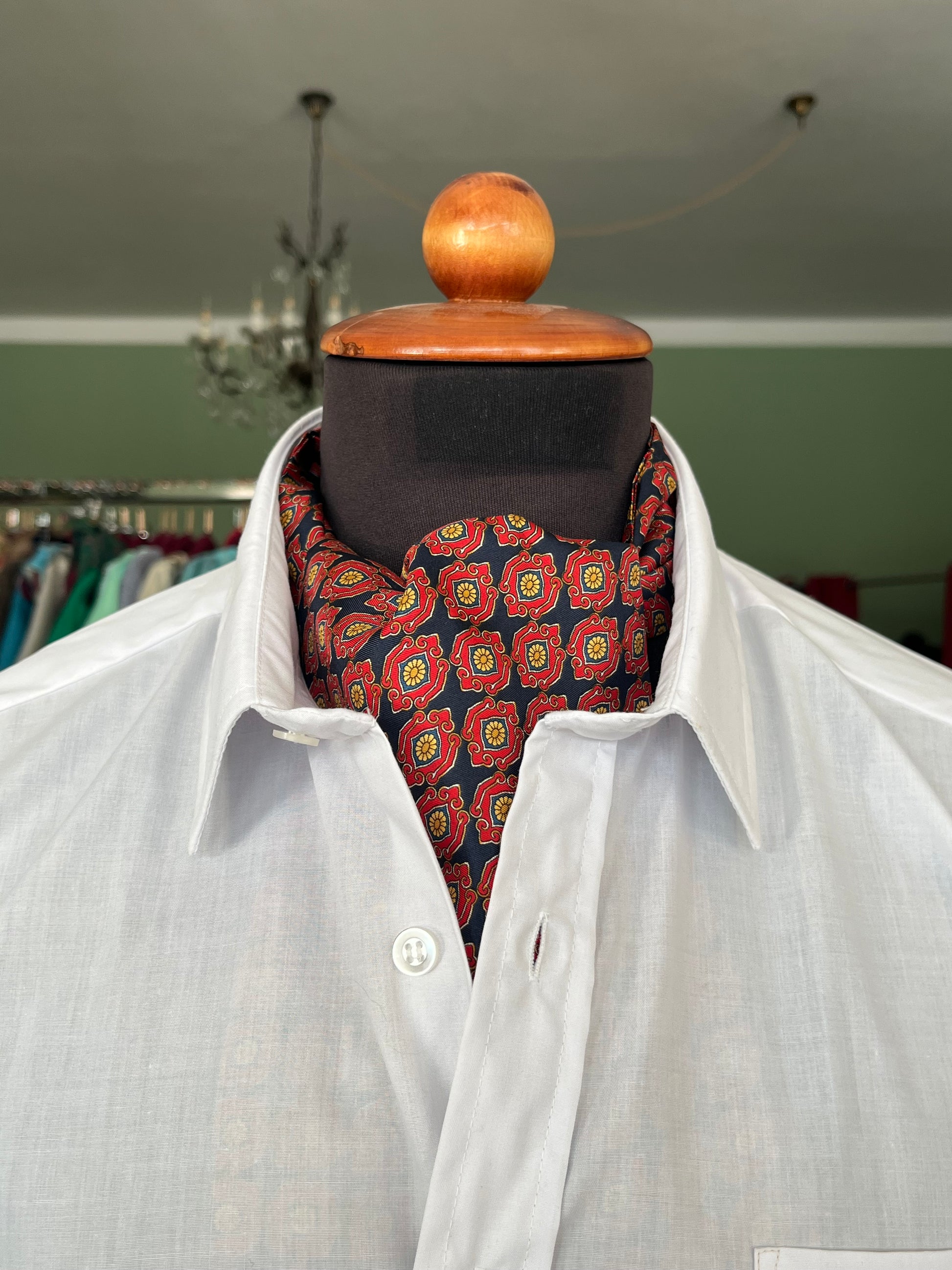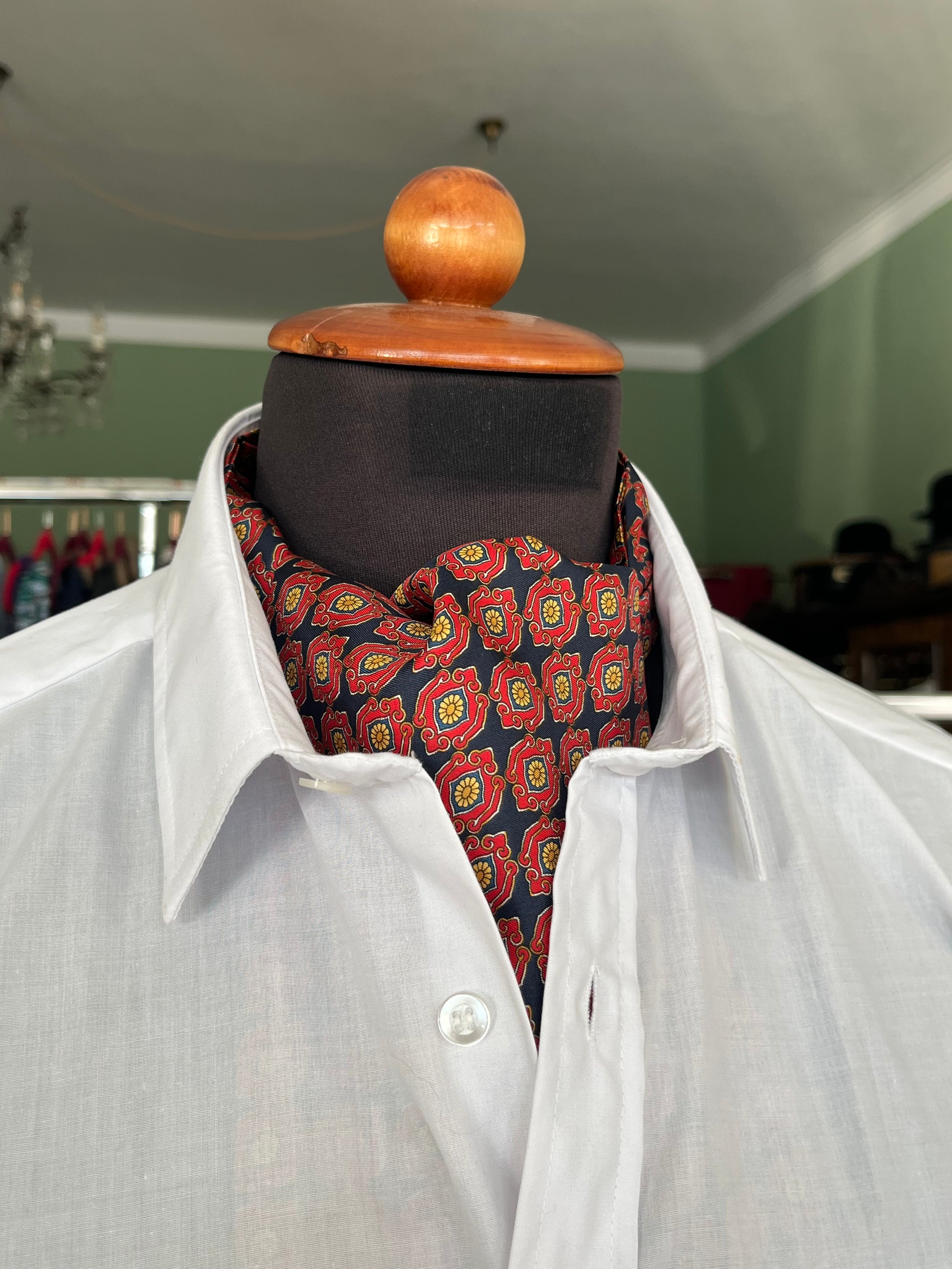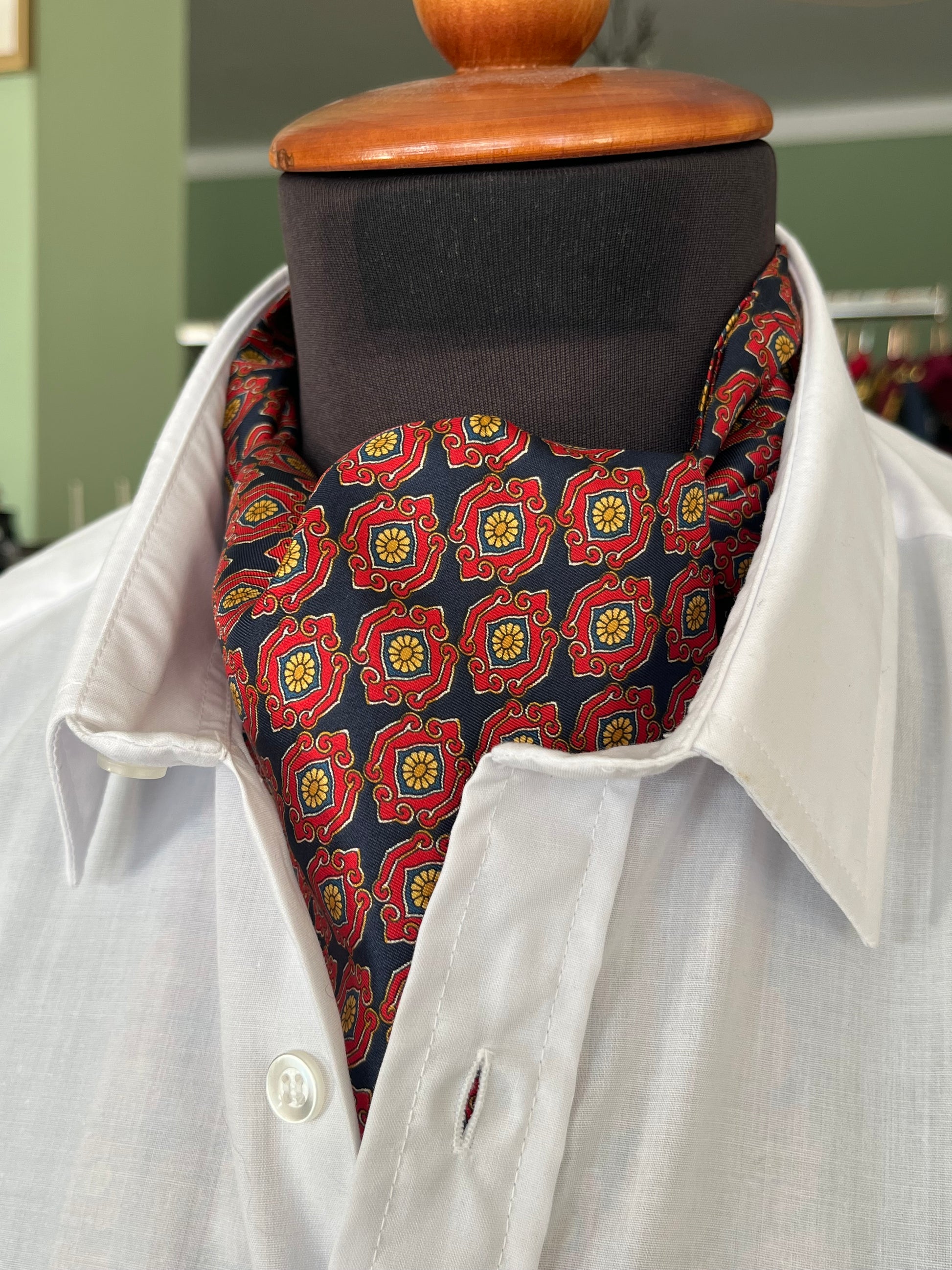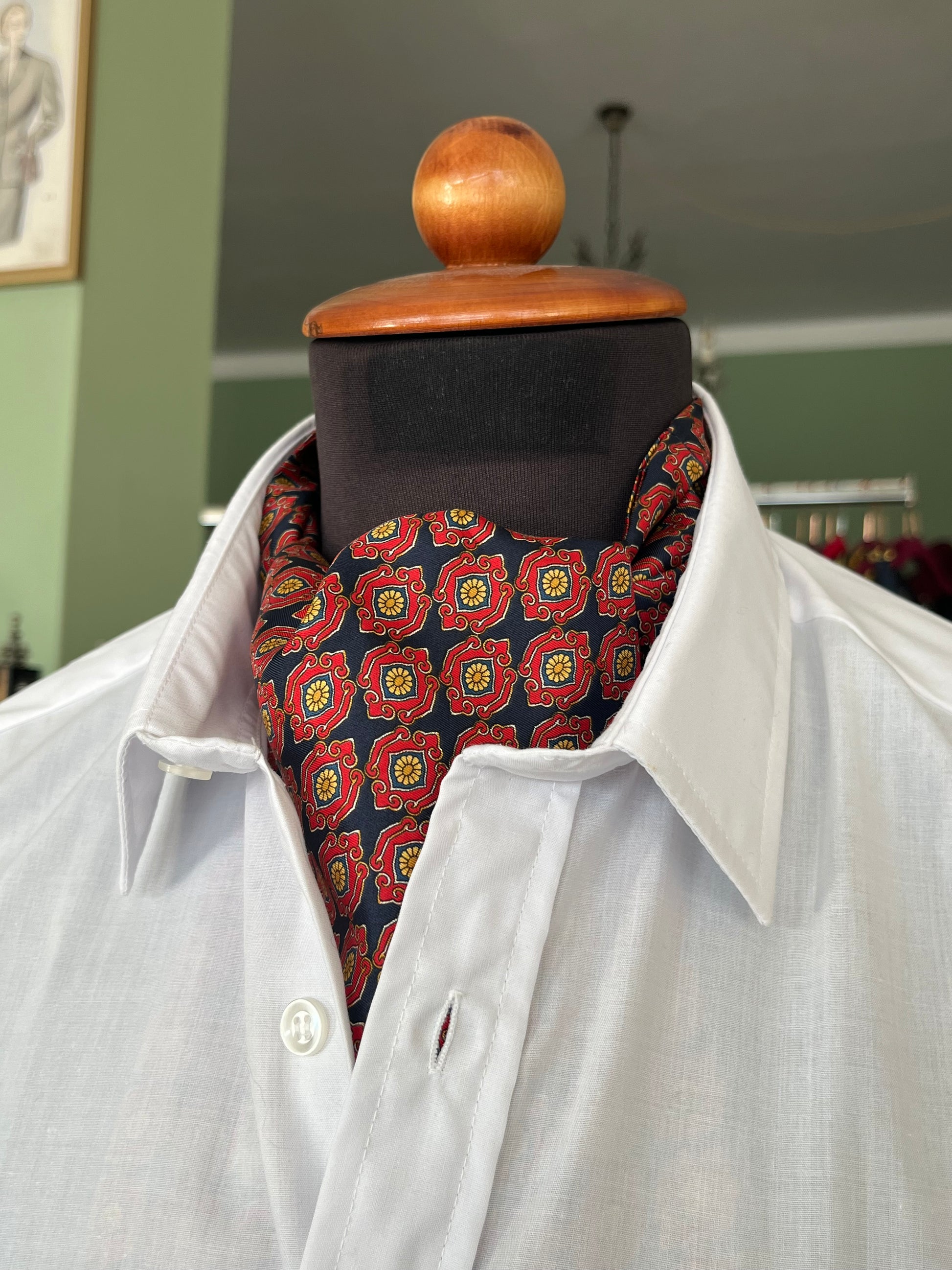 Ascot in 100% pura seta. L‘ascot è di colore blu e rosso con fantasia astratta.