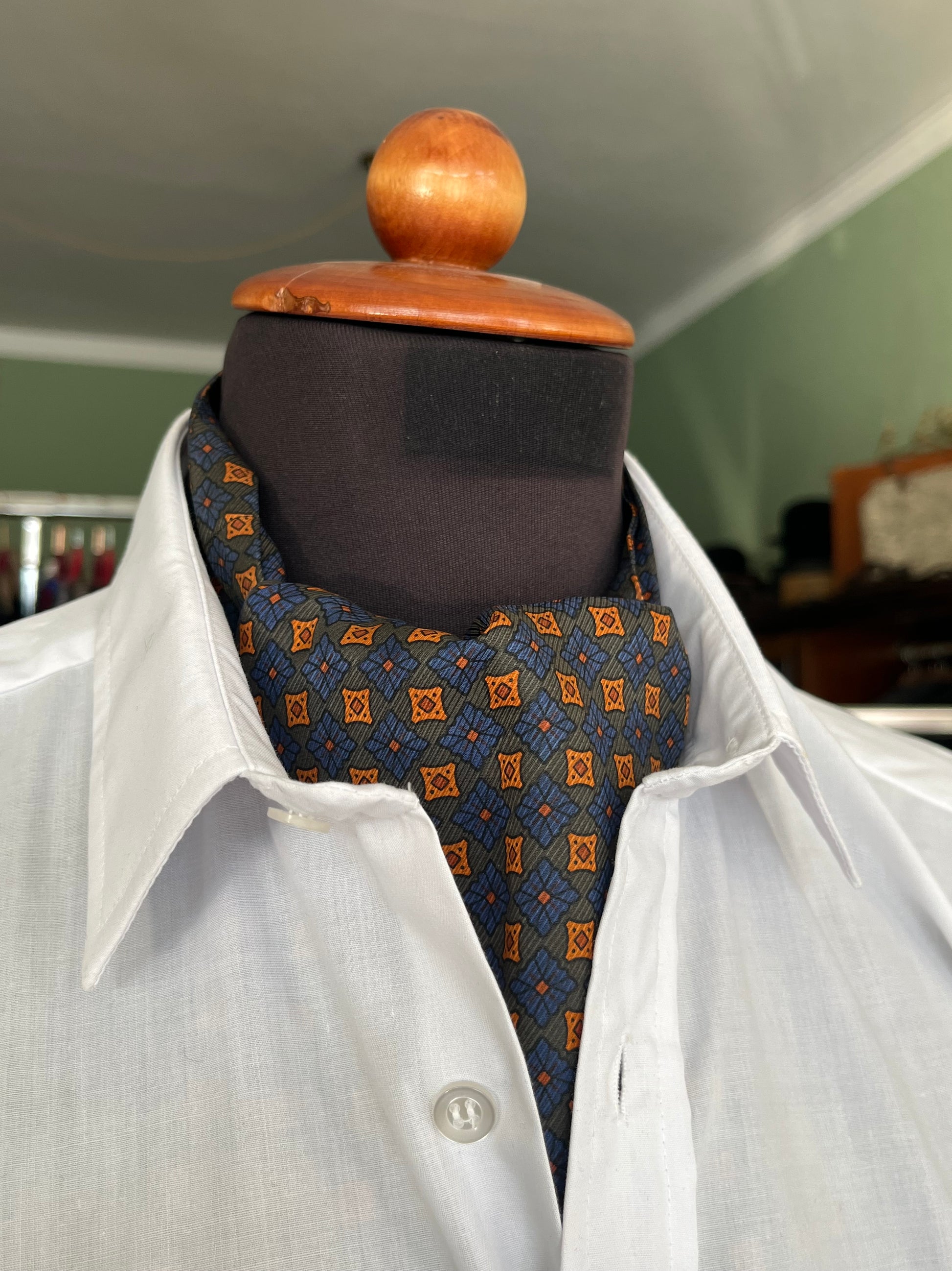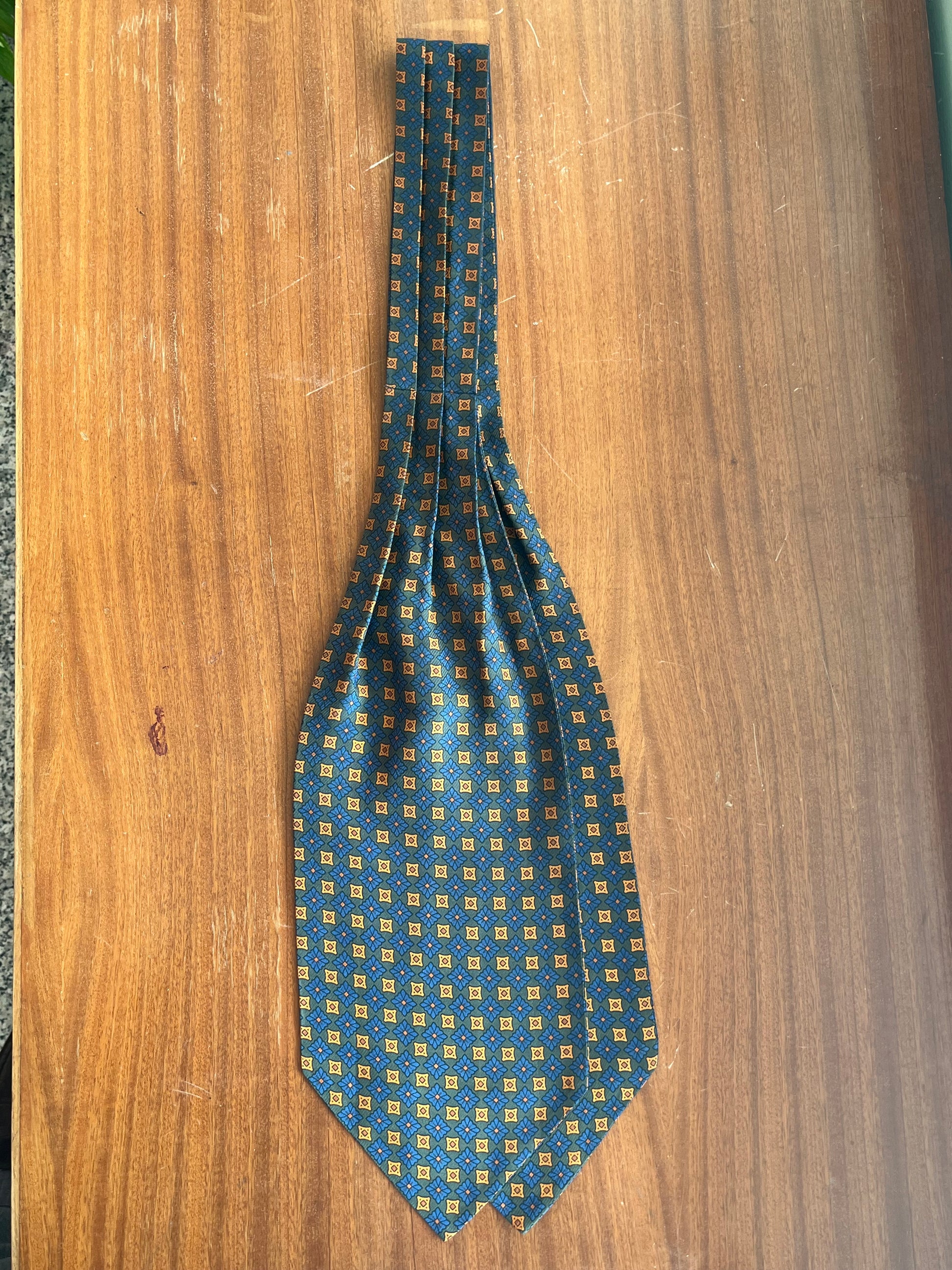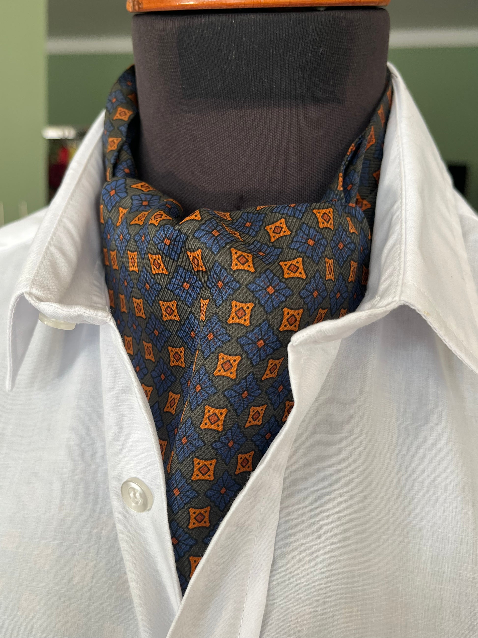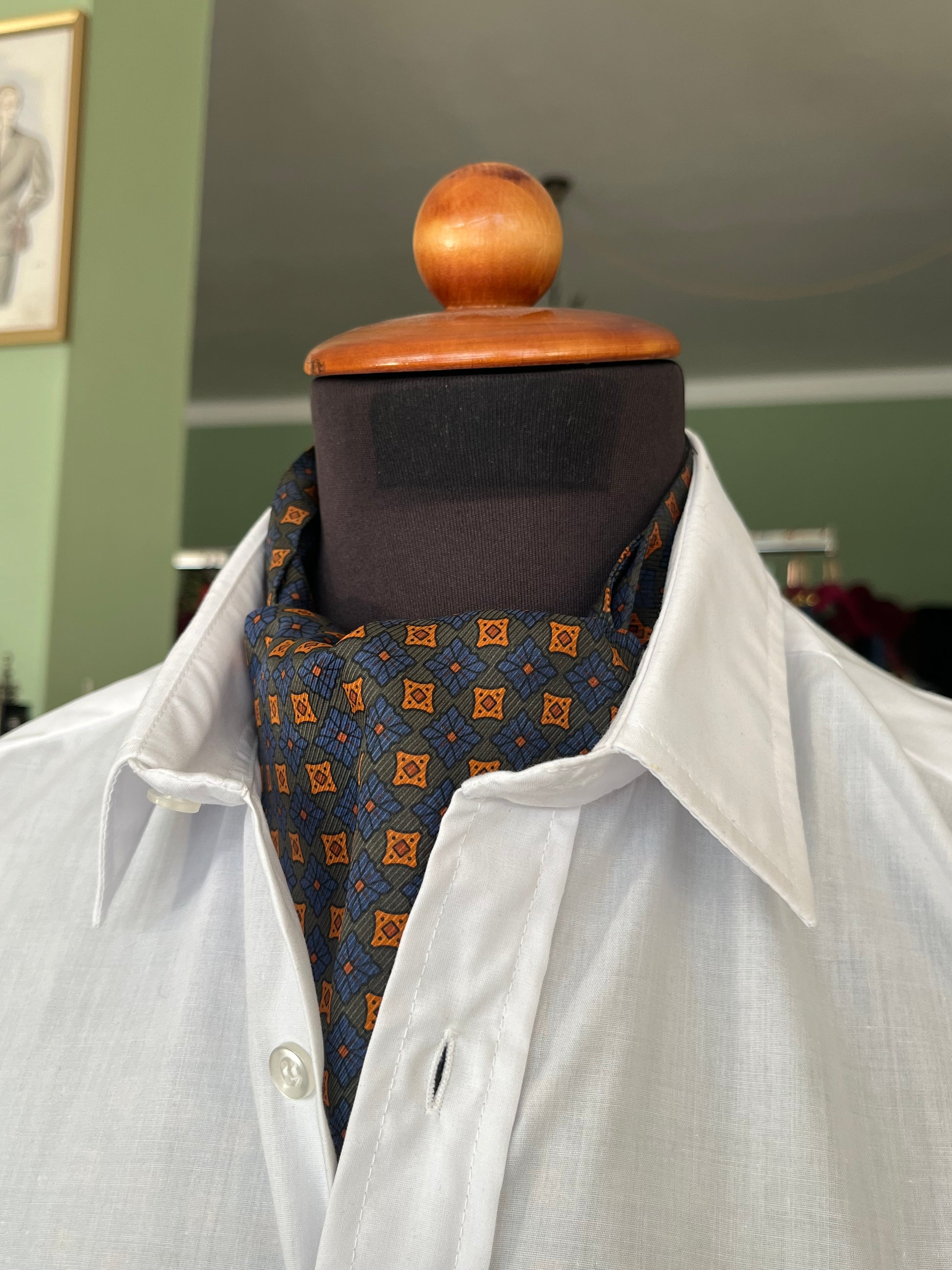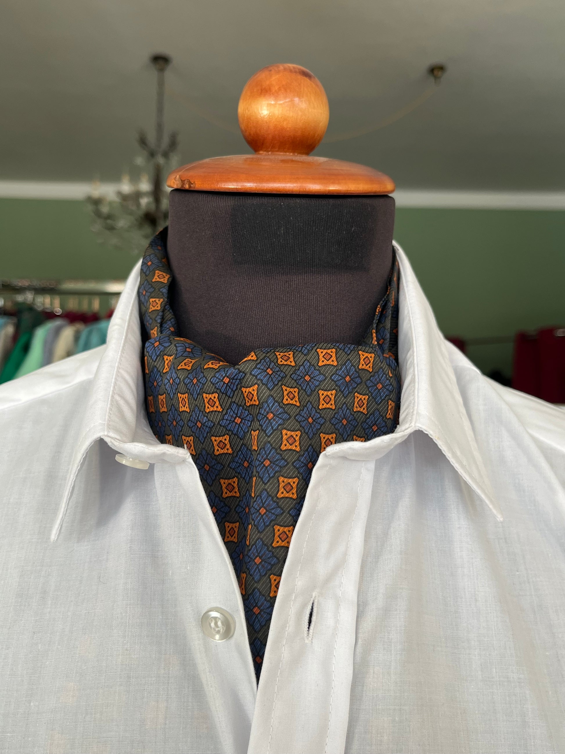 Ascot in 100% pura seta. L‘ascot è di colore verde con fantasia geometrica.