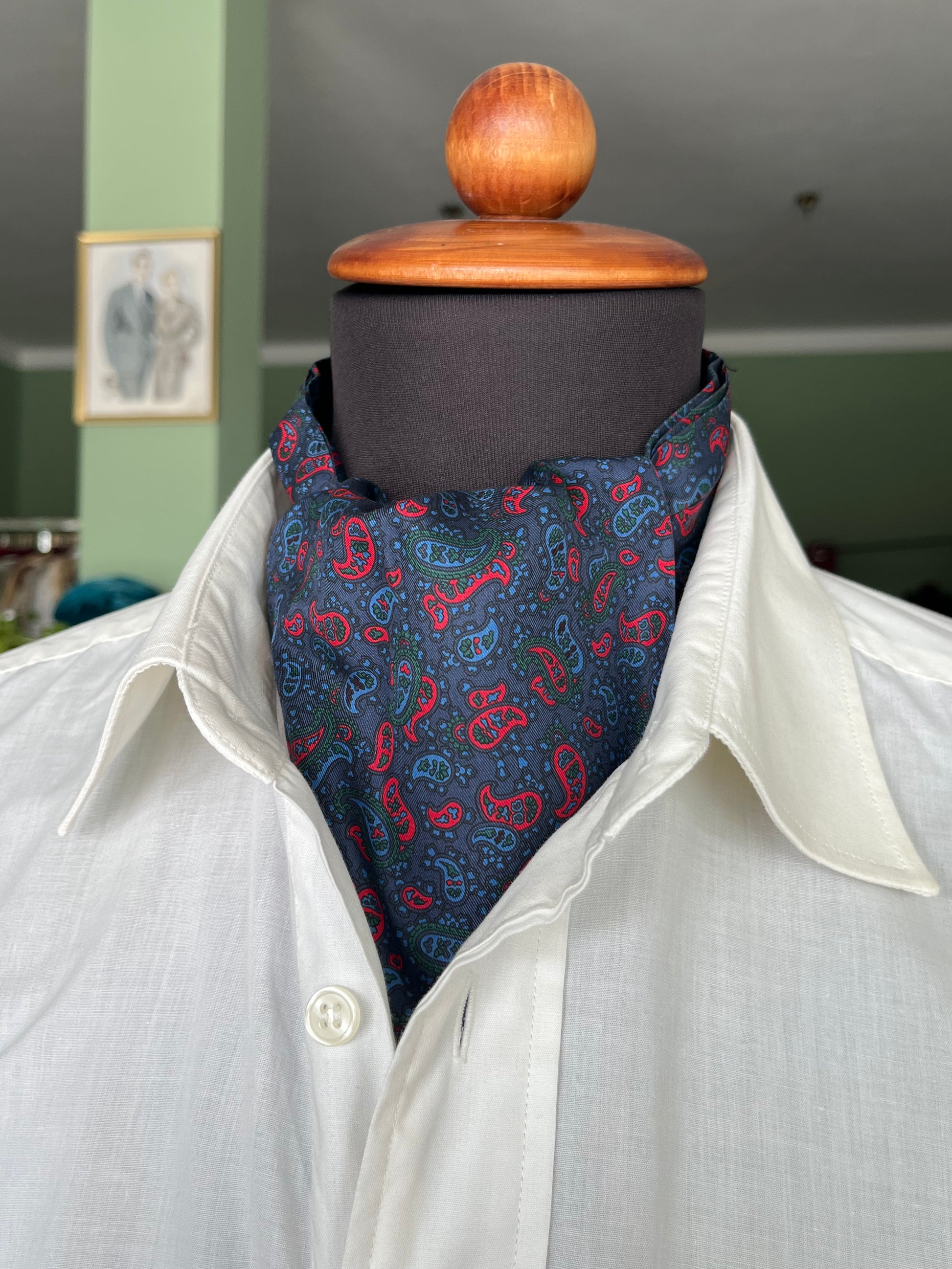 Ascot in 100% pura seta. L‘ascot è di blu vivace con fantasia paisley.