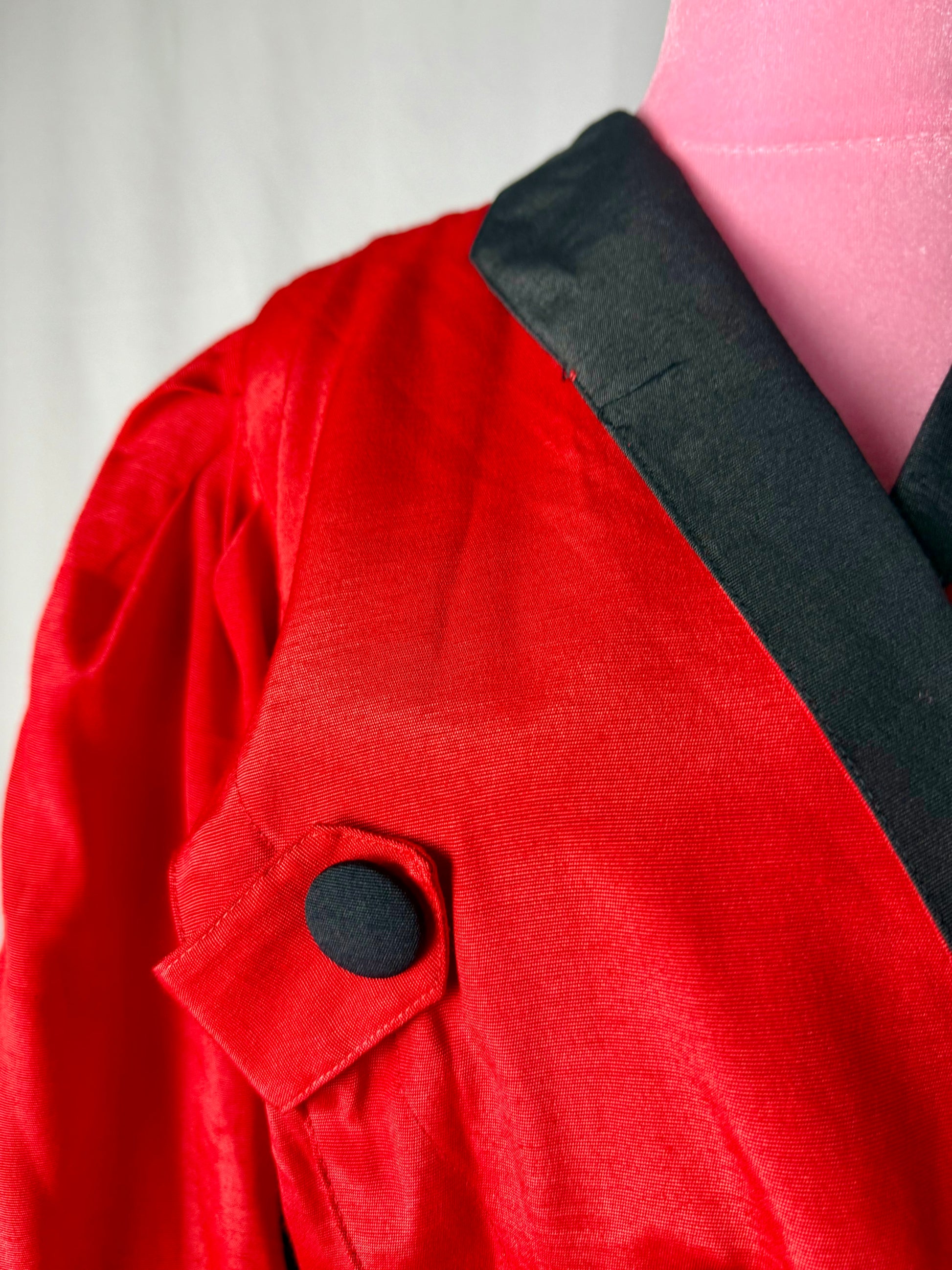 Iconico bolero anni ’80 in viscosa lucente bicolore, rosso fuoco e nero antracite. Linea corta e voluminosa, maniche pipistrello e dettaglio posteriore con bottone rivestito. Un capo scenografico e grintoso, perfetto per aggiungere carattere a ogni look.