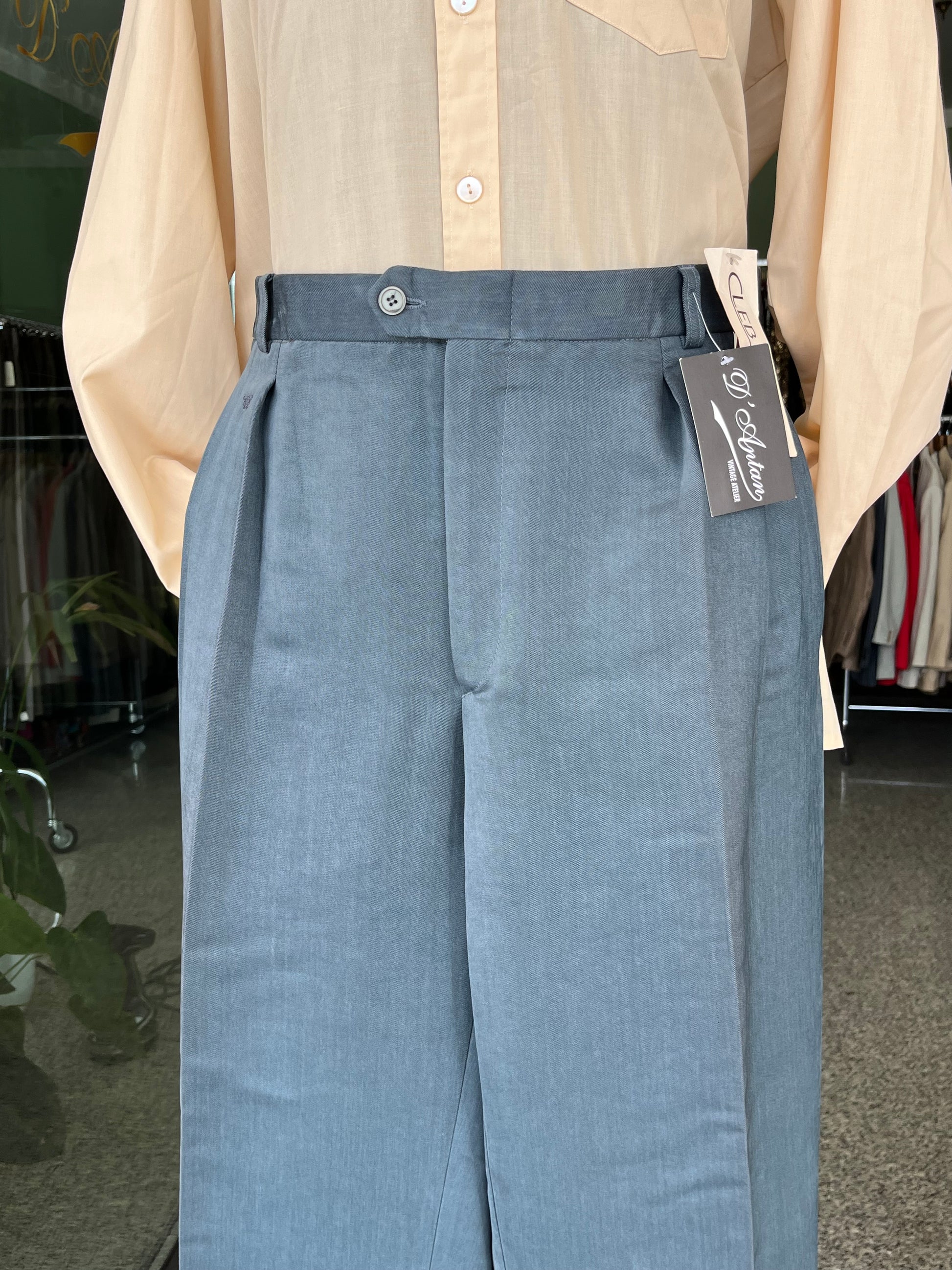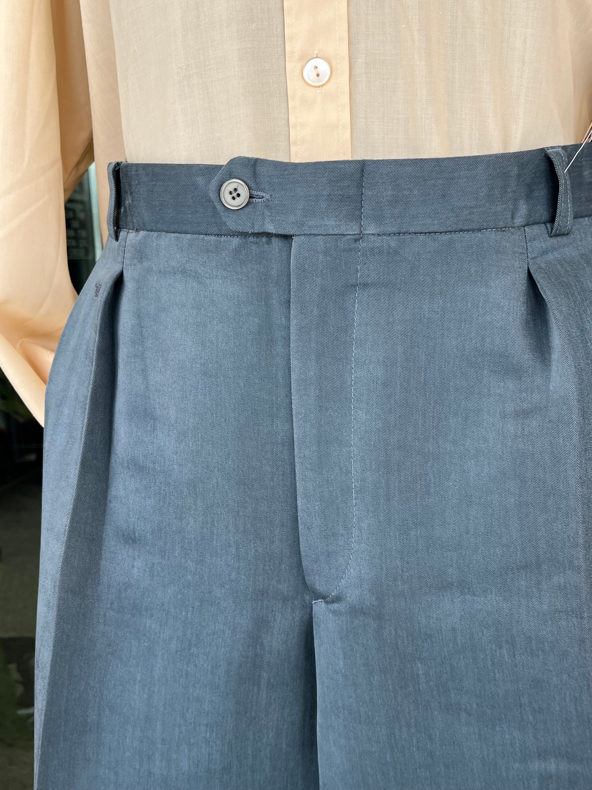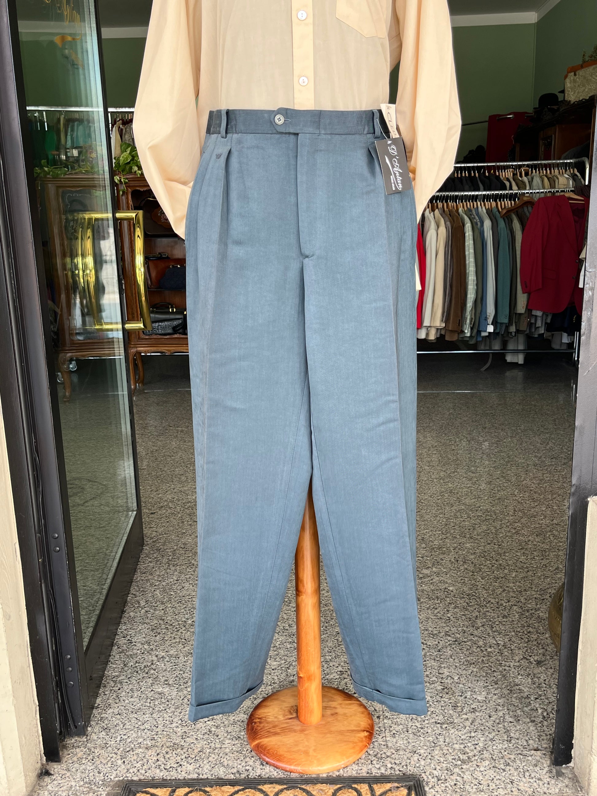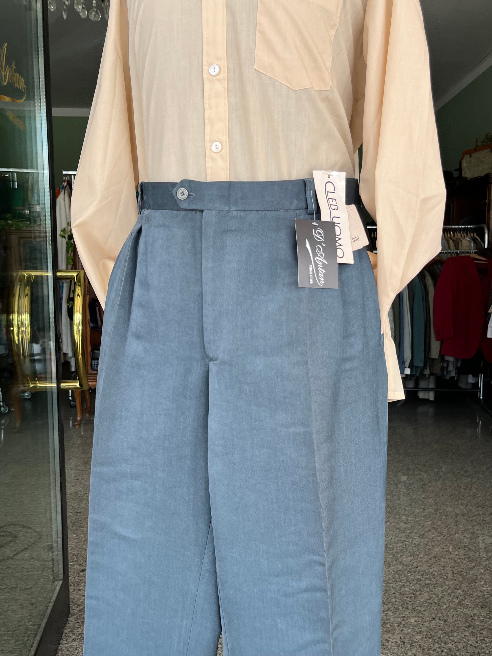 Calzoni anni ‘80 in velluto color ottanio chiaro.