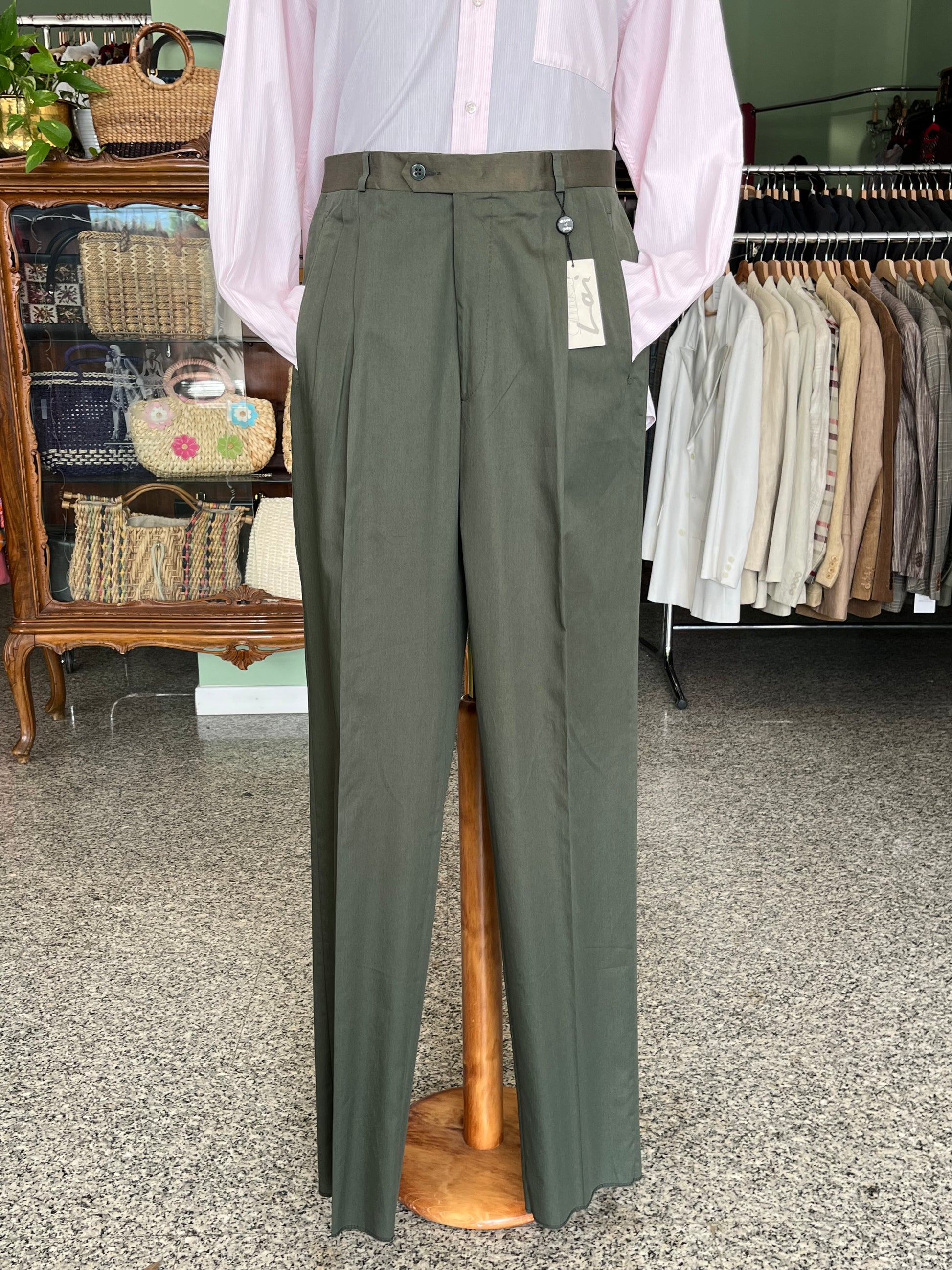 Calzoni anni ‘80 in 100% puro cotone, molto leggero, color verde oliva, con cinturino a contrasto.