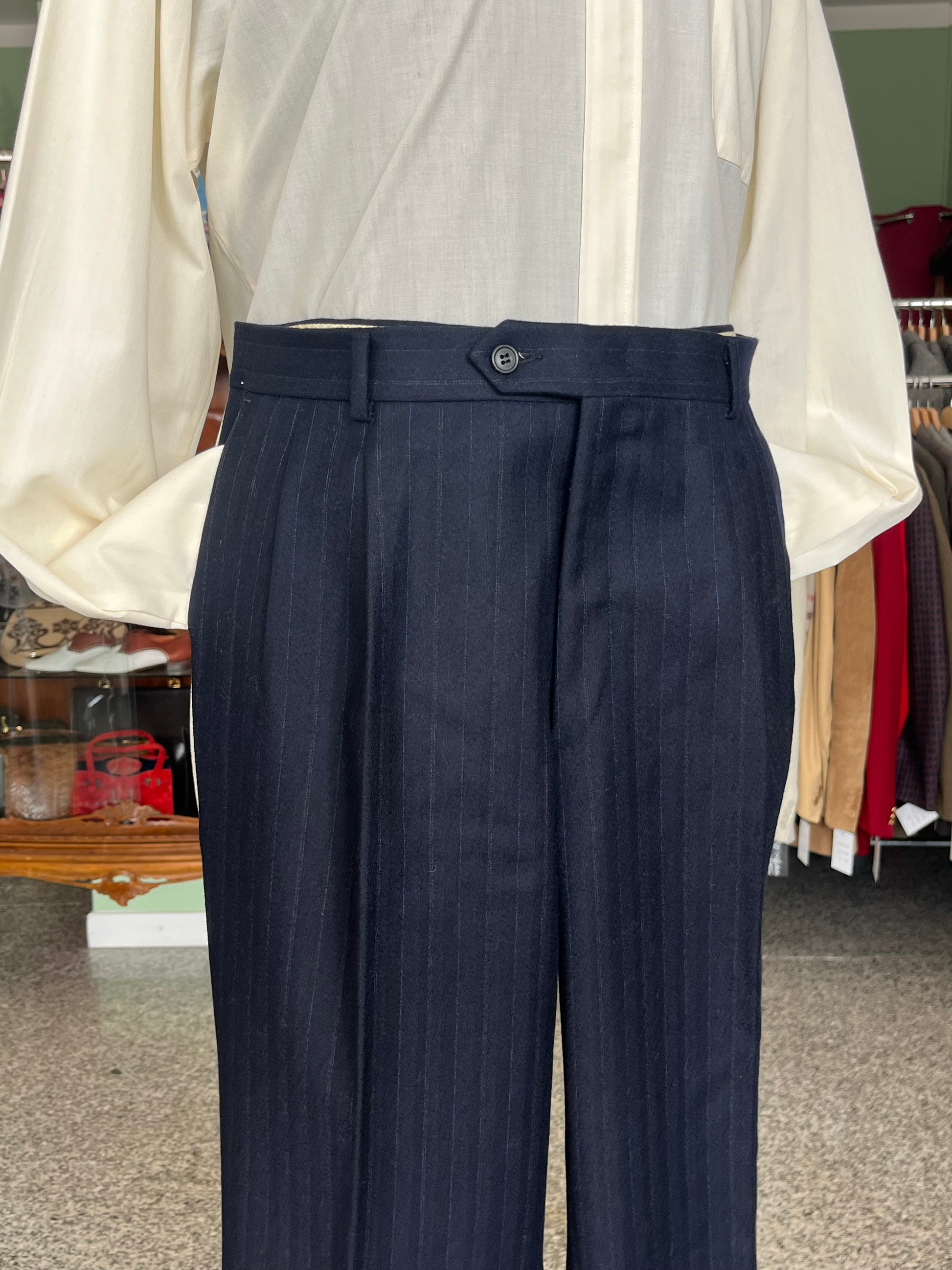 I pantaloni hanno un taglio classico, a vita alta, con doppia piega in vita e taglio amojo.