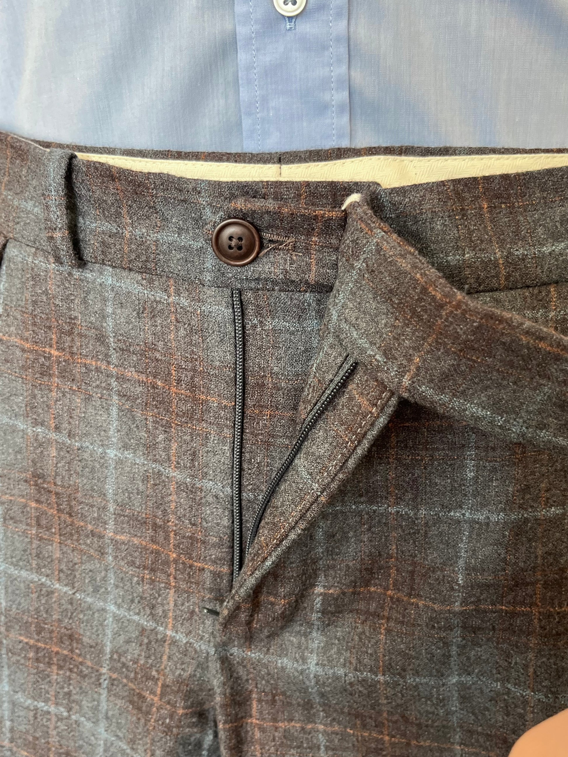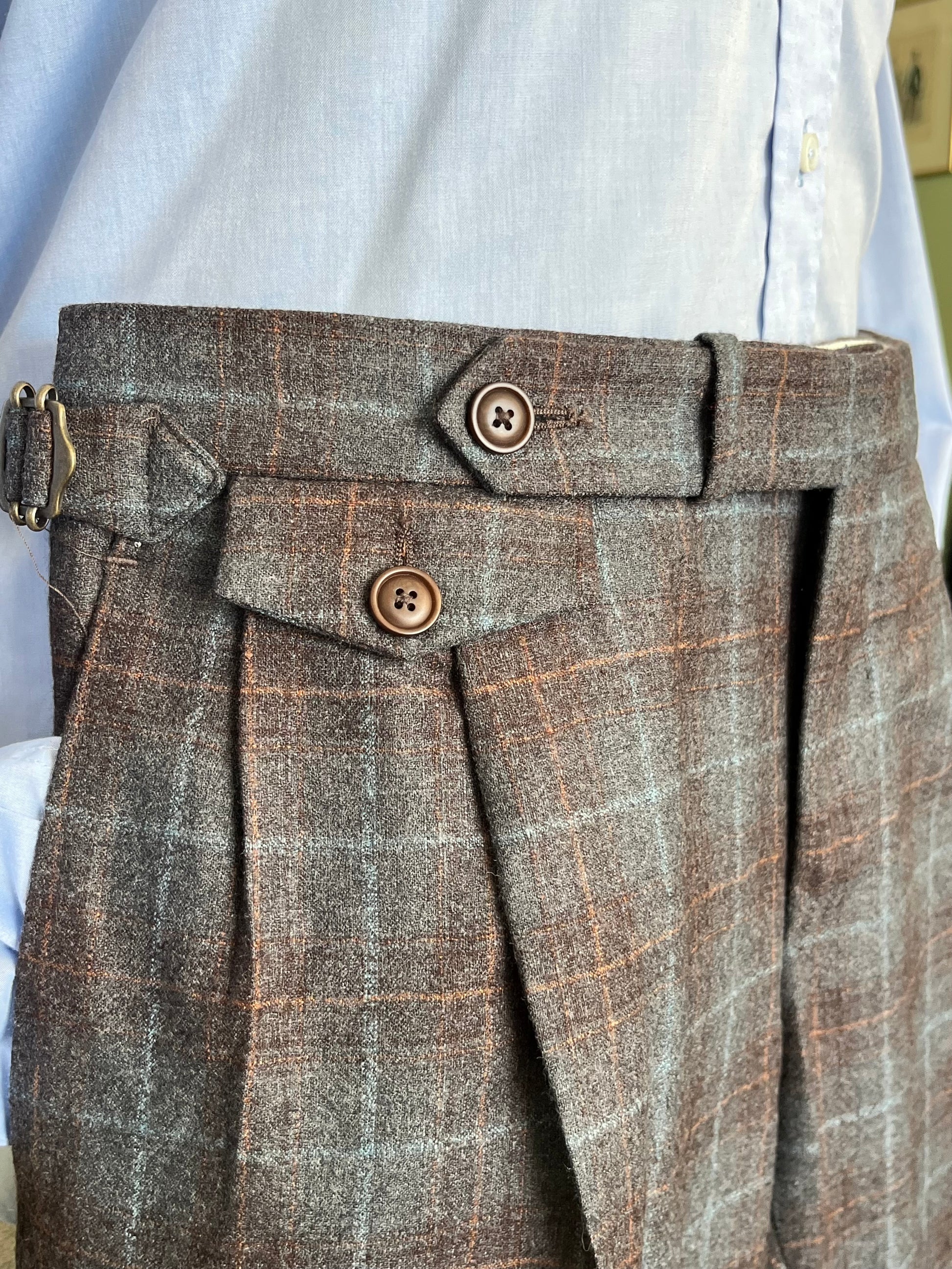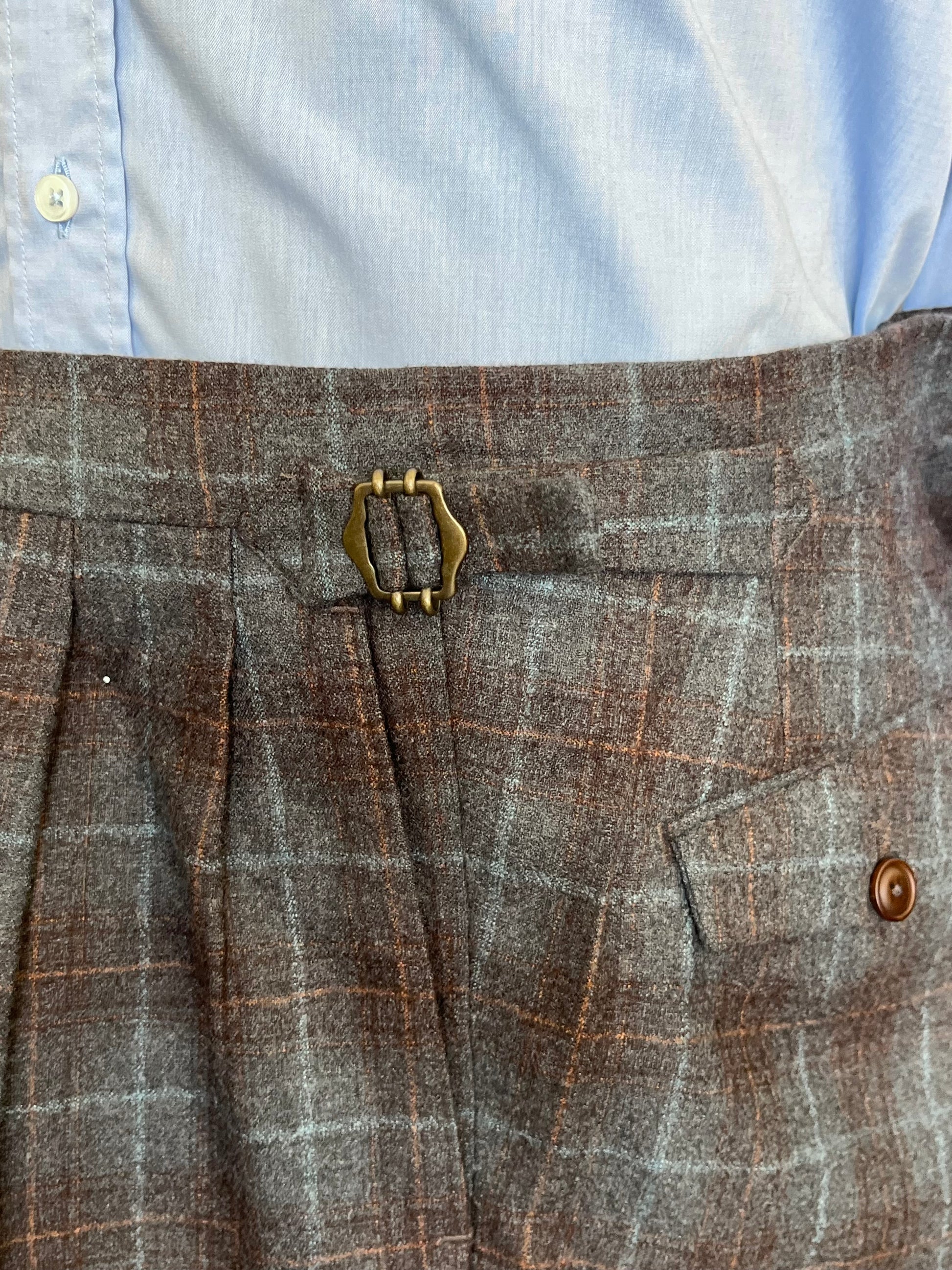 Calzoni anni 2000 in 100% pura lana, sui toni del marrone e del celeste.