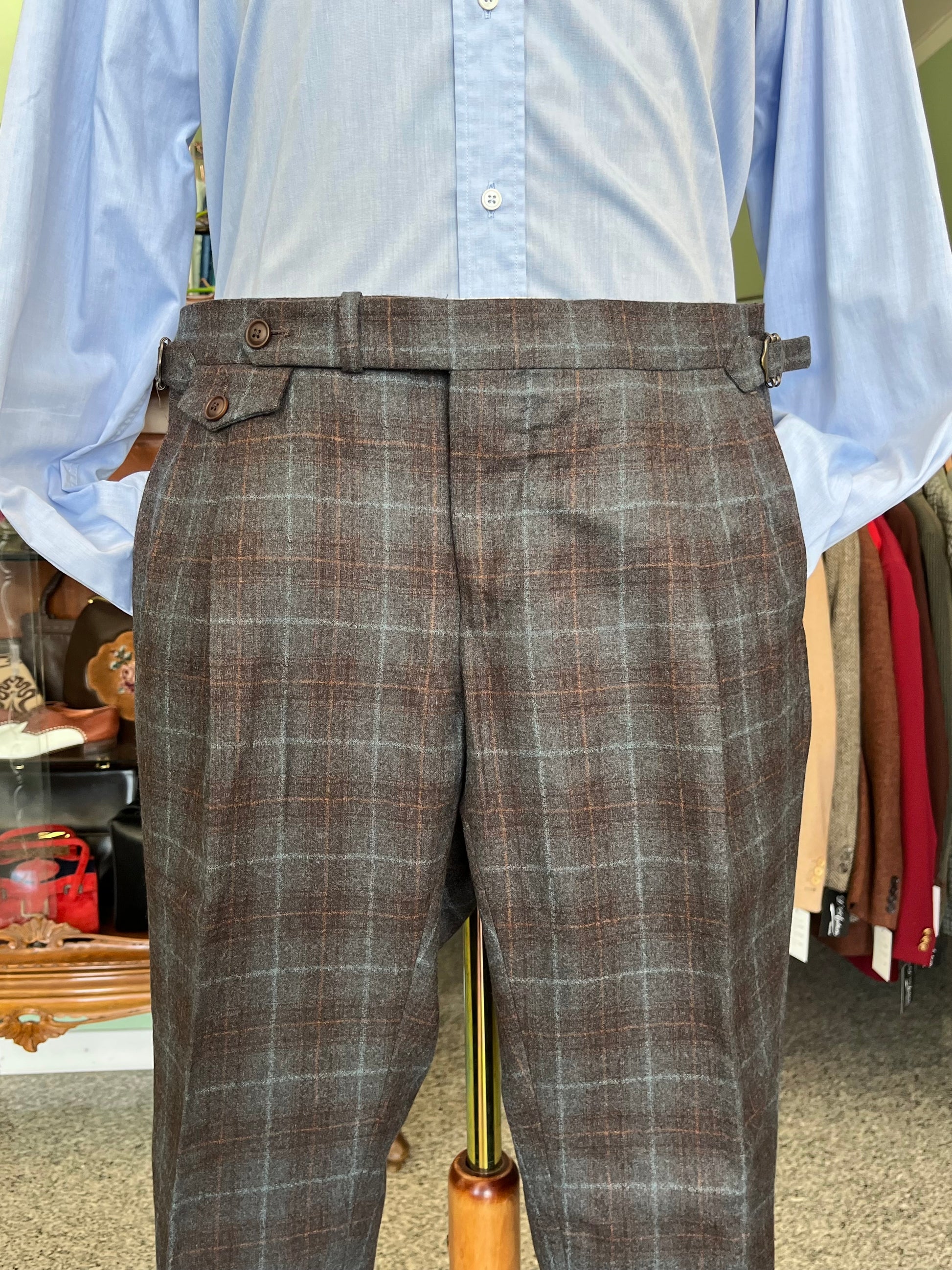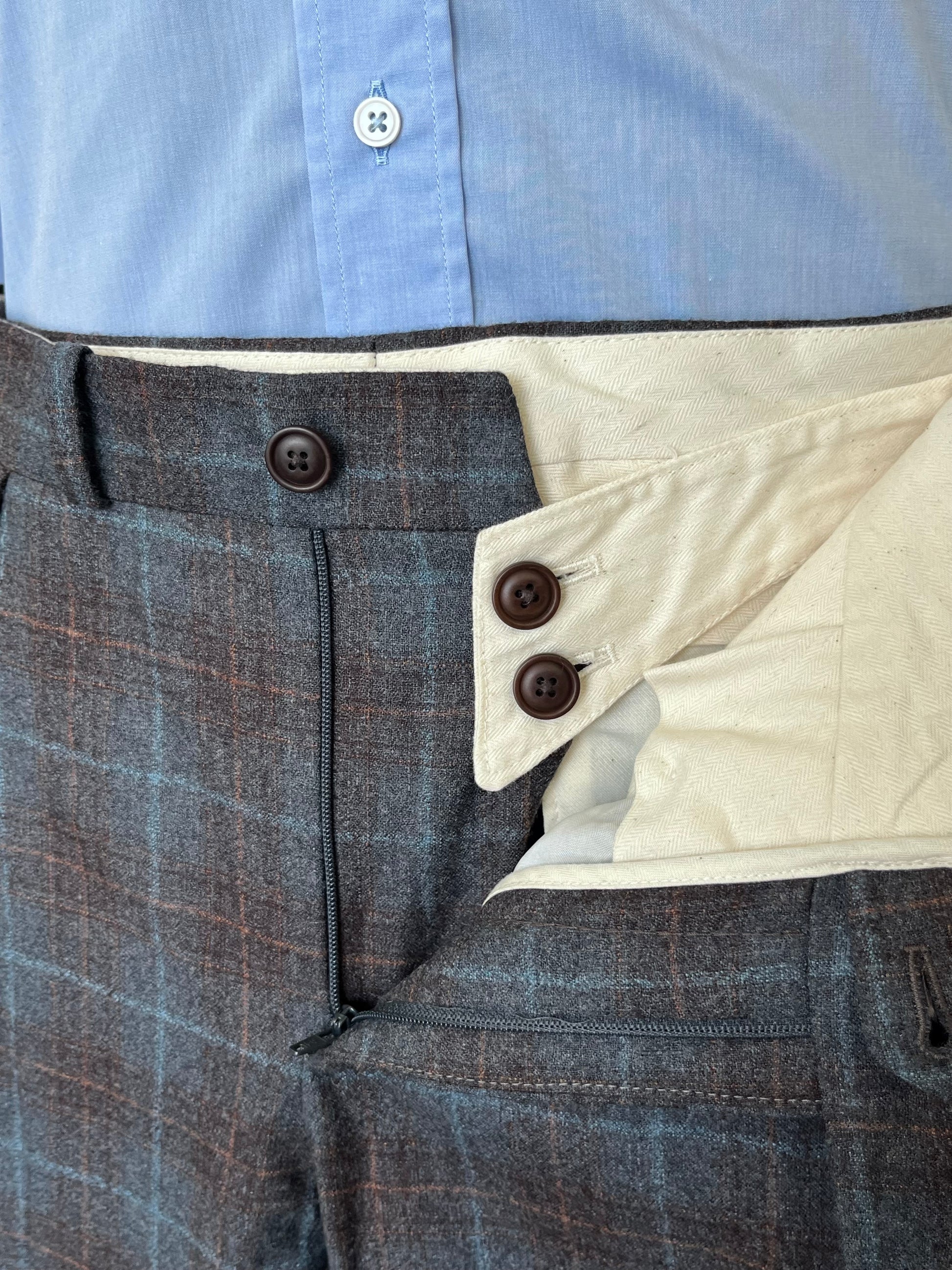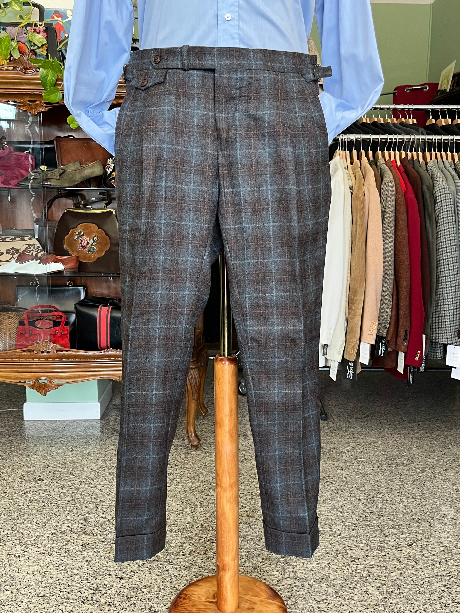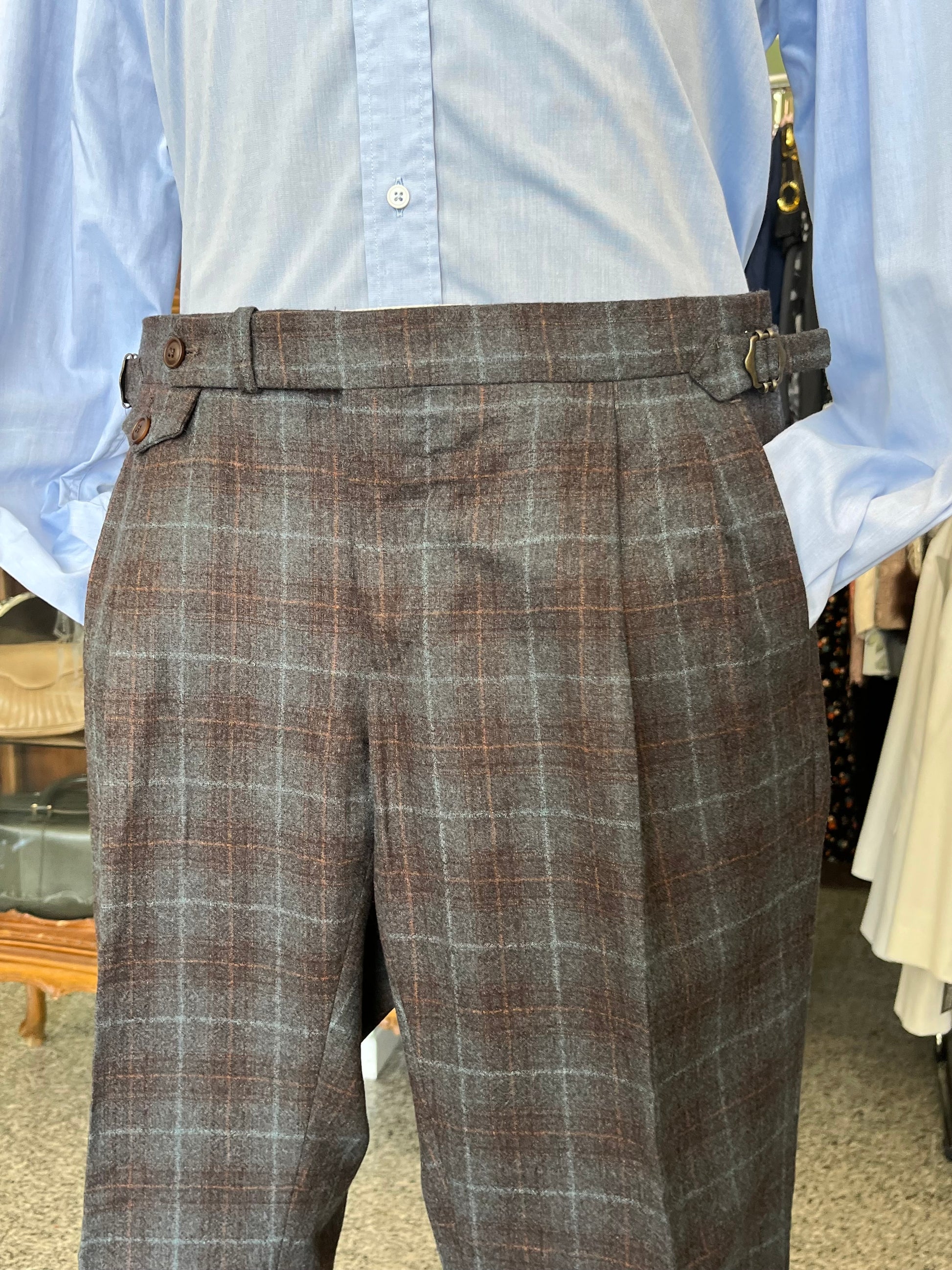 Calzoni anni 2000 in 100% pura lana, sui toni del marrone e del celeste.