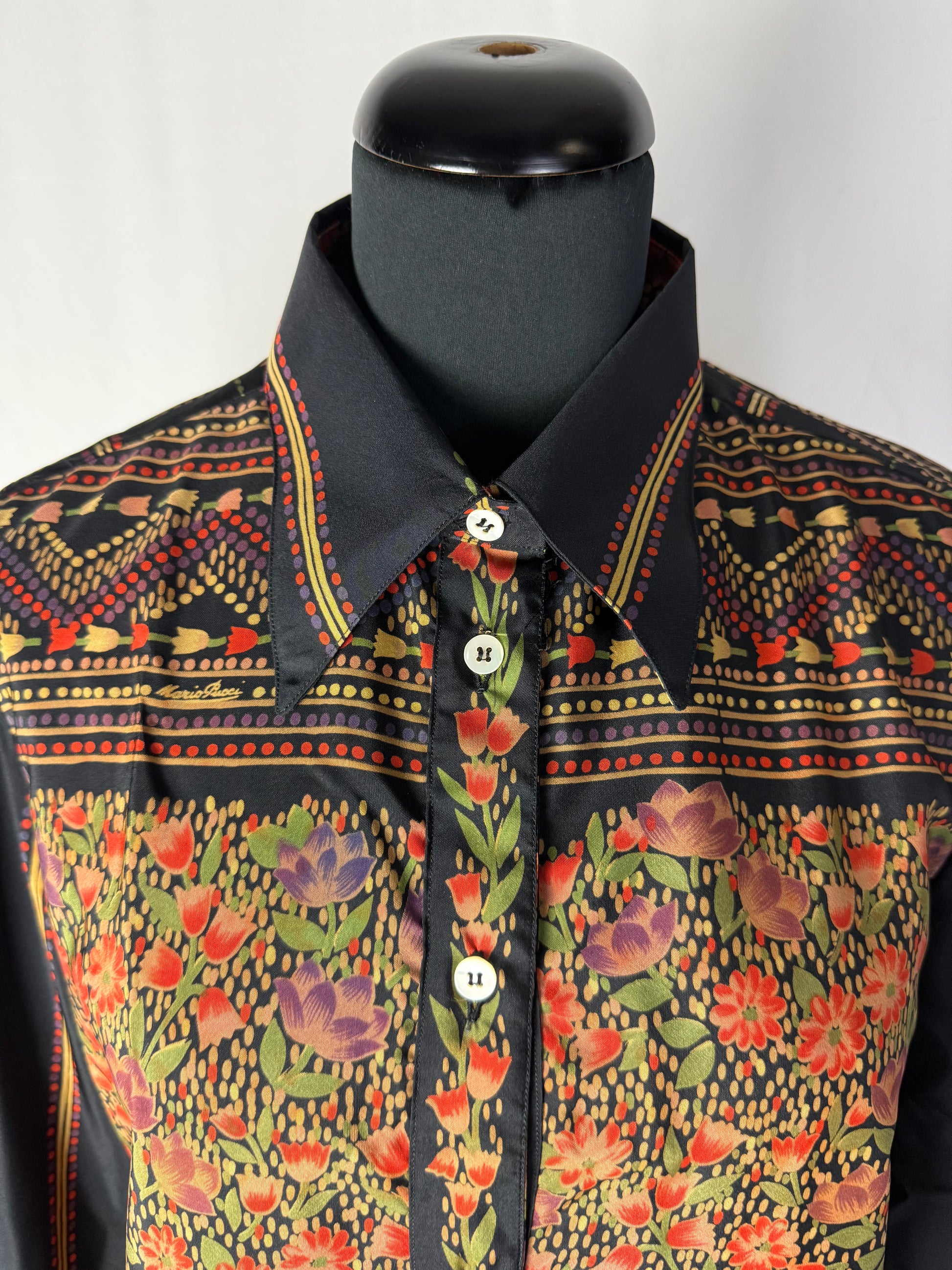Camicia anni ‘70 in seta e viscosa, con fantasia floreale sui toni caldi della terra. Colletto a punte lunghe, tipico dell’epoca.