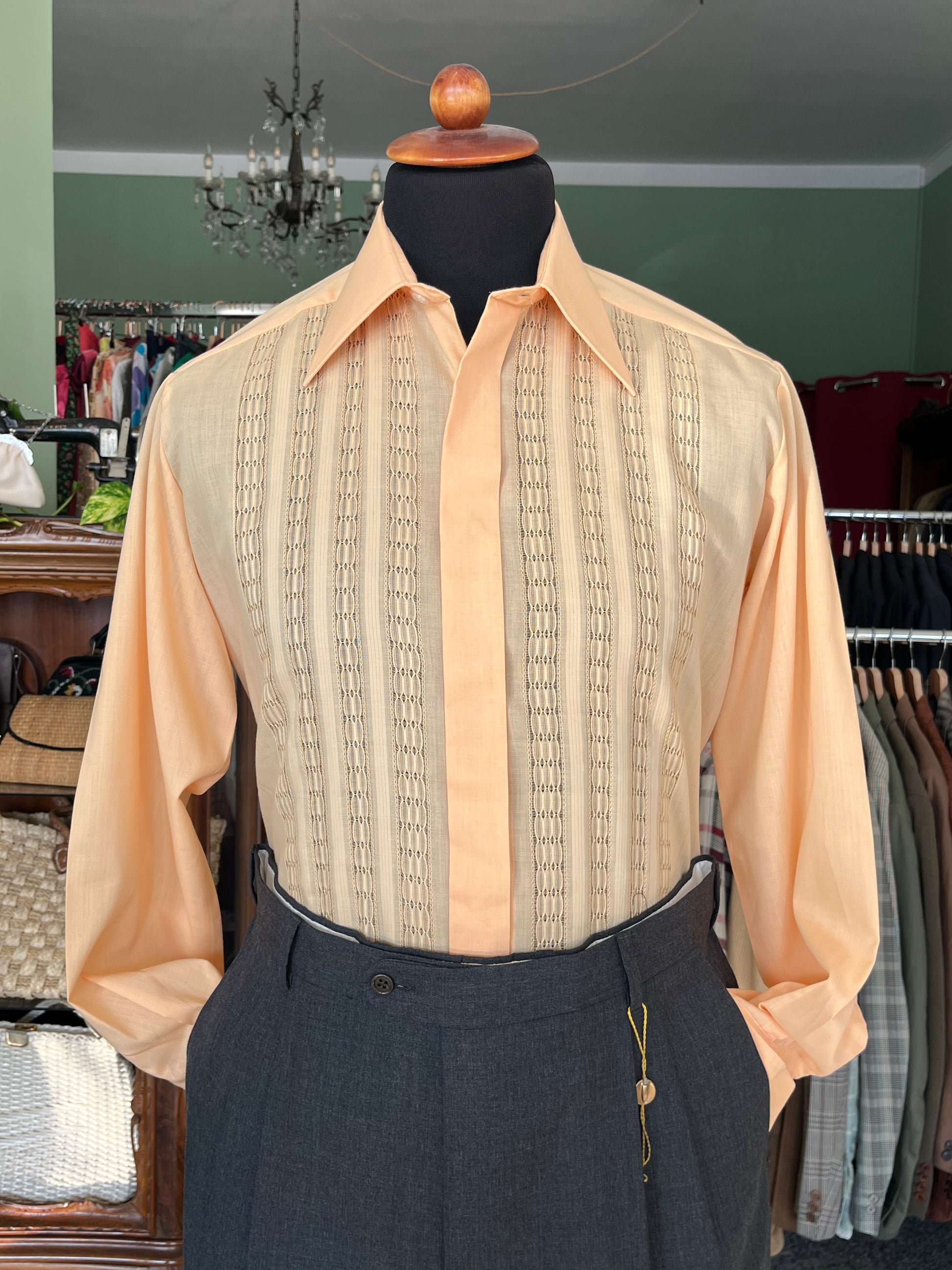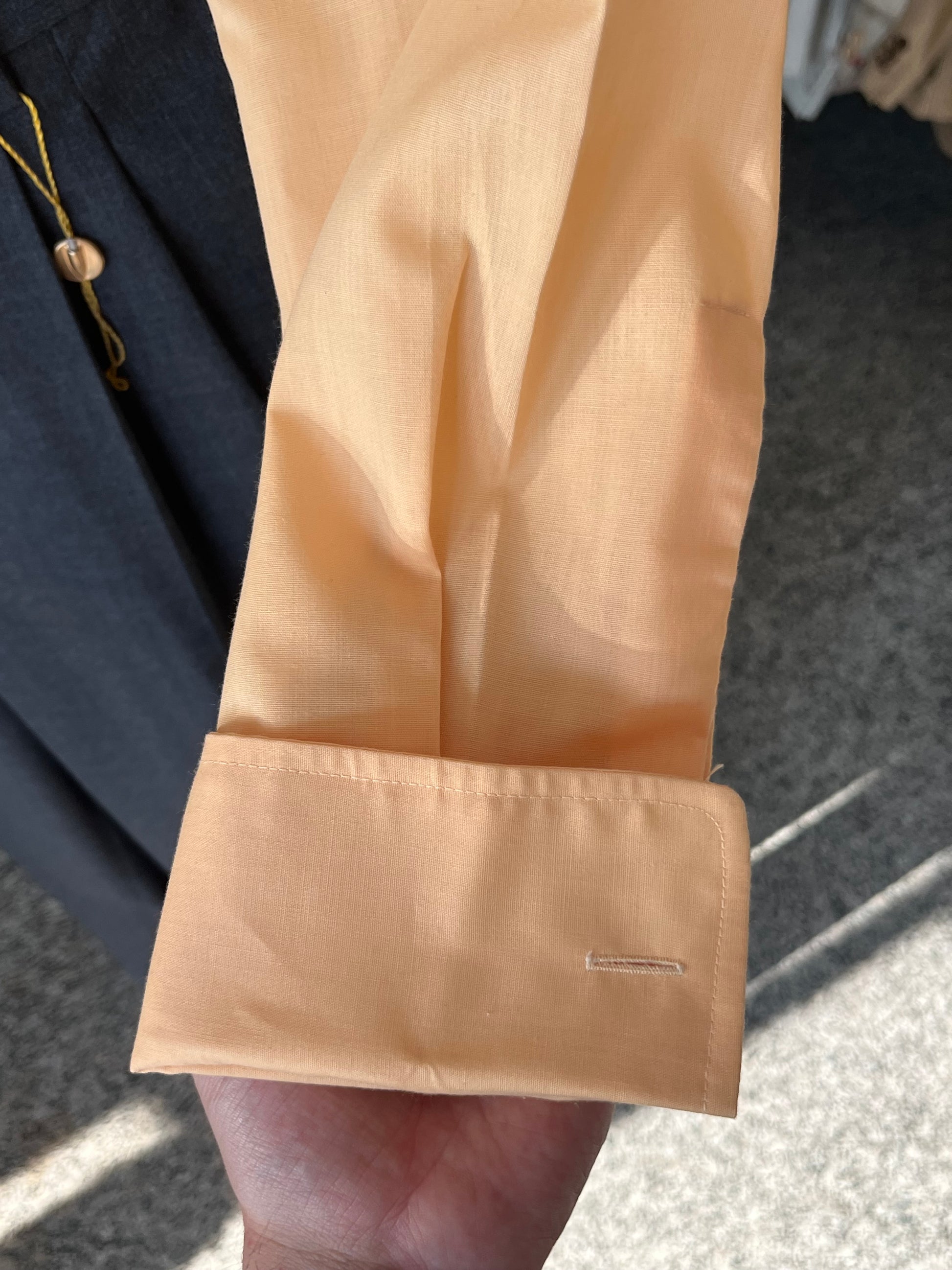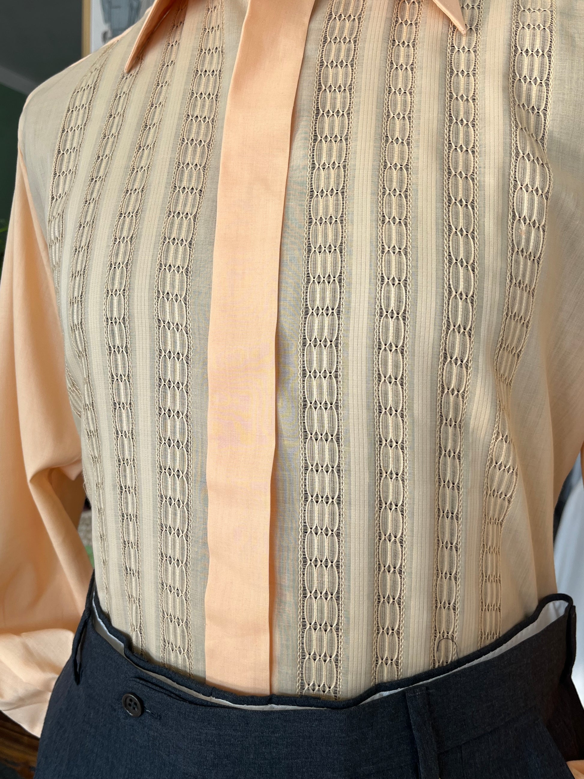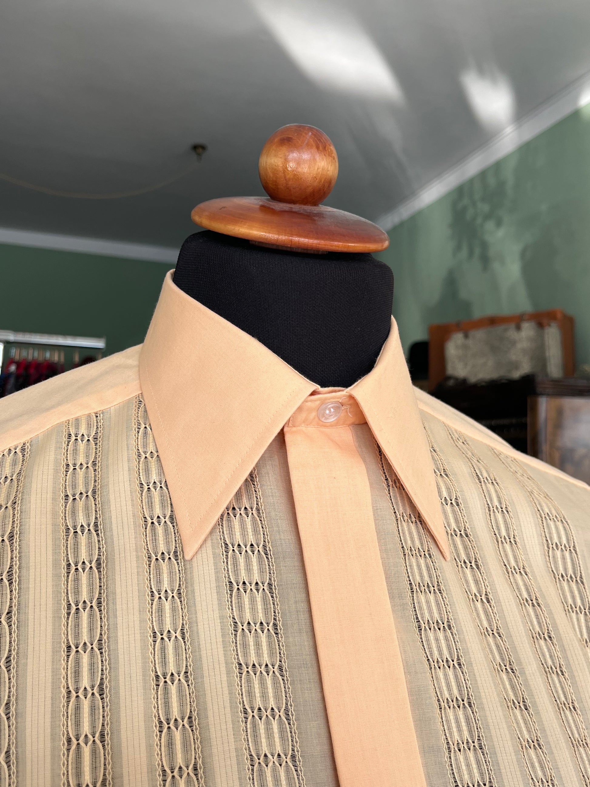 Di colore pesca, con collo a vele lunghissime (iconiche dell’epoca), sparato con particolarissima lavorazione traforata (che crea trasparenza) e polsino alla francese (doppio).