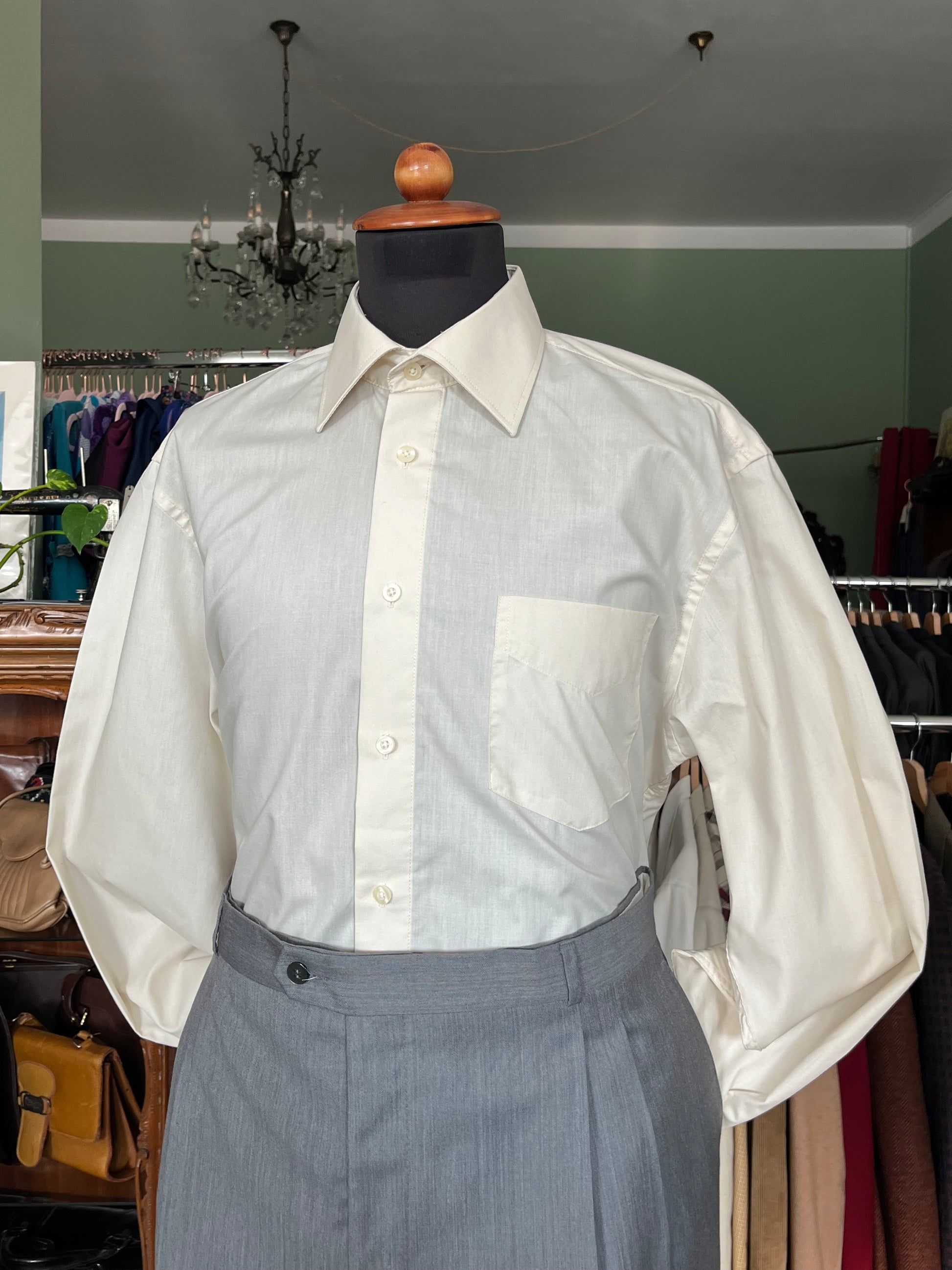 Di colore crema, con collo semi-francese a vele lunghe e polsino doppio utilizzo (abbottonato e gemelli).