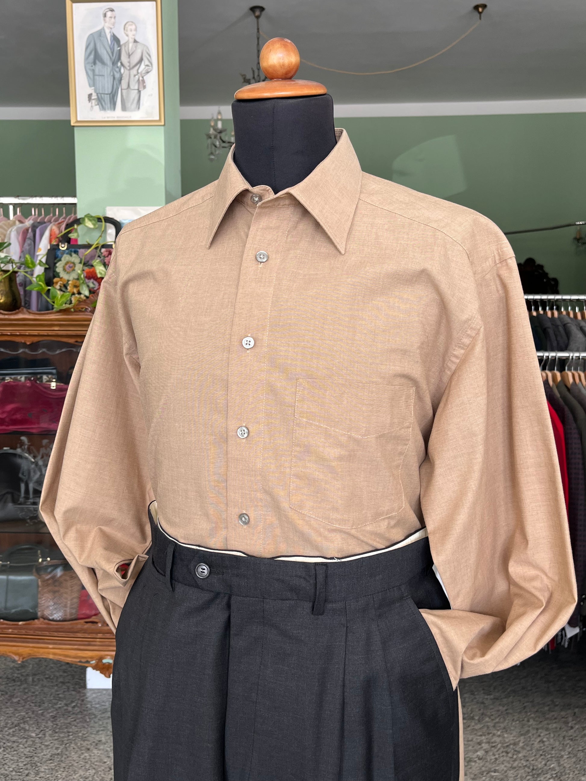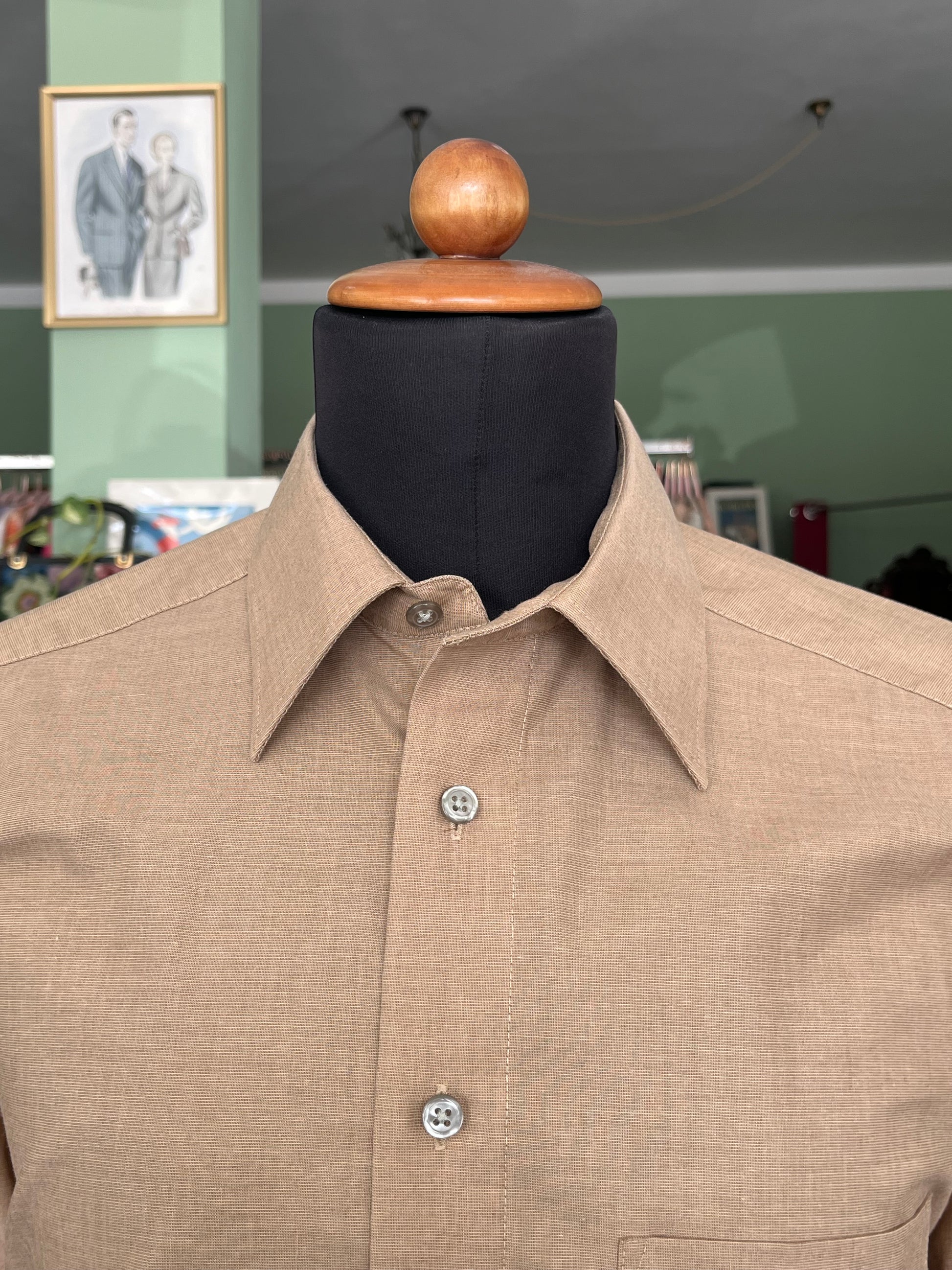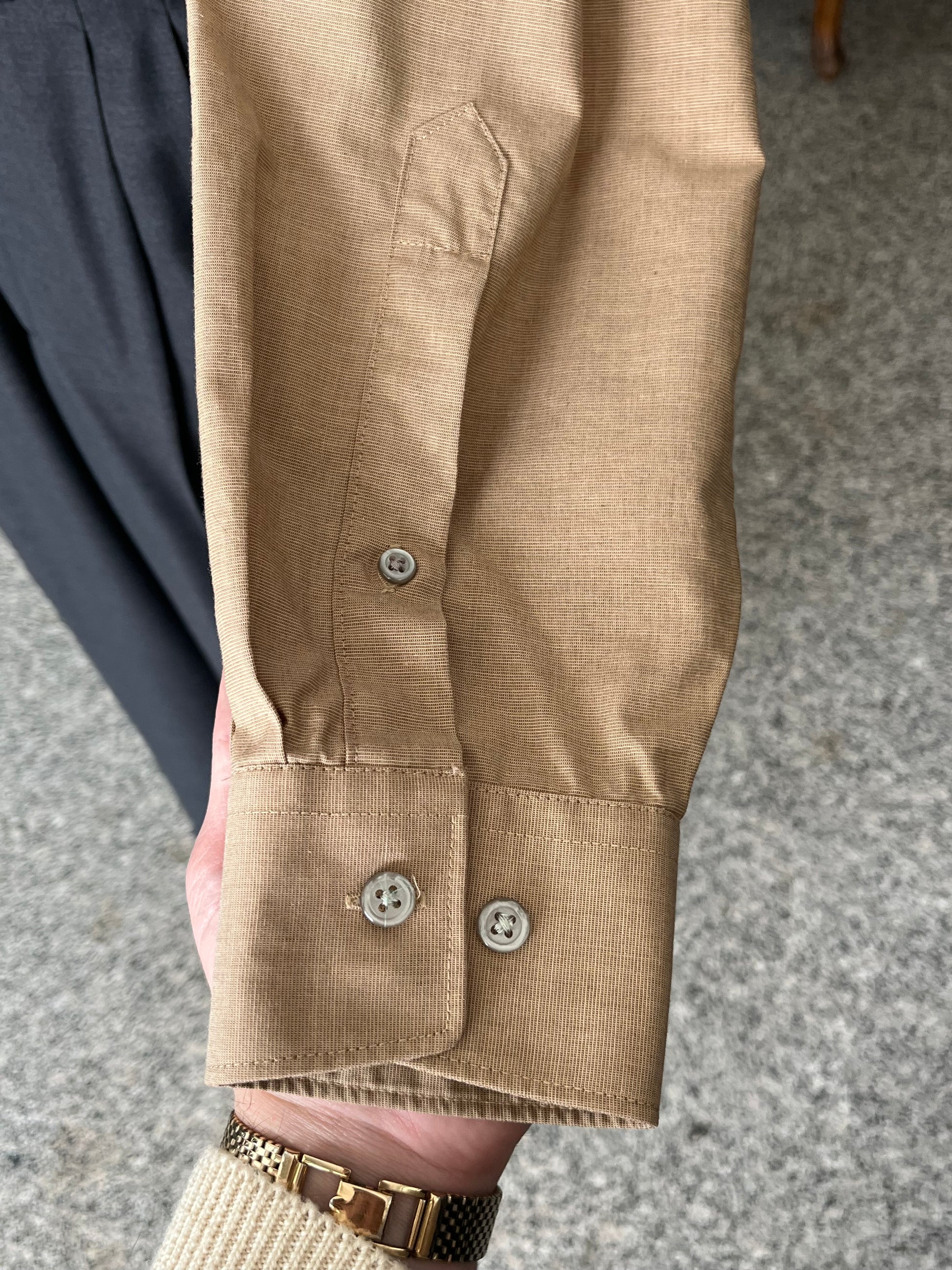 Di colore biscotto tinta unita, con collo all‘italiana, taschino sul petto e polsino abbottonato.