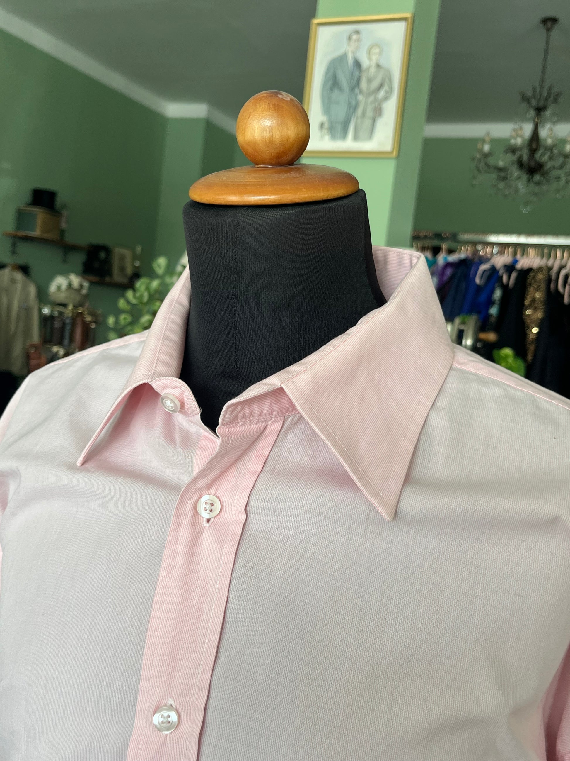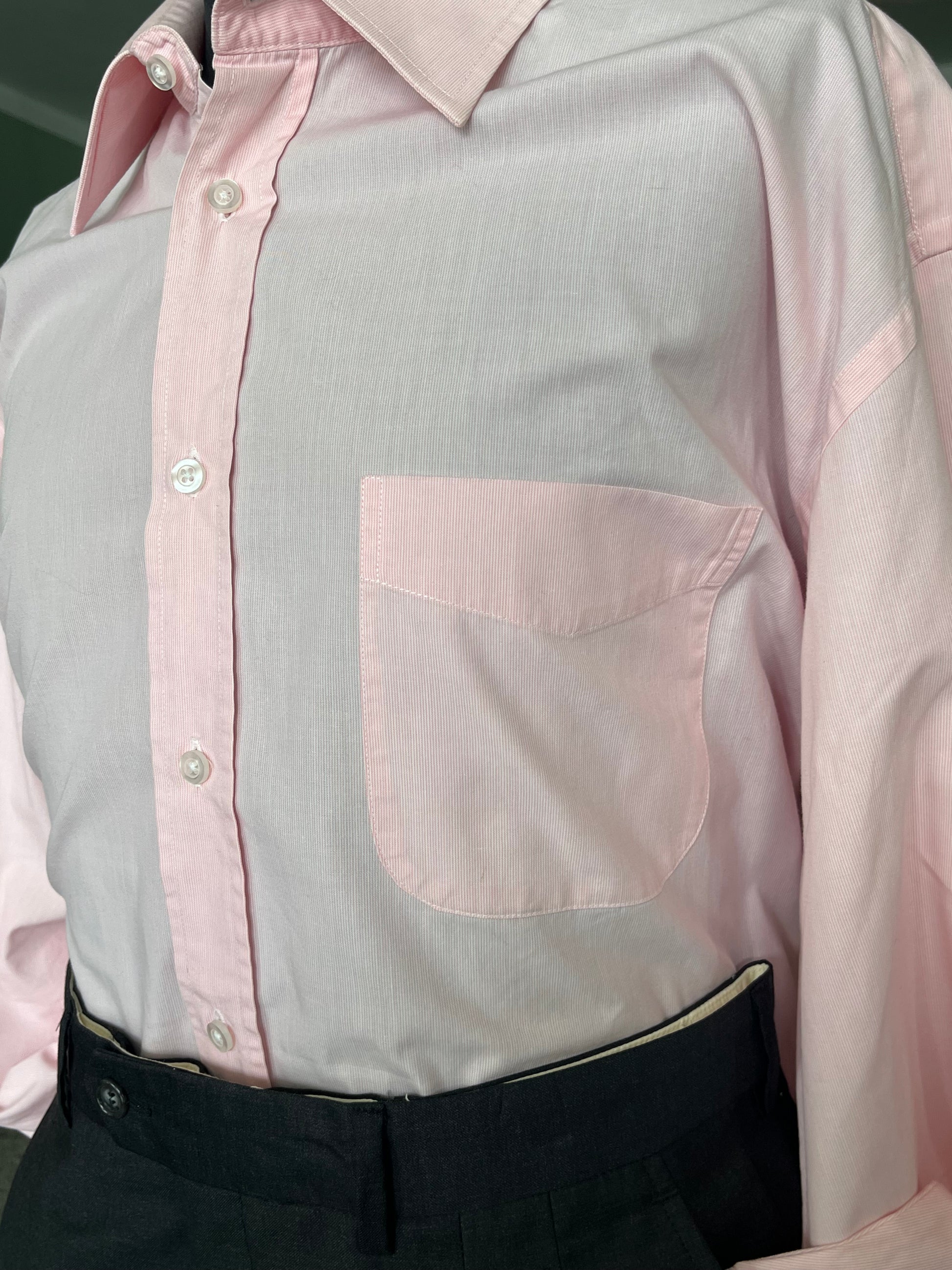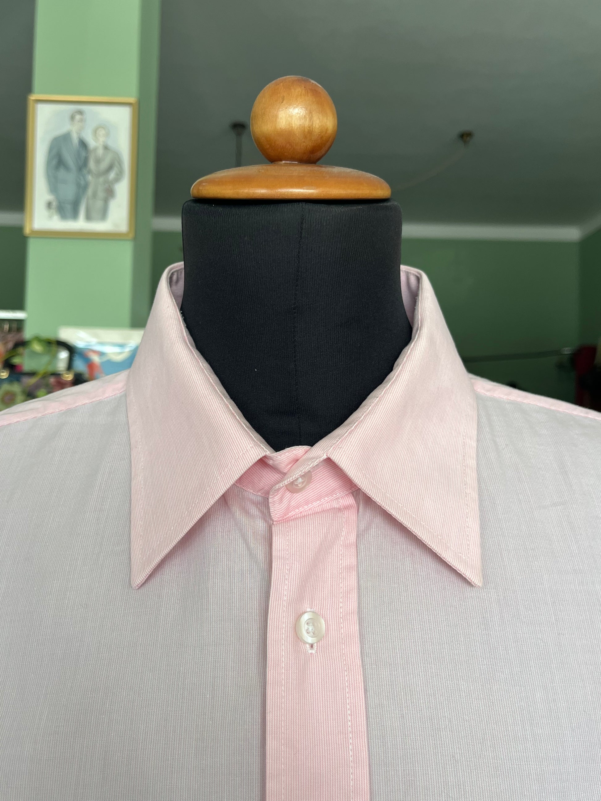 Di colore rosa e bianco a righe, con collo all‘italiana, taschino sul petto e polsino abbottonato.
