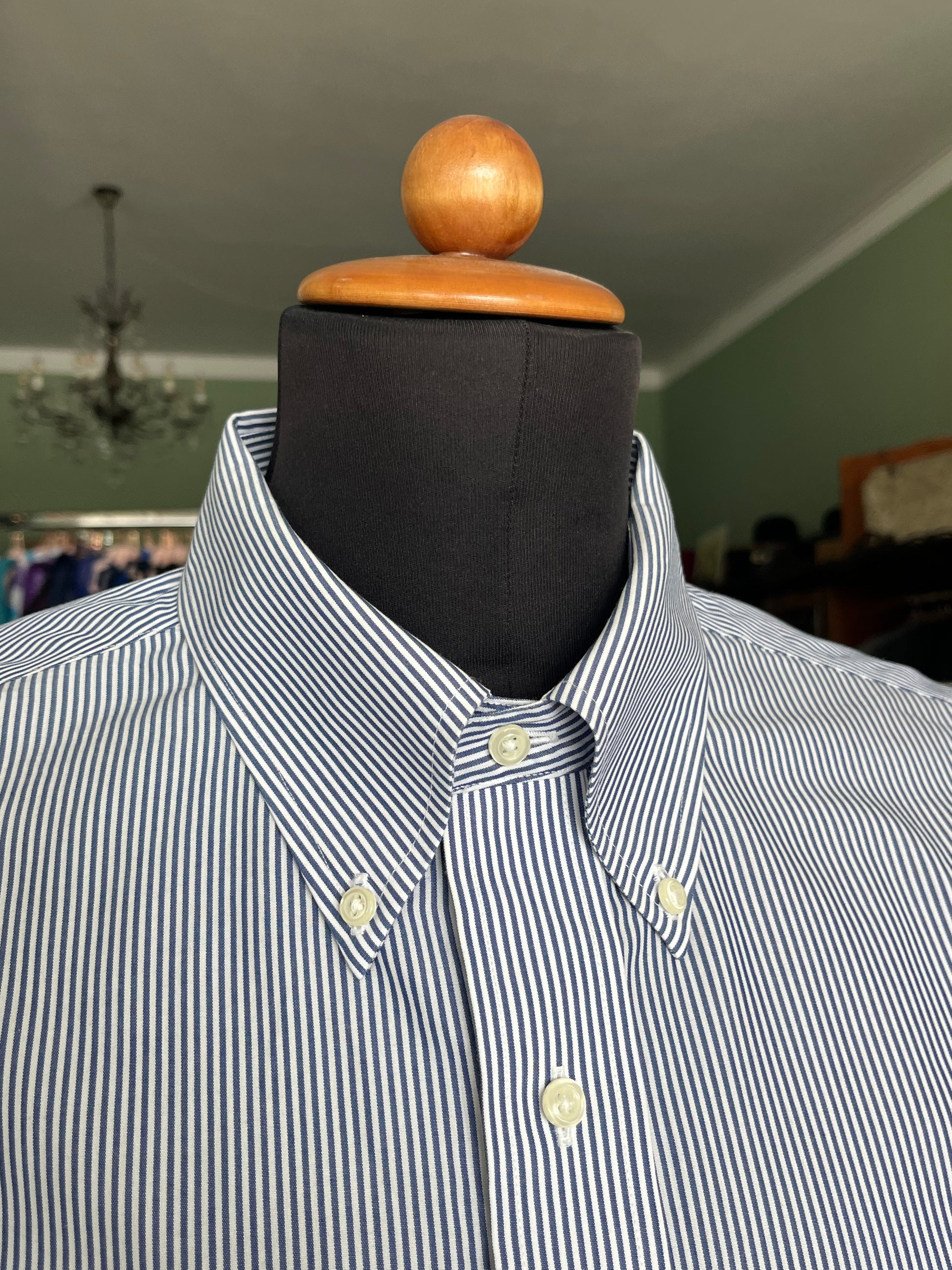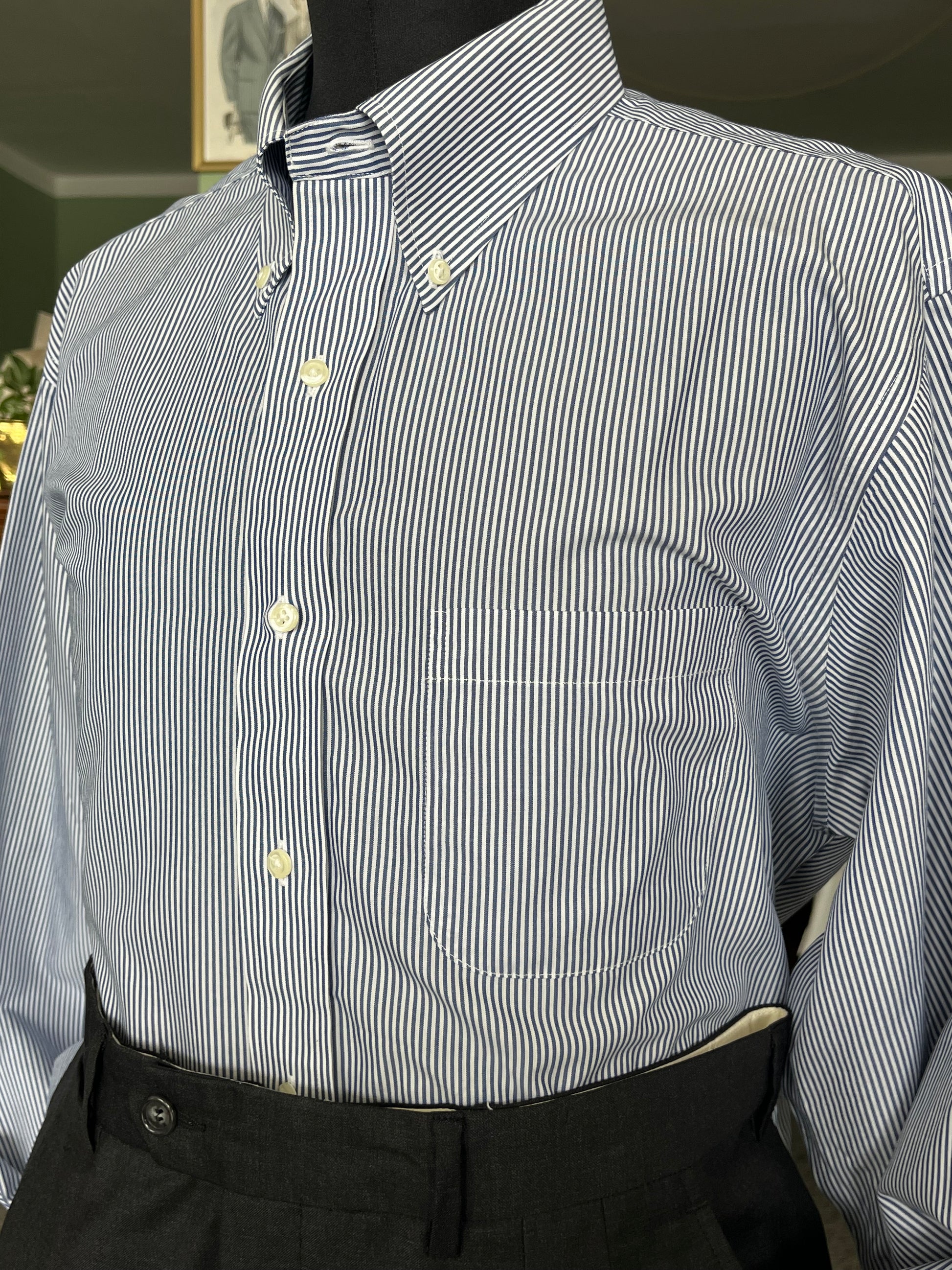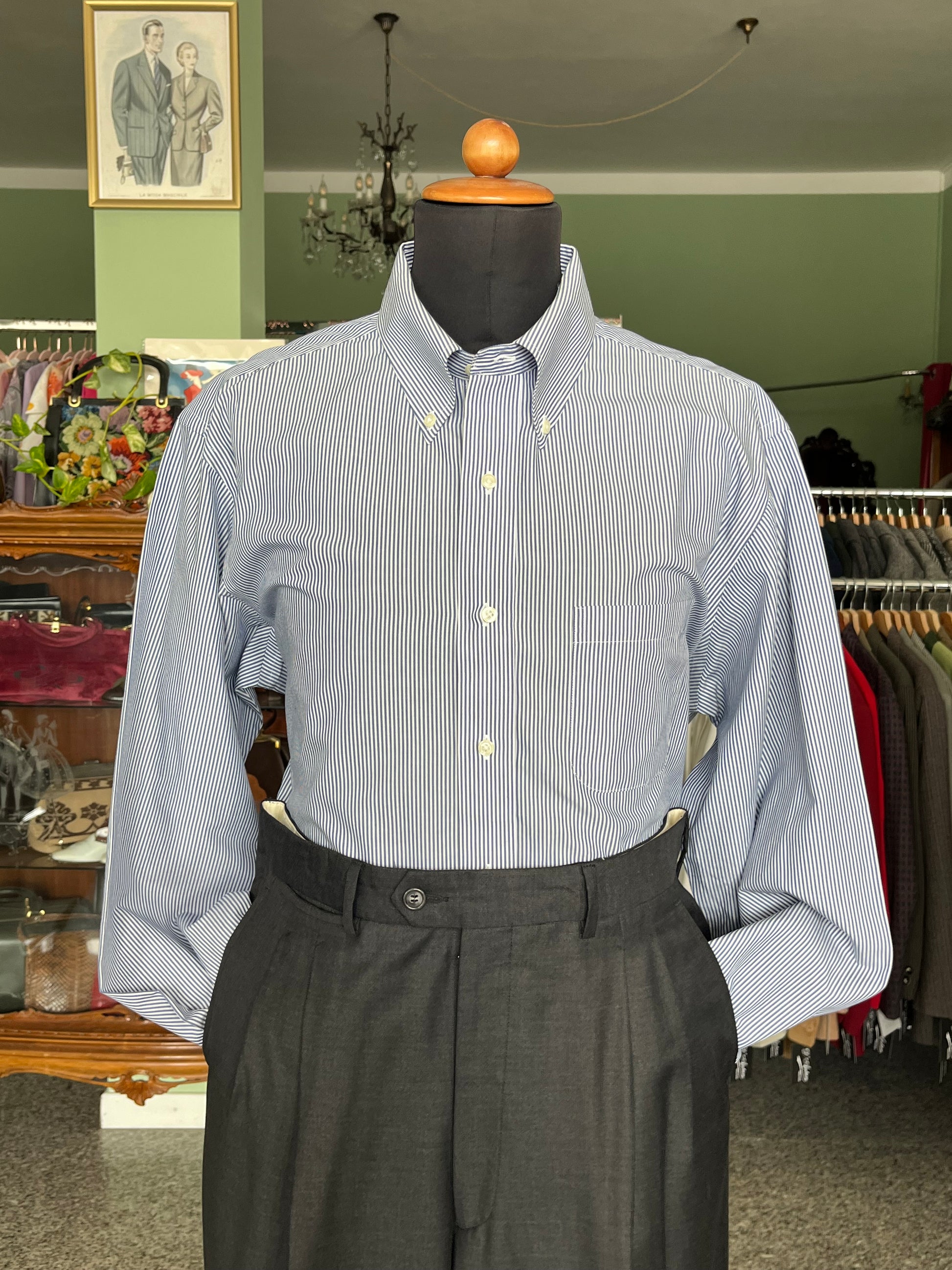 Di colore blu e bianco a righe, con collo abbottonato (button-down), taschino sul petto e polsino abbottonato.