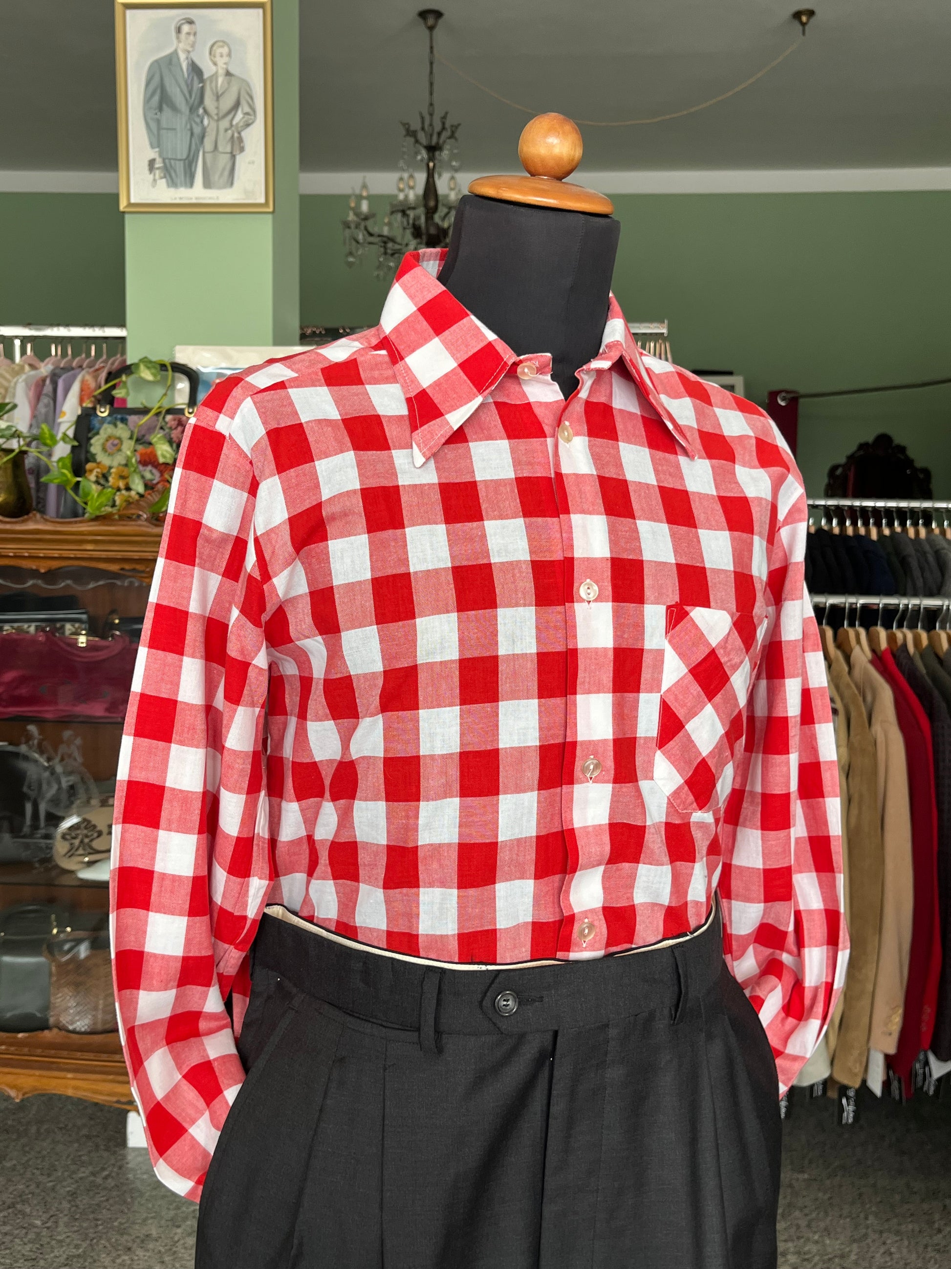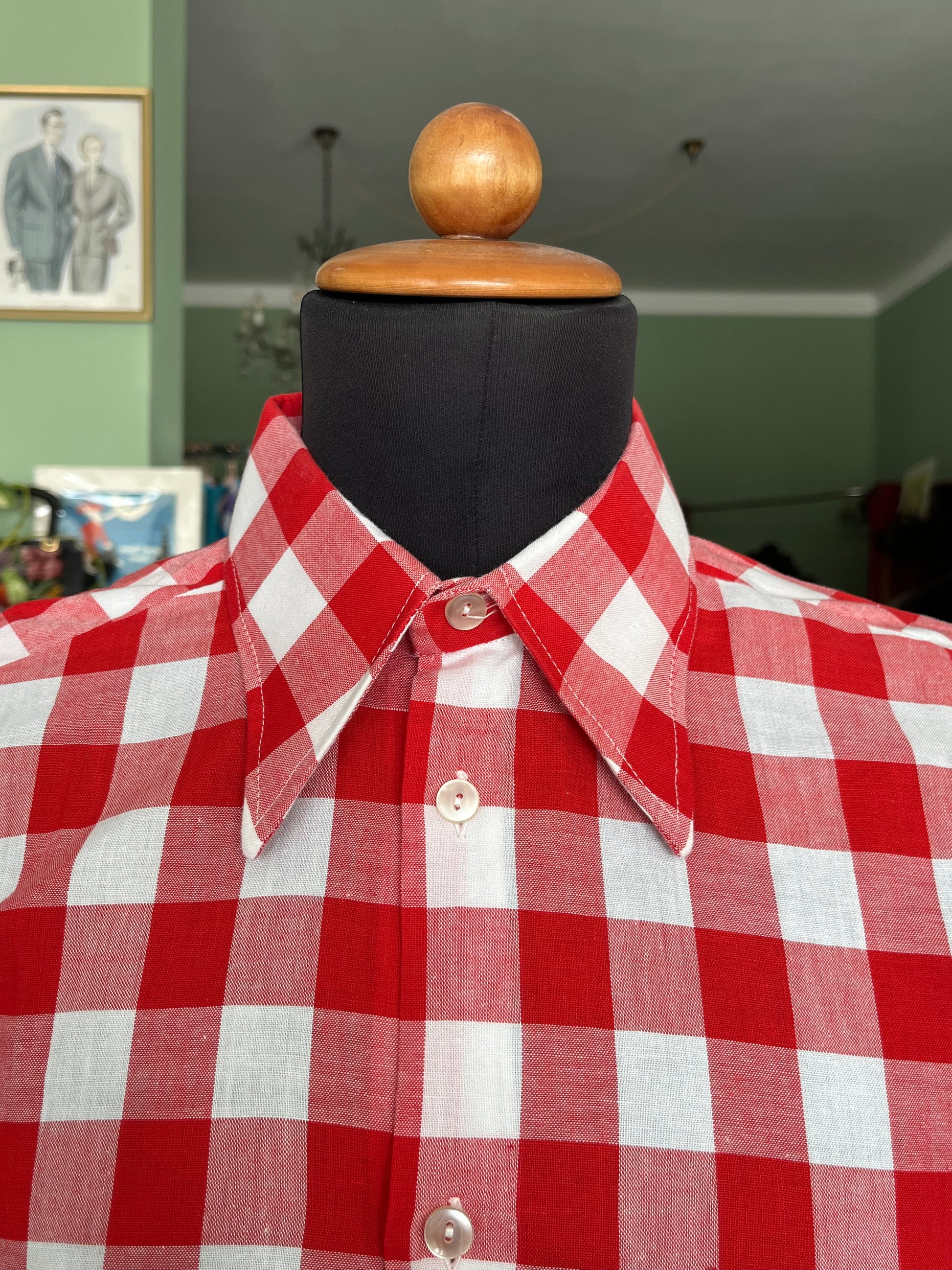 Di colore rosso e bianco a quadri, con collo a vele lunghe (come era in voga all’epoca), taschino sul petto e polsino abbottonato.
