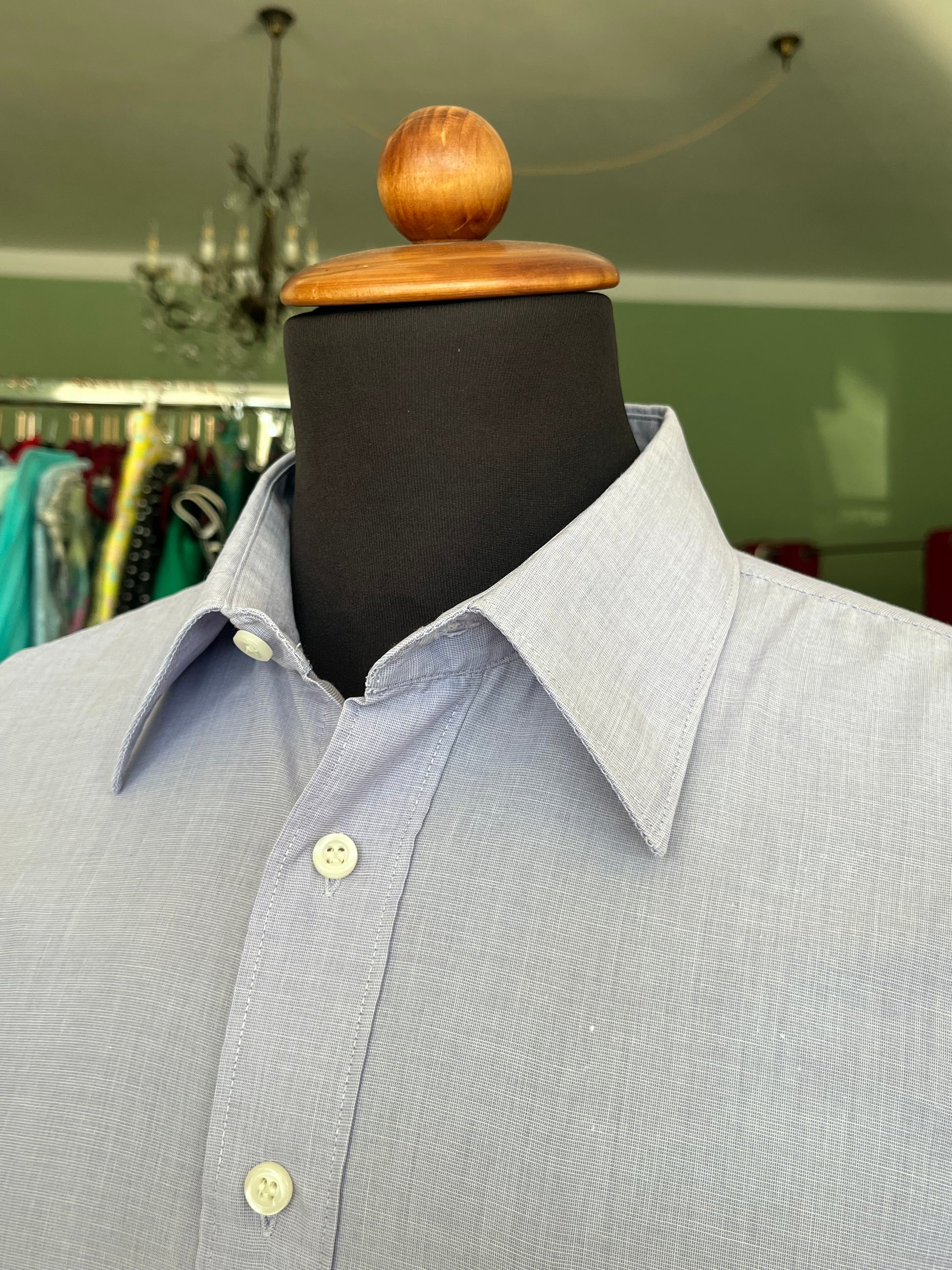 Di colore celeste, con collo con all’italiana, taschino sul petto e polsino abbottonato.