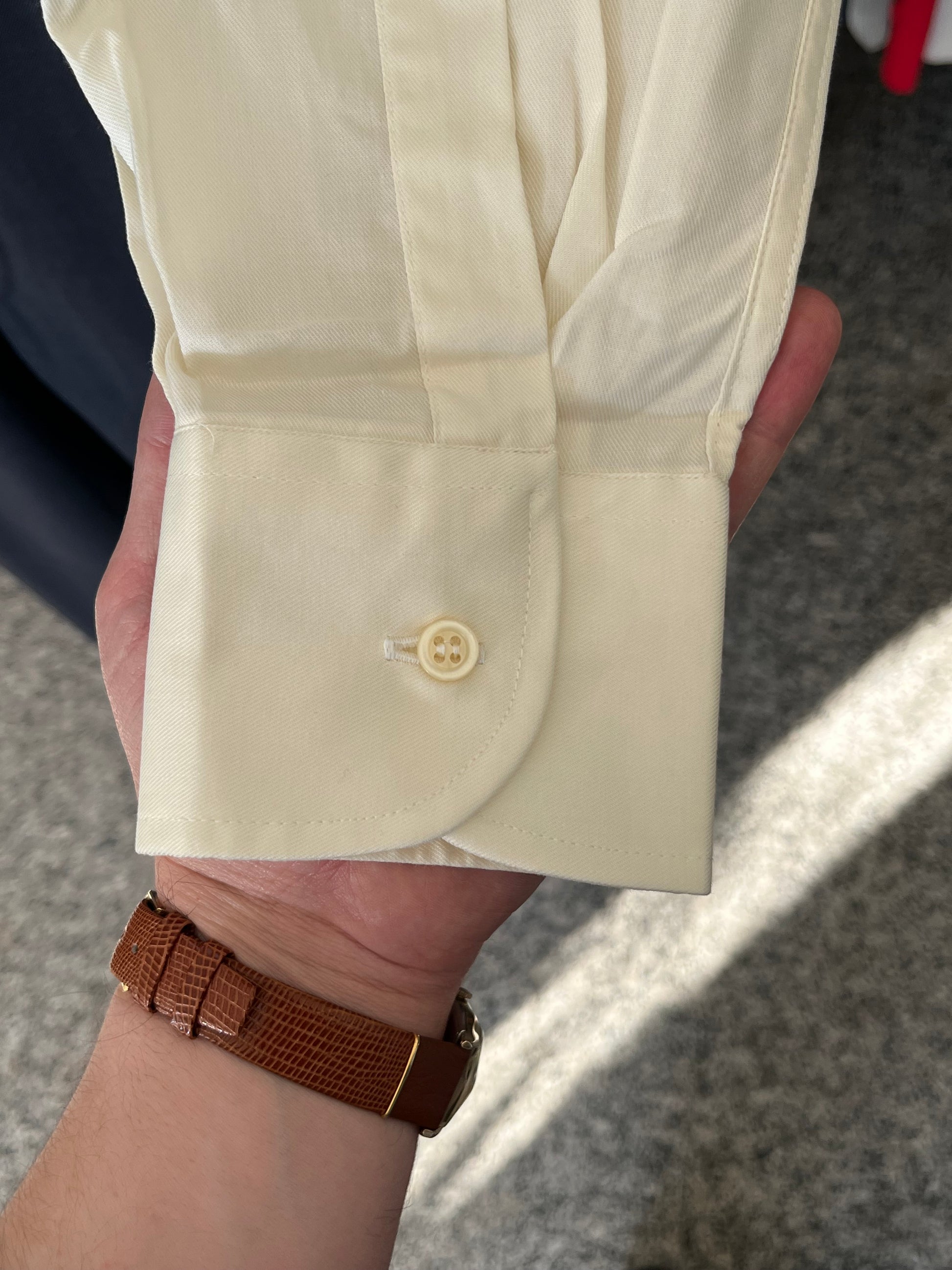 Di colore burro, con collo con all’italiana, taschino sul petto e polsino abbottonato.