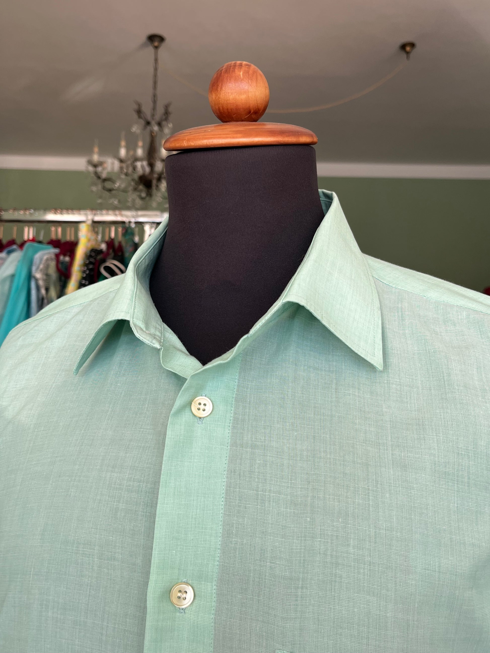 Di colore menta, con collo con all’italiana, taschino sul petto e polsino abbottonato.