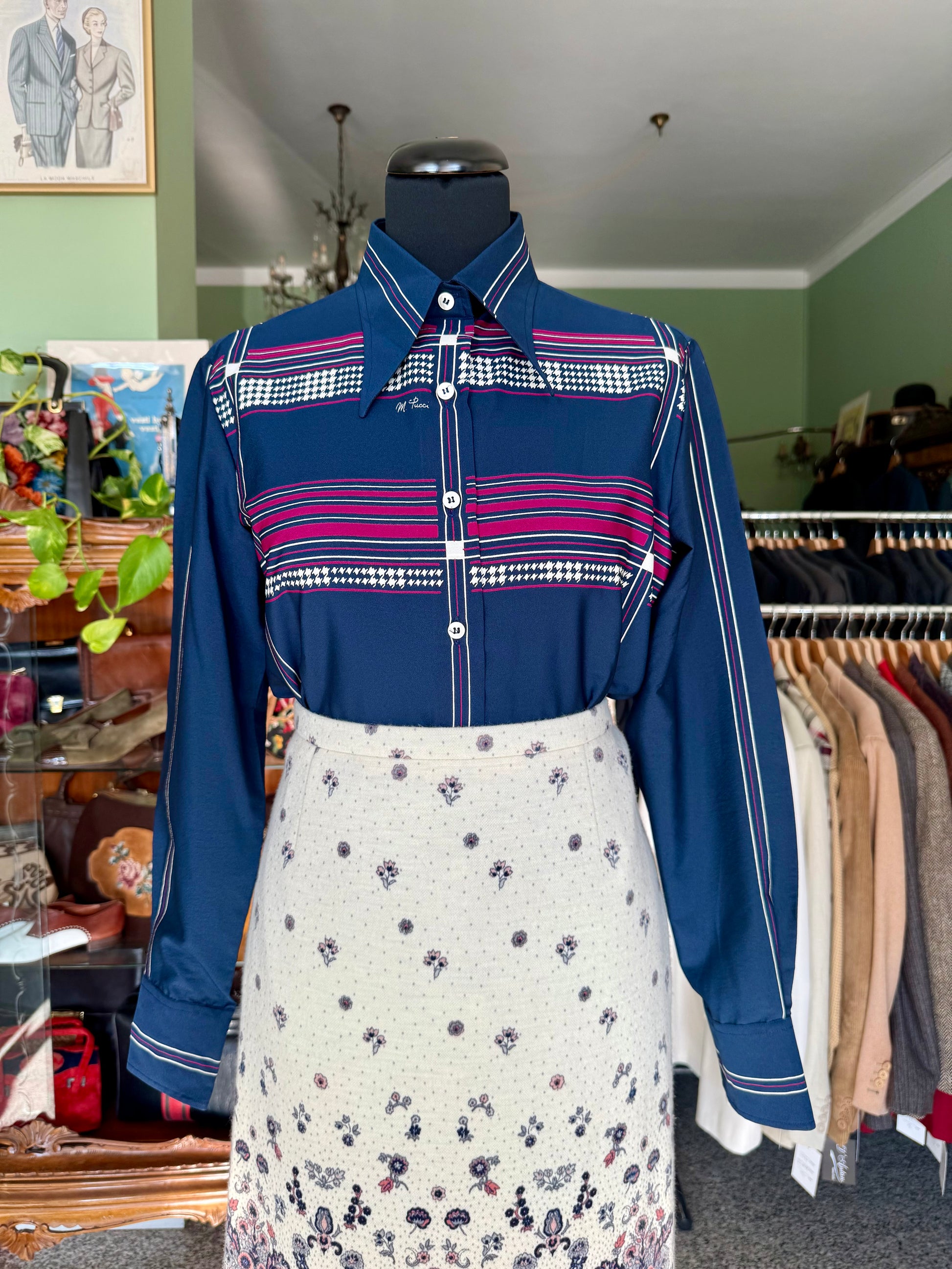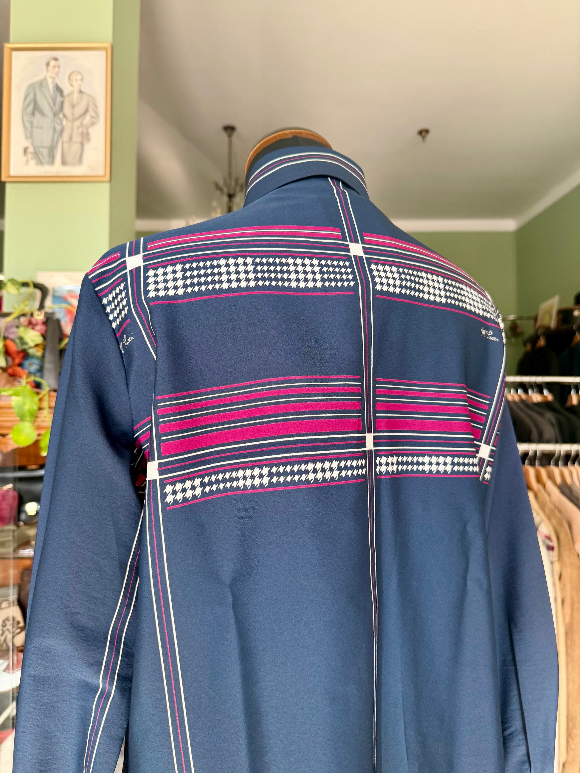 Camicia anni ‘70 in tessuto fluido color blu navy con dettagli grafici a righe e quadri nei toni del fucsia, bianco e rosso. Il modello presenta un colletto ampio e appuntito, tipico degli anni ’70, chiusura frontale con bottoni bianchi e polsini con dettaglio a contrasto. Il taglio leggermente sfiancato valorizza la figura, rendendola perfetta da indossare con gonne a vita alta o pantaloni a zampa per un look retrò deciso ed elegante.