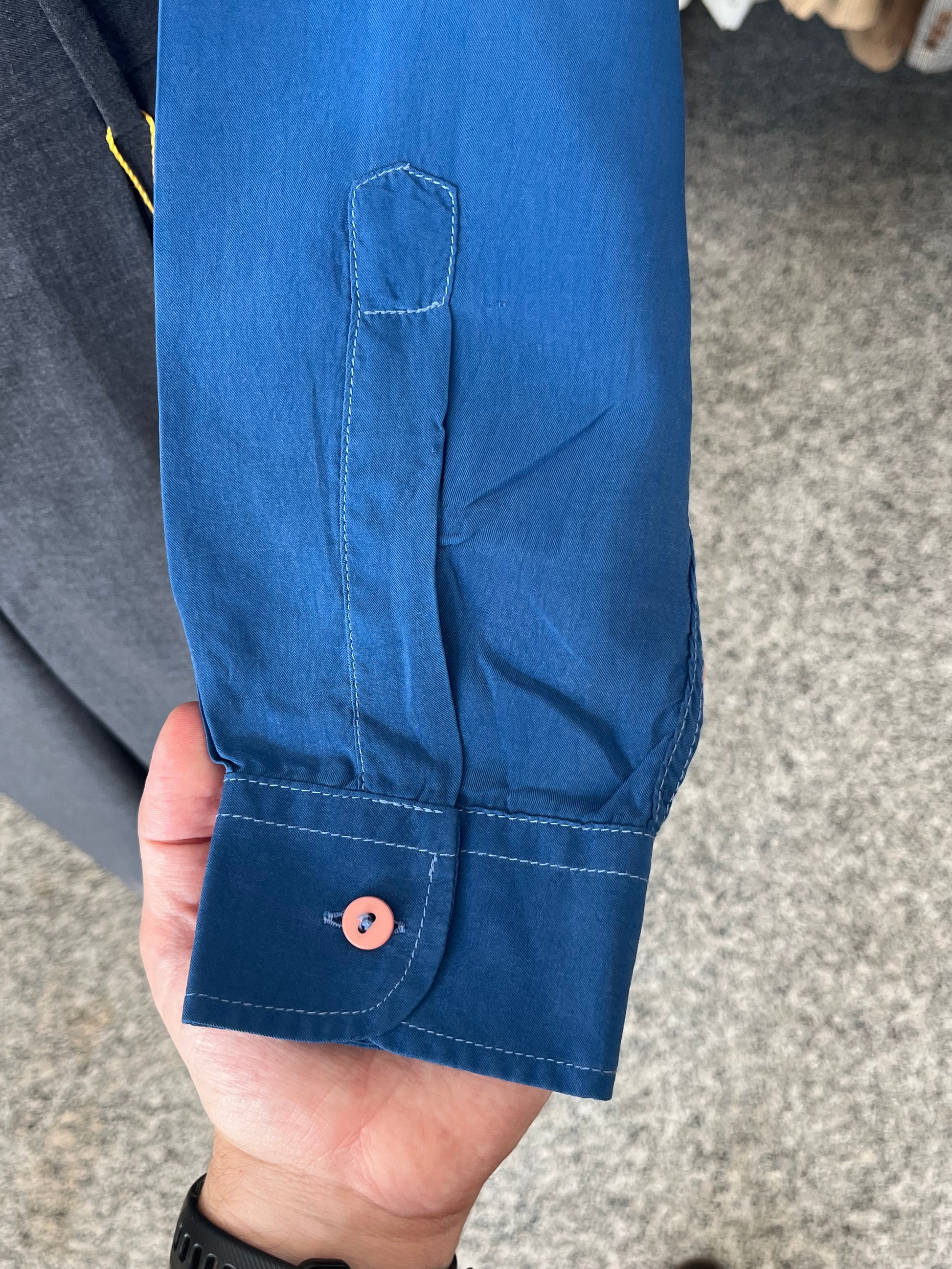 Di colore blu, con particolare collo capri, taschino sul petto e polsino abbottonato.