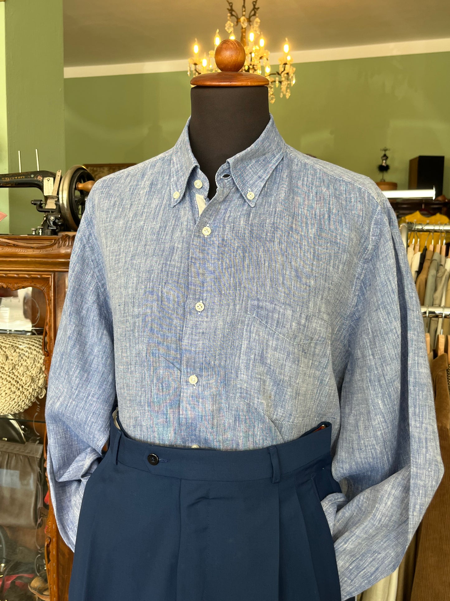 La camicia è di colore celeste, con collo abbottonato (button-down) e taschino sul petto.
