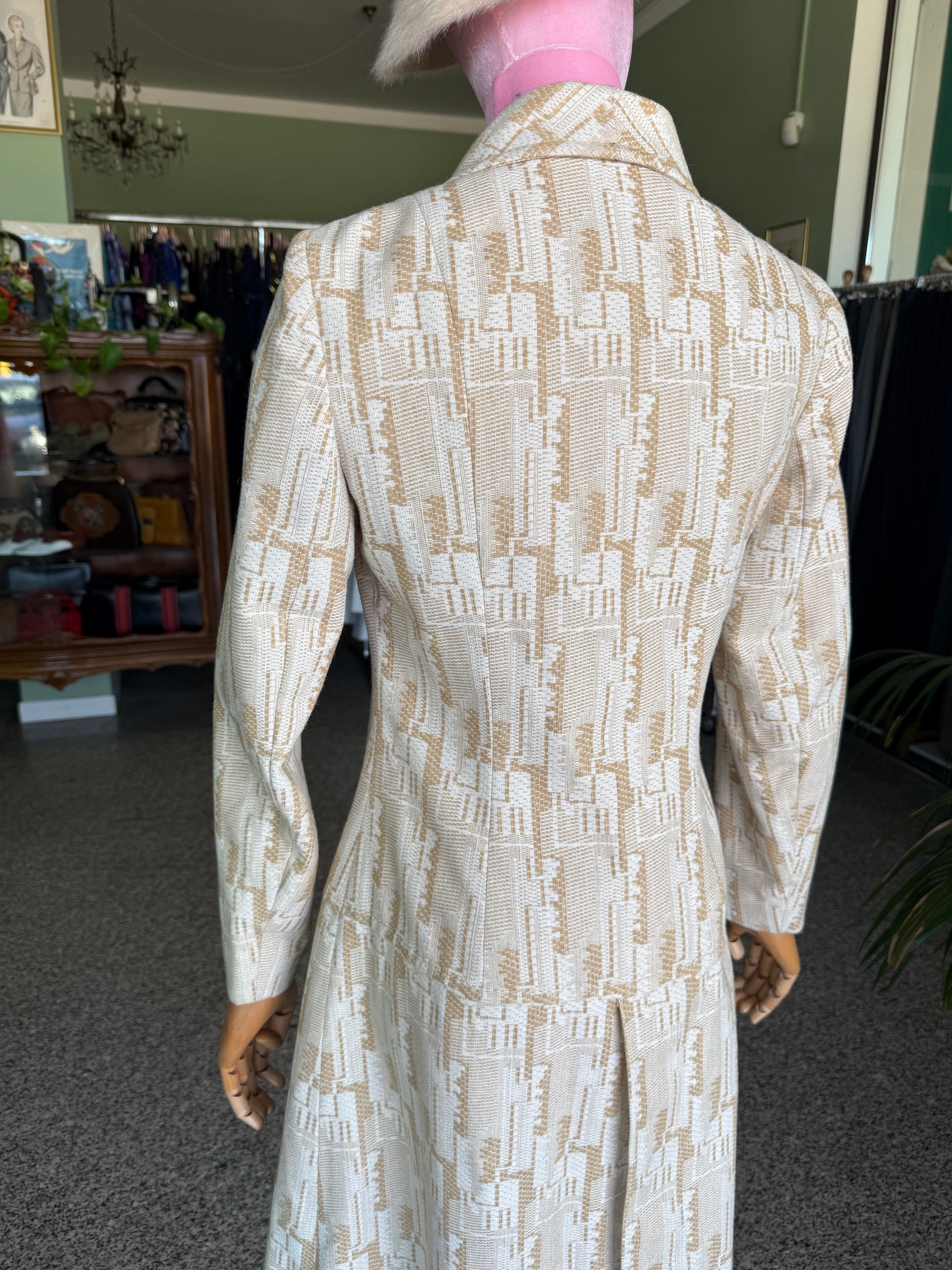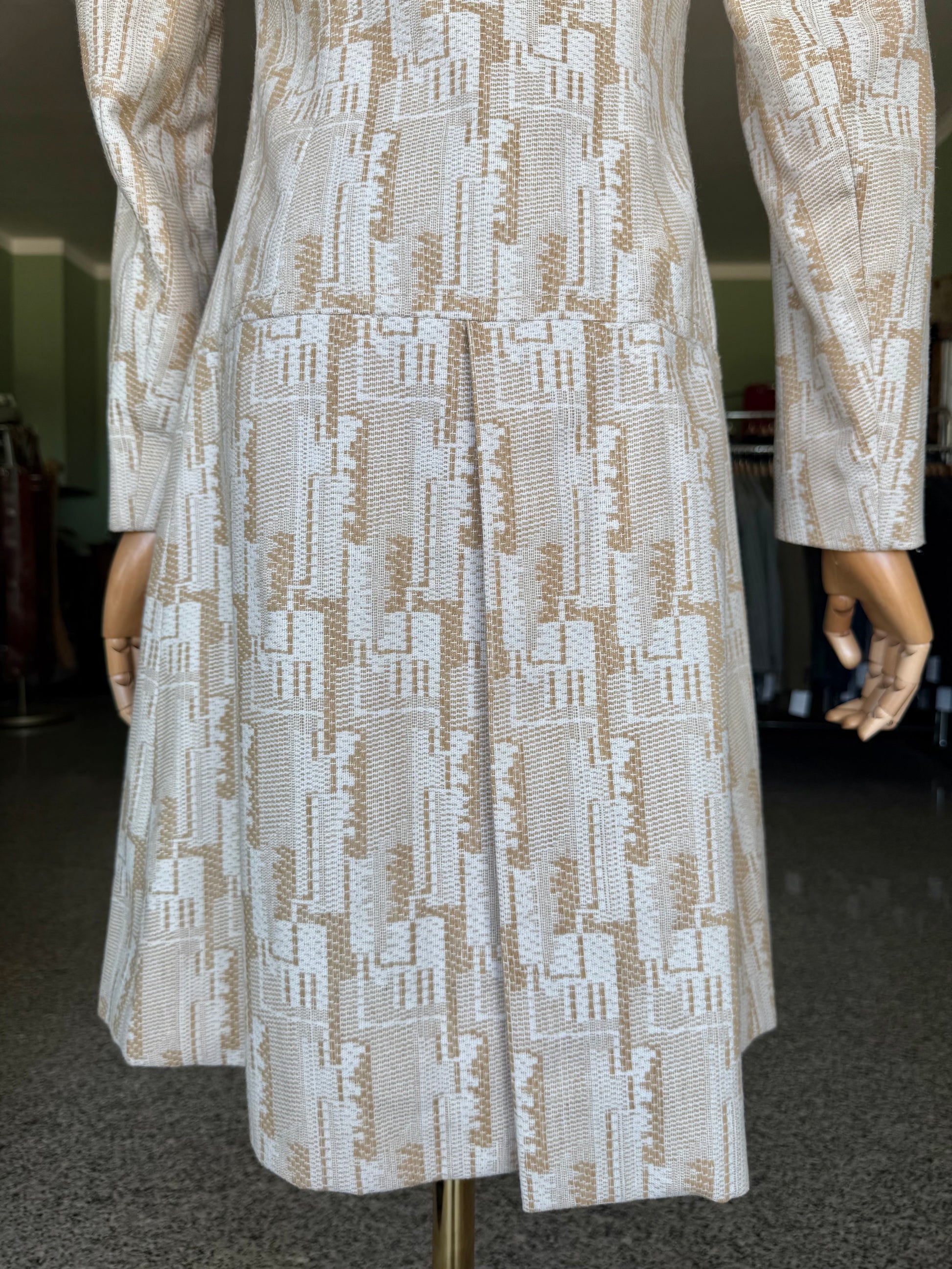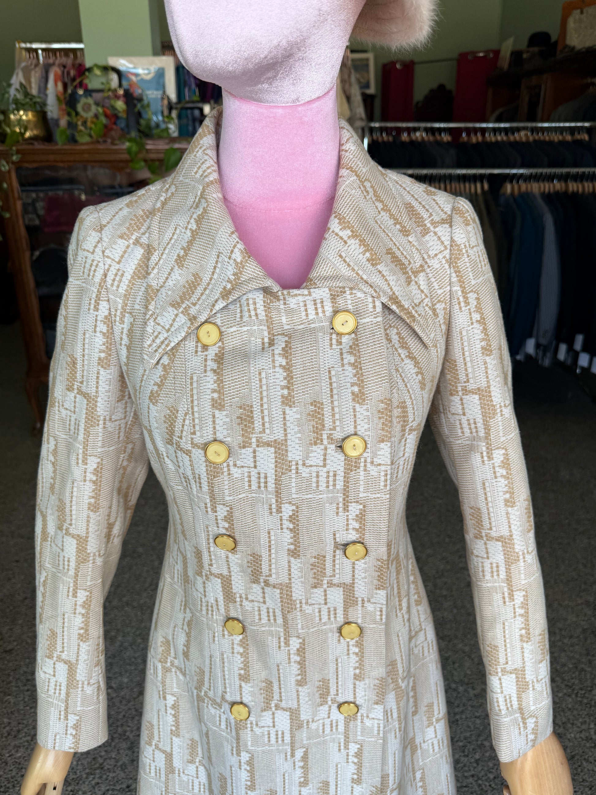 Modello doppiopetto in tessuto chiaro con bottoni color buscotto. Lina svasata e eleganza geometrica. È un cappotto che profuma di alta moda anni ’70, con richiami al gusto di Courrèges o Cardin, oggi rivisitati dalle grandi maison della moda.