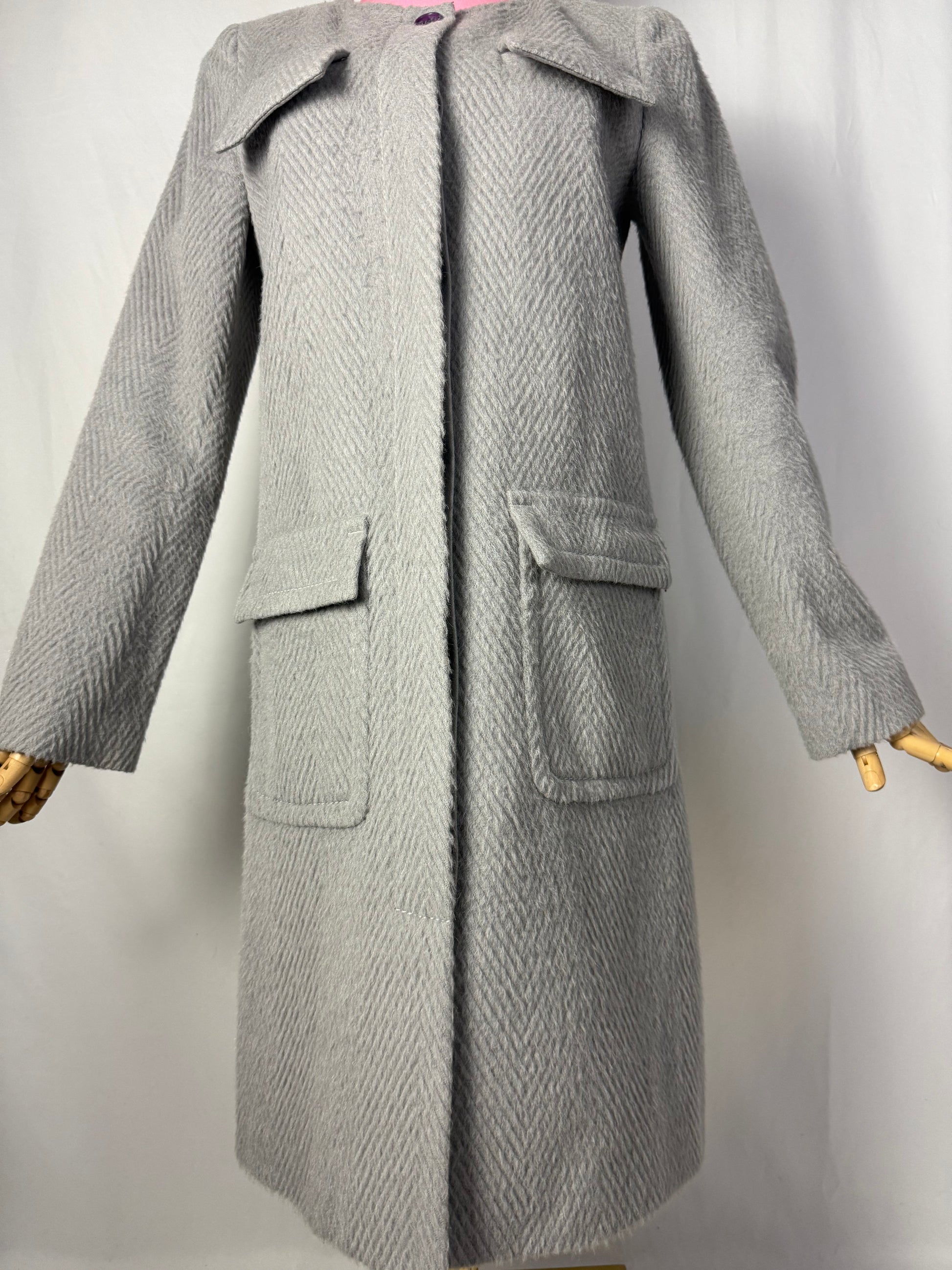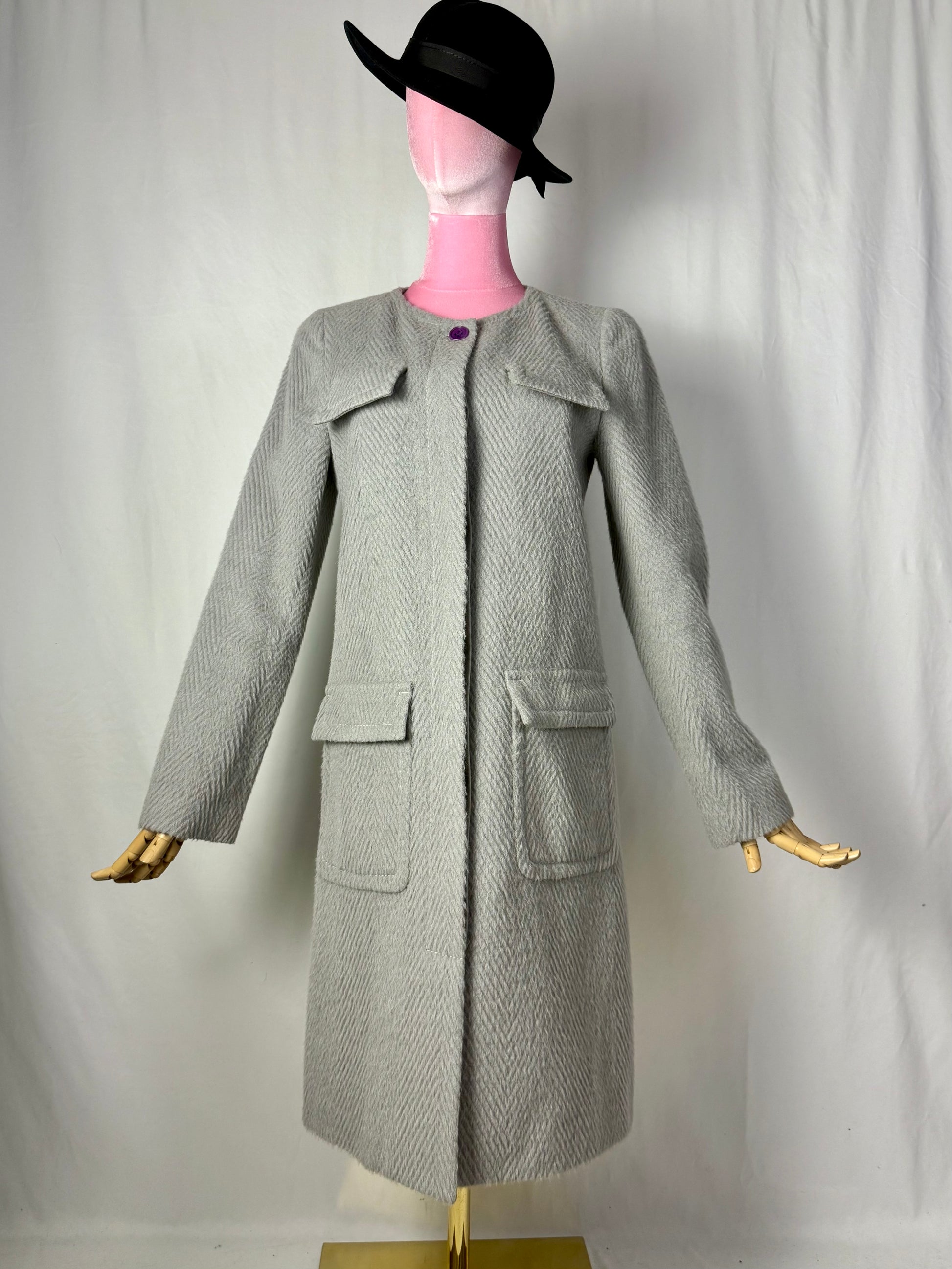 Cappotto firmato Ballantyne in pregiata lana morbida spigata grigio chiaro, dalla linea essenziale e raffinata. Il taglio dritto e pulito è valorizzato da dettagli sobri e sofisticati: due tasche applicate con pattina, finte patte sul petto e un unico bottone a vista in contrasto viola, che aggiunge un tocco inaspettato e contemporaneo. La costruzione è impeccabile, con spalle leggermente strutturate, maniche lunghe e una vestibilità classica che scivola senza appesantire. Completamente foderato in raso grigio perla con motivo jacquard, è un capo di altissima qualità.