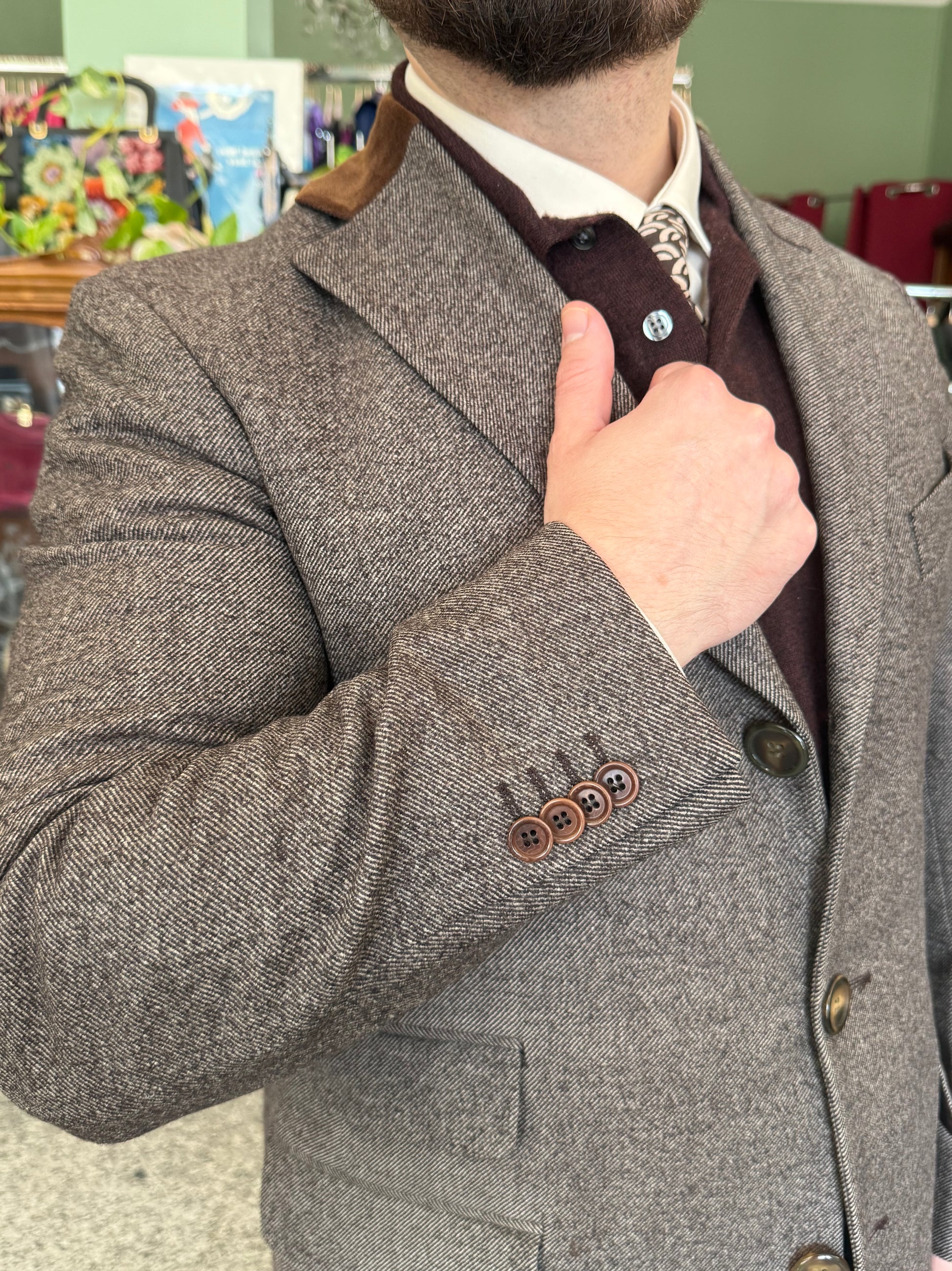 Presenta abbottonatura a tre bottoni, baveri a dente, collo in velluto a contrasto tasche a pattina, ticket-pocket e spacco sul retro.