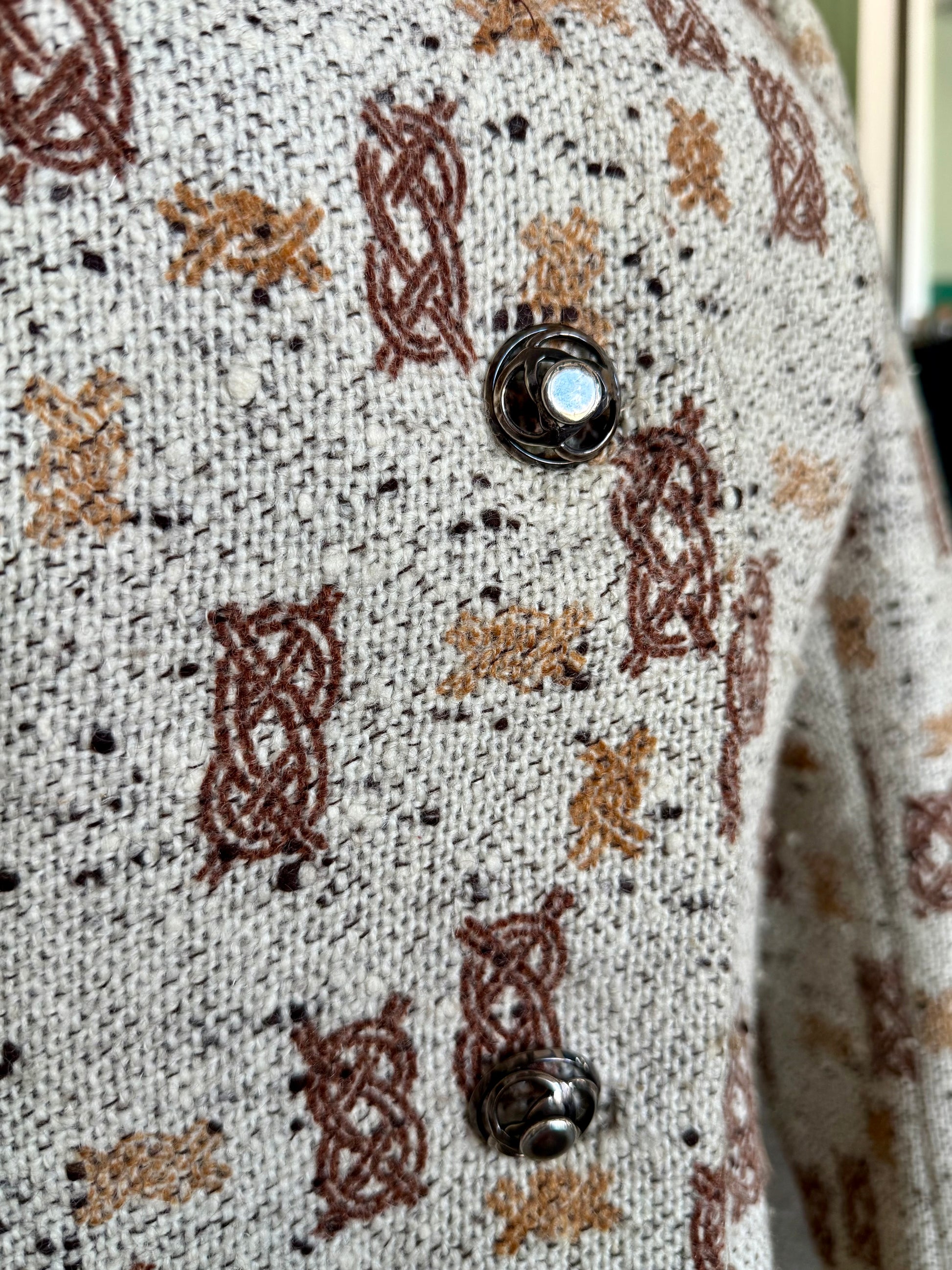Presenta un taglio leggermente sciancrato, con una vestibilità pulita tipica degli anni ’60. Il tessuto jacquard dalle fantasie geometriche nei toni del marrone e beige trasmette un’eleganza quotidiana, quasi borghese, con un richiamo forte al design d’interni dello stesso periodo. È lo stile che oggi viene reinterpretato da maison come Gucci o Valentino, che giocano con pattern rétro su capi dalla silhouette essenziale.