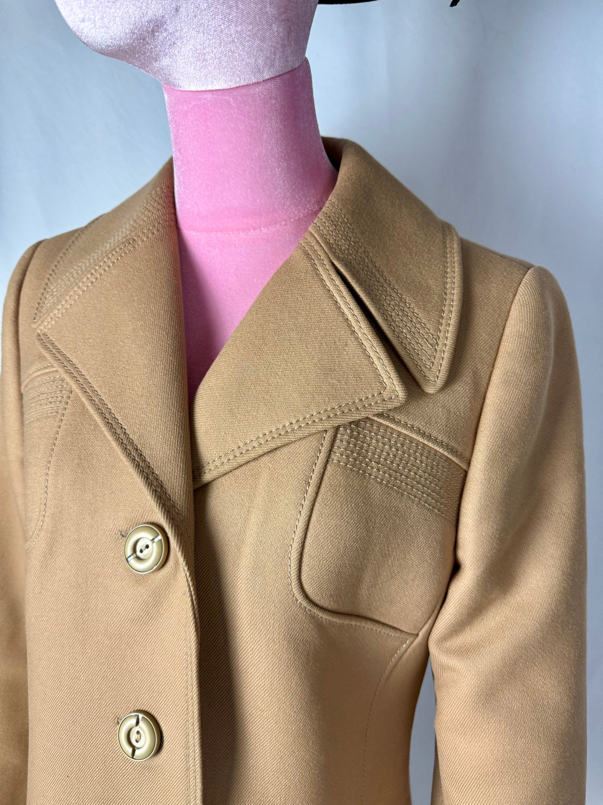 Elegante cappotto anni ’70 in pura lana color cammello, caratterizzato da una linea femminile e avvitata. Il punto forte del modello è il grande colletto a lancia con impunture decorative che proseguono anche sul carré, un dettaglio tipico della sartoria del periodo.