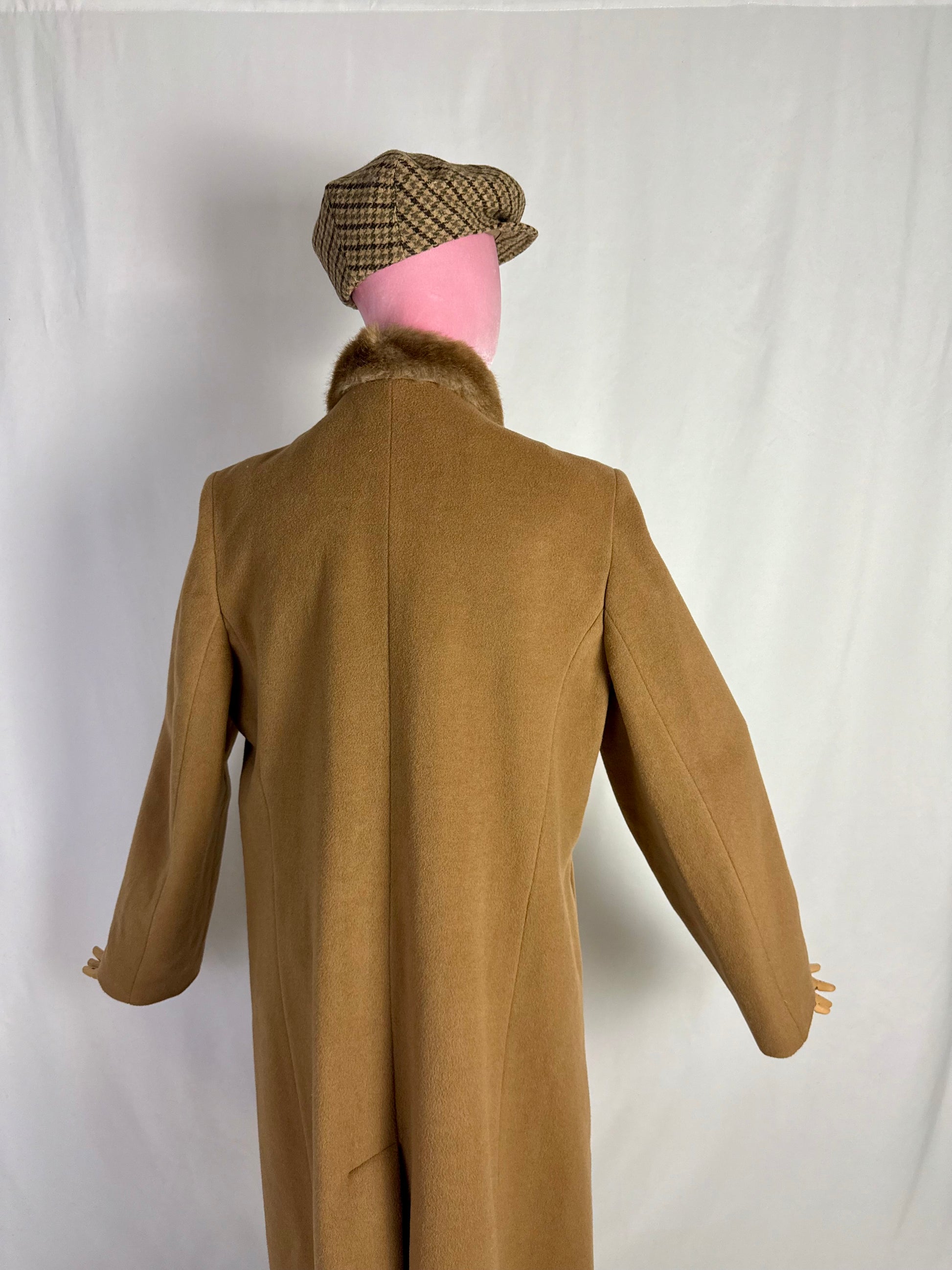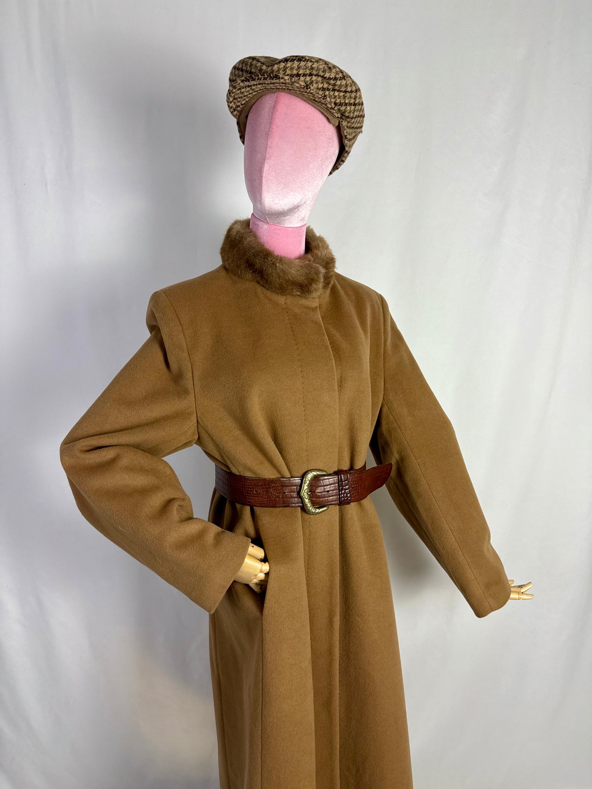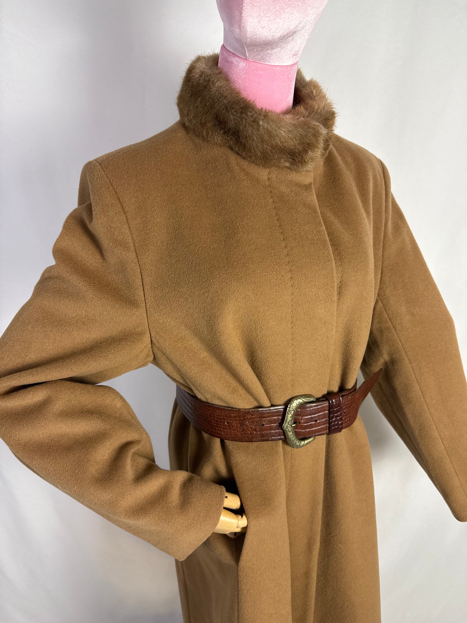 Cappotto anni ‘80 classico ed elegante, dalle linee pulite e sobrie. Presenta un colletto in eco pelliccia e è una abbottonatura coperta. La lana color cammello è compatta e corposa. Si può indossare sia con cintura (come suggerito in foto), sia senza.