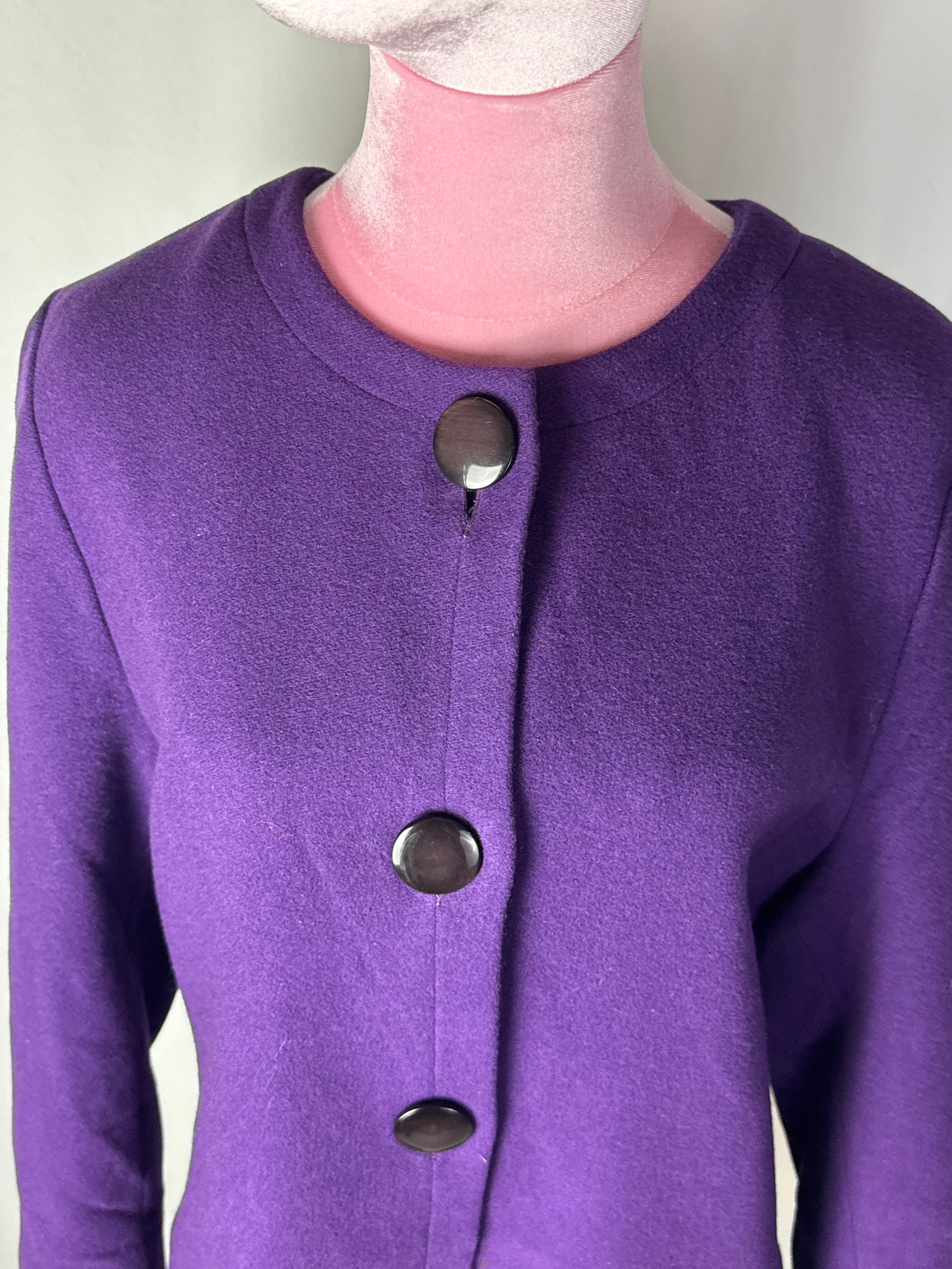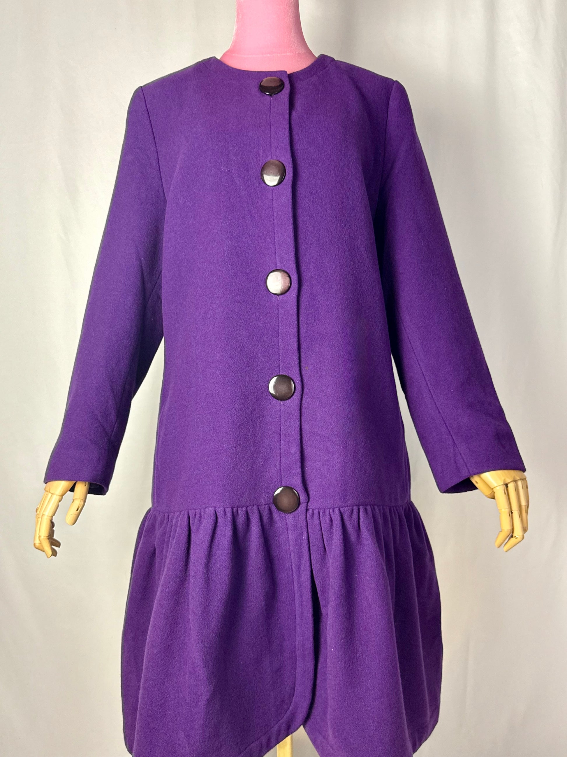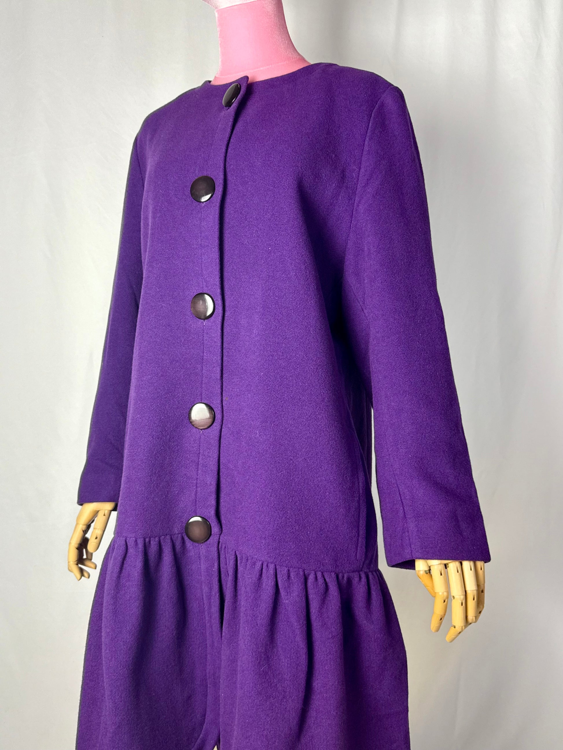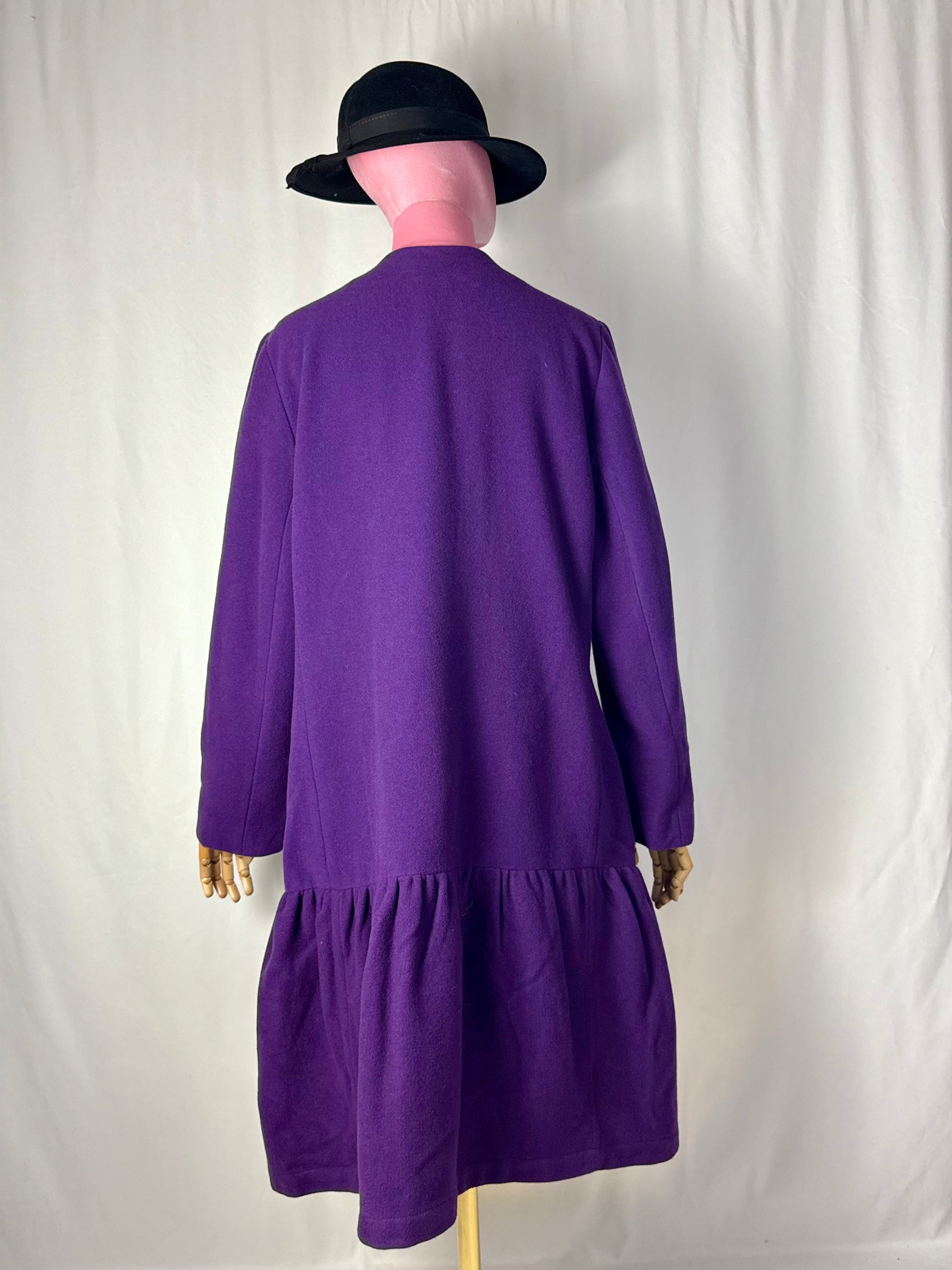 Cappotto anni ’80 in lana viola, caratterizzato da bottoni grandi dal look grafico e taglio dritto con balza arricciata sul fondo, tipica dello stile dell’epoca. Collo tondo, manica lunga, interno foderato. Un pezzo scenografico, sembra quasi un abito.