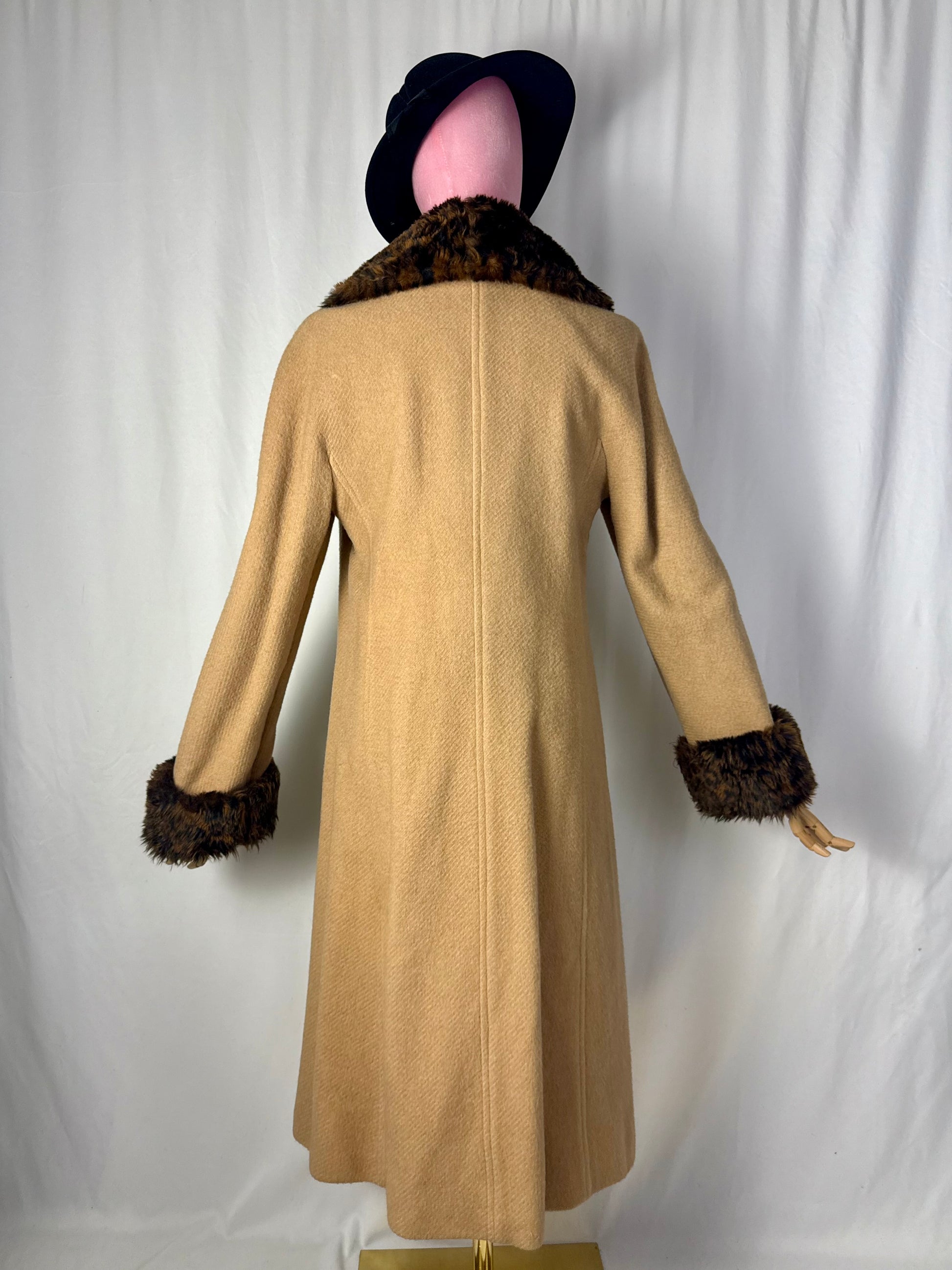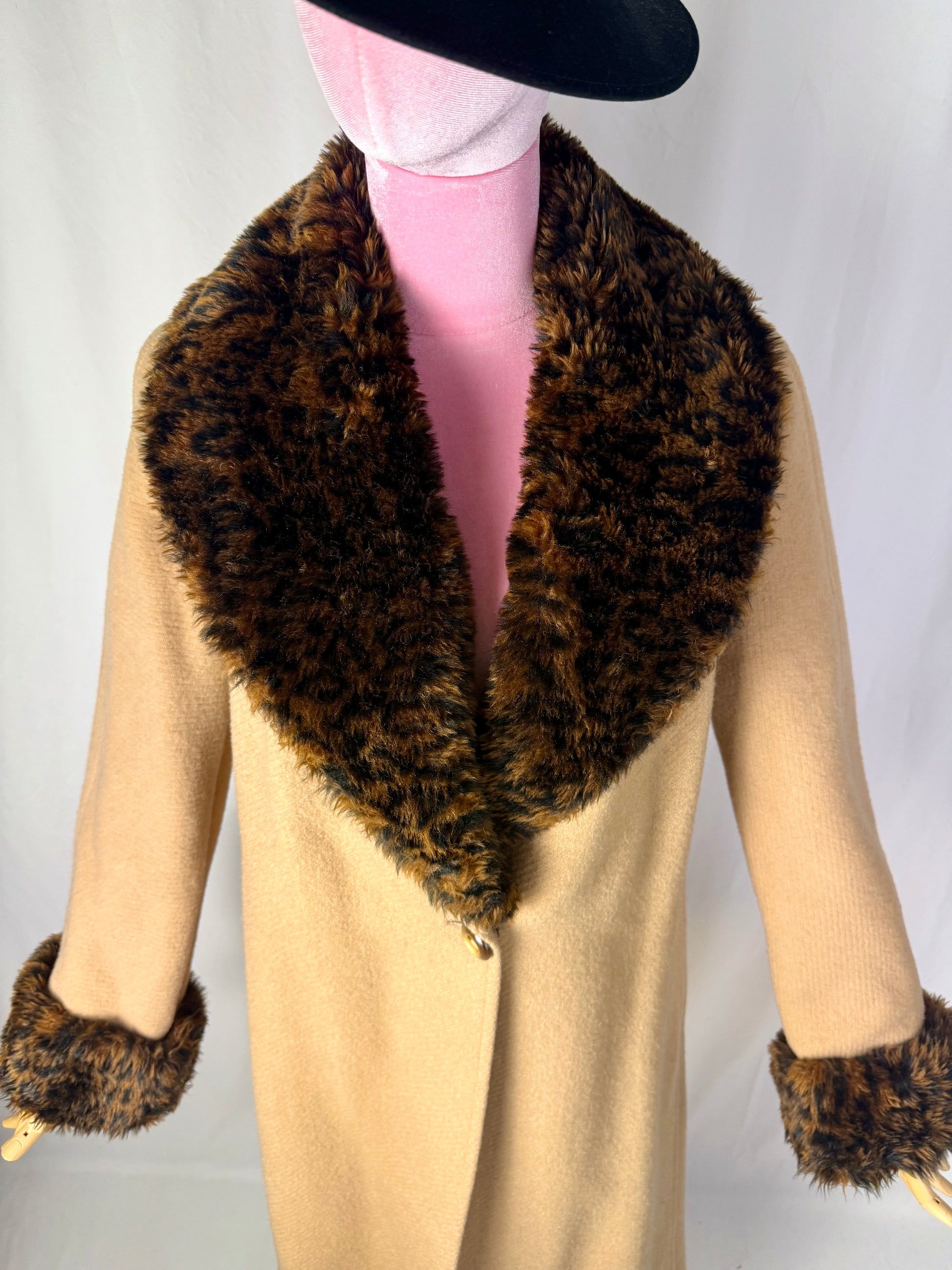 Cappotto fine anni ’70/ primi ’80 in pura lana color cammello, caratterizzato da una linea elegante e leggermente svasata. Il colletto ampio e i manicotti sono rifiniti in morbida eco pelliccia leopardata, per un tocco chic sofisticato. Chiusura frontale con un solo bottone e fodera interna in satin dorato. Capo intramontabile, perfetto per chi ama distinguersi con stile.