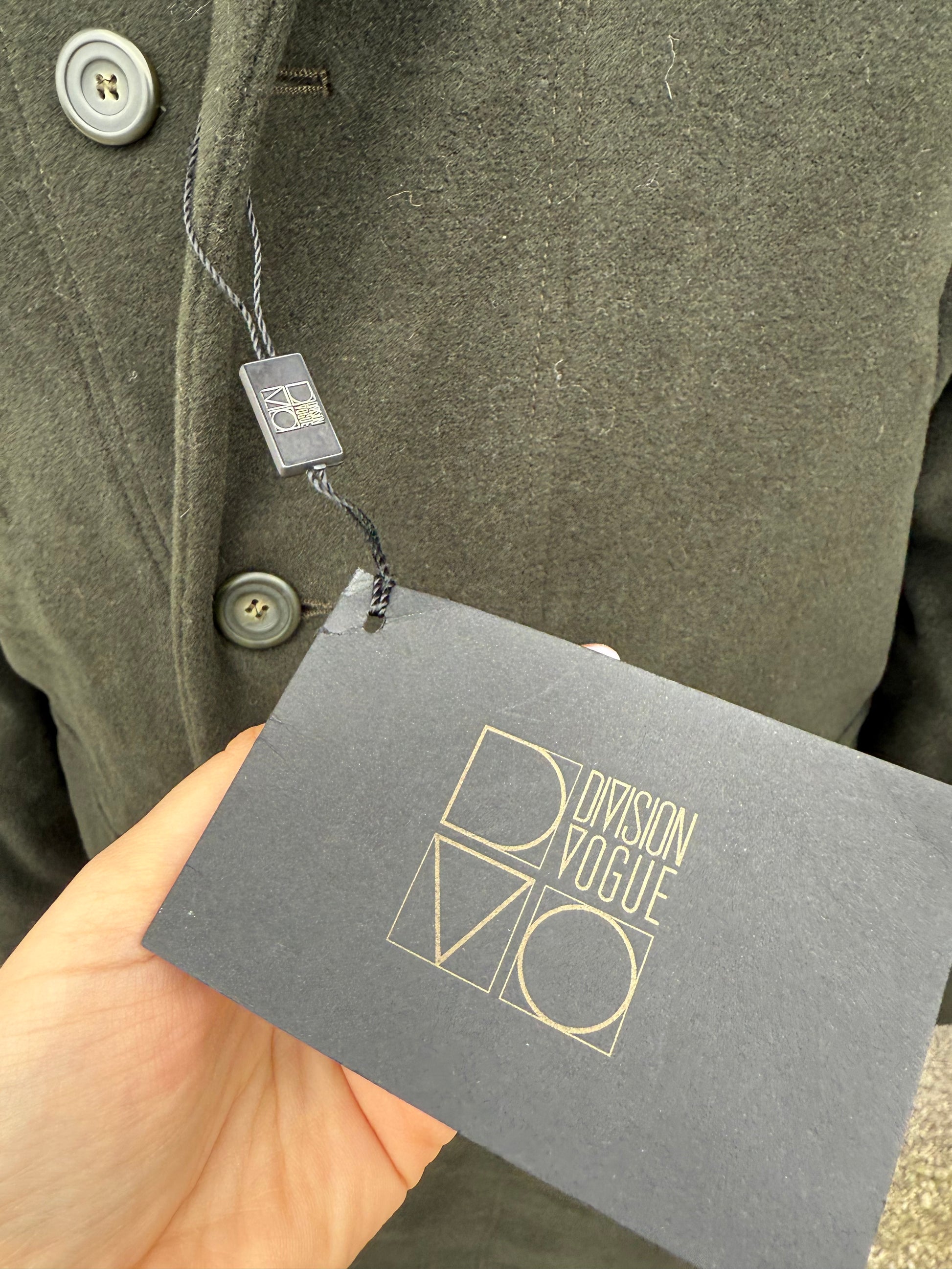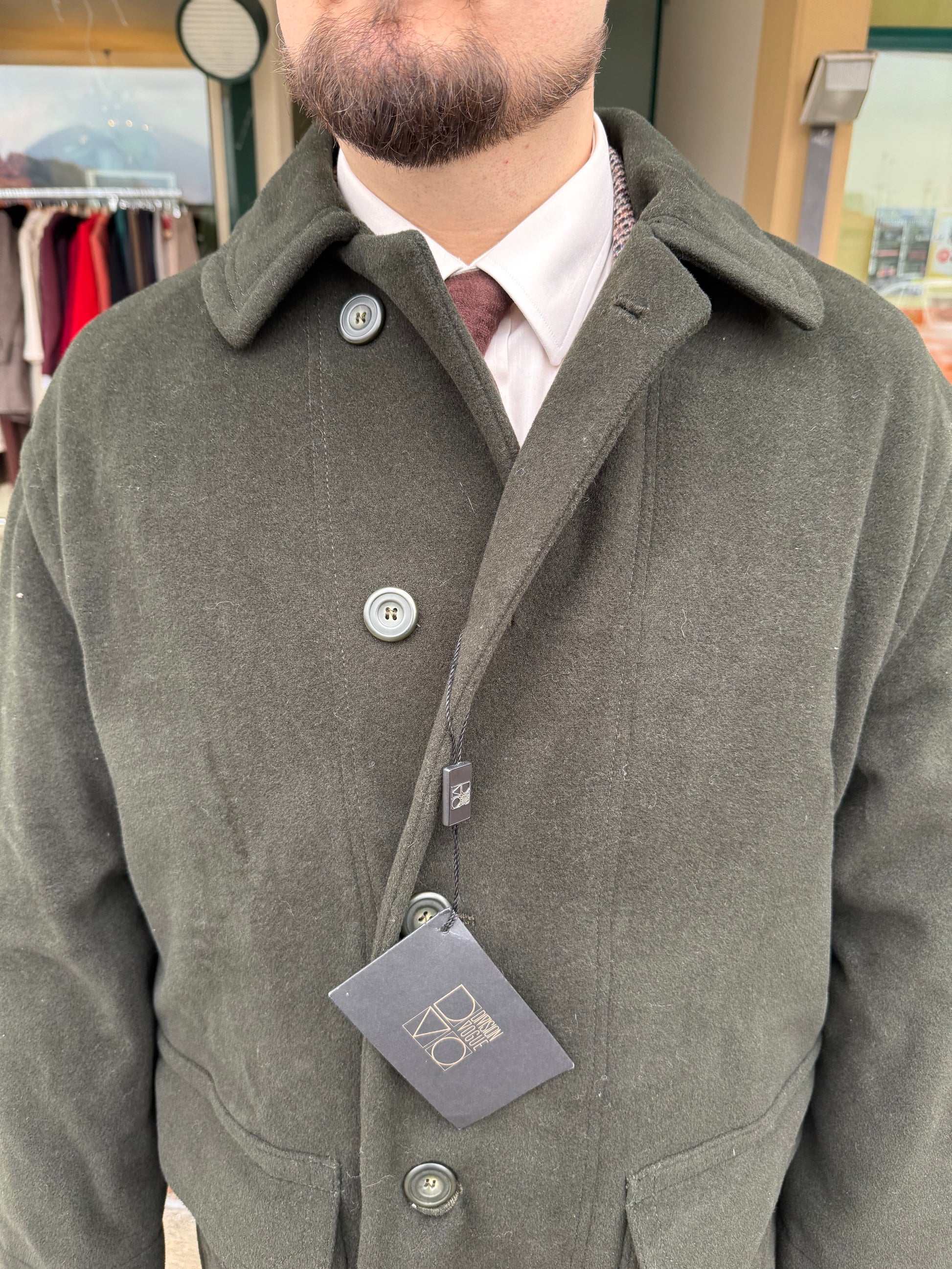 Presenta abbottonatura a cinque bottoni, spalle over-size, capienti tasche a toppa con pattina, falda sul retro ed una stupenda fodera in viscosa.