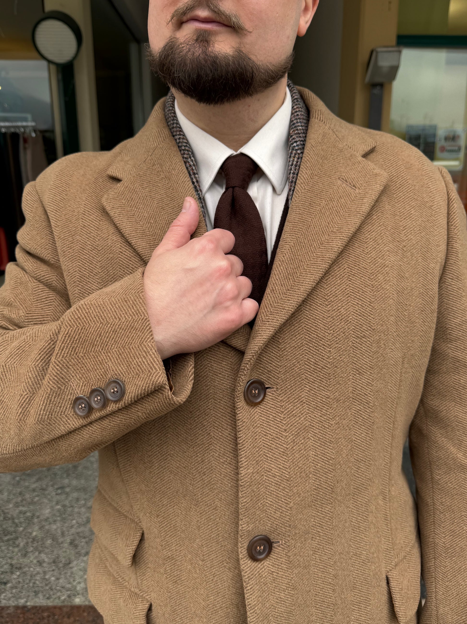 Il tessuto è una bellissima lana cardata, spigata a fili marroni e beige.