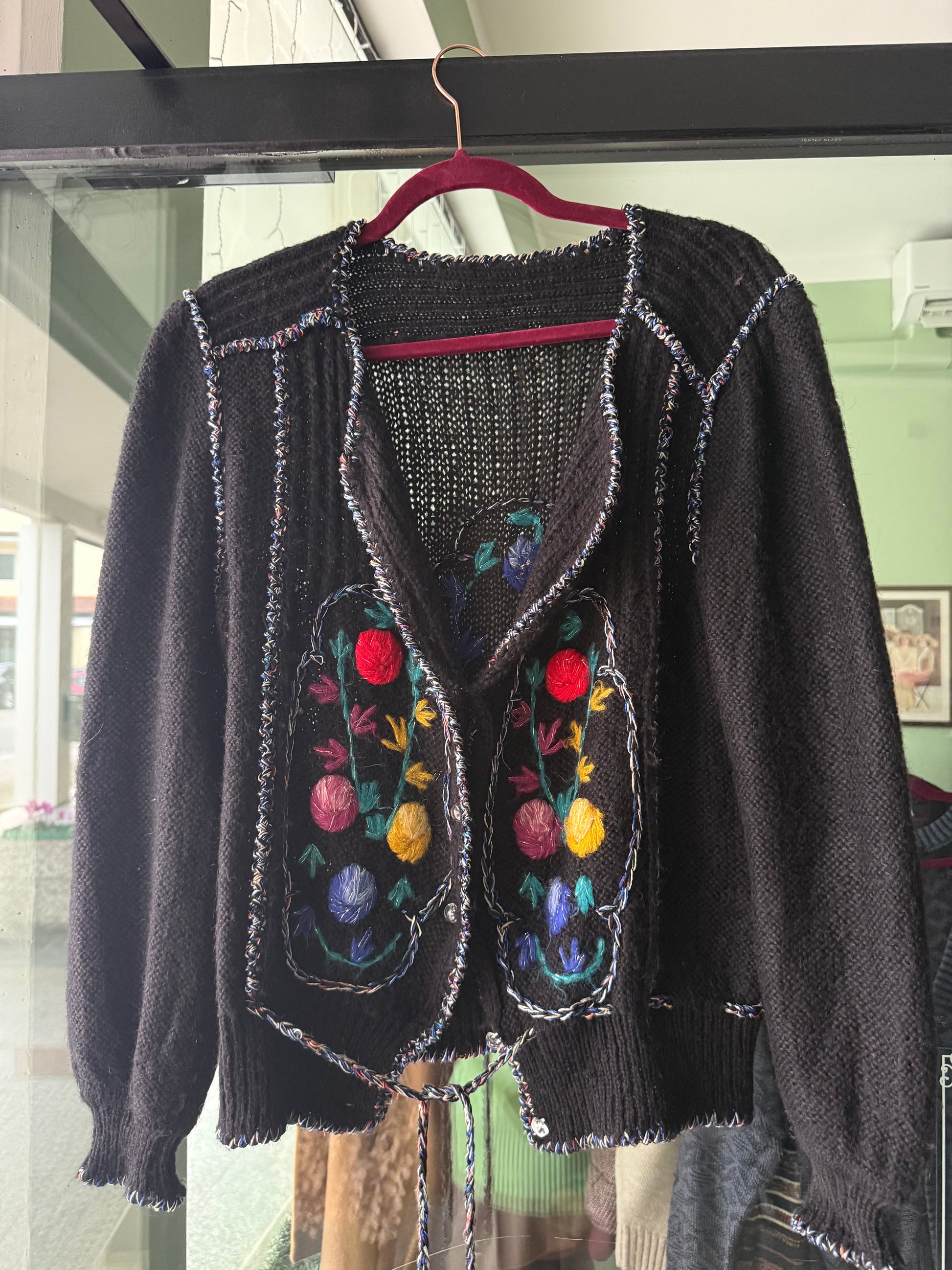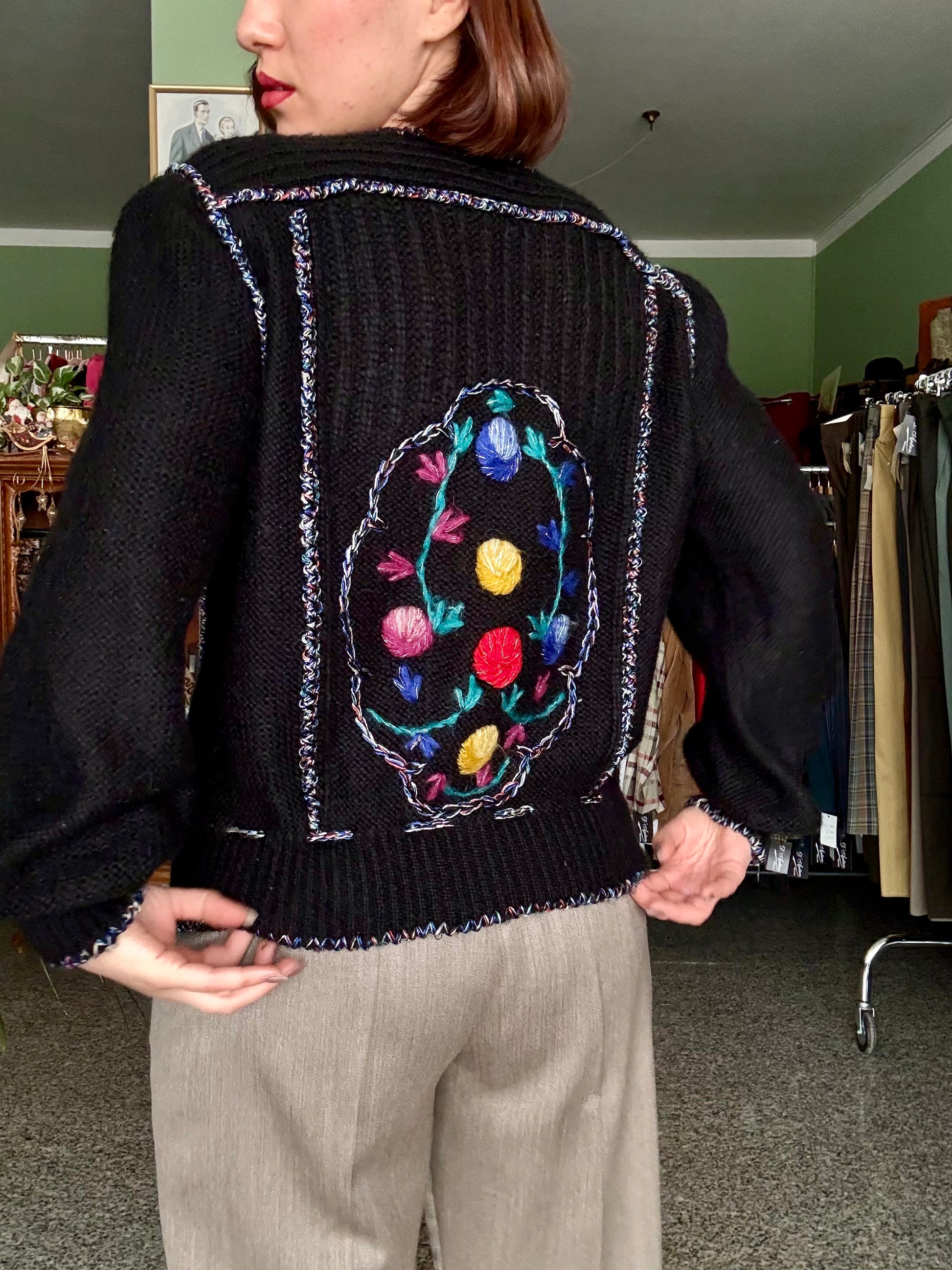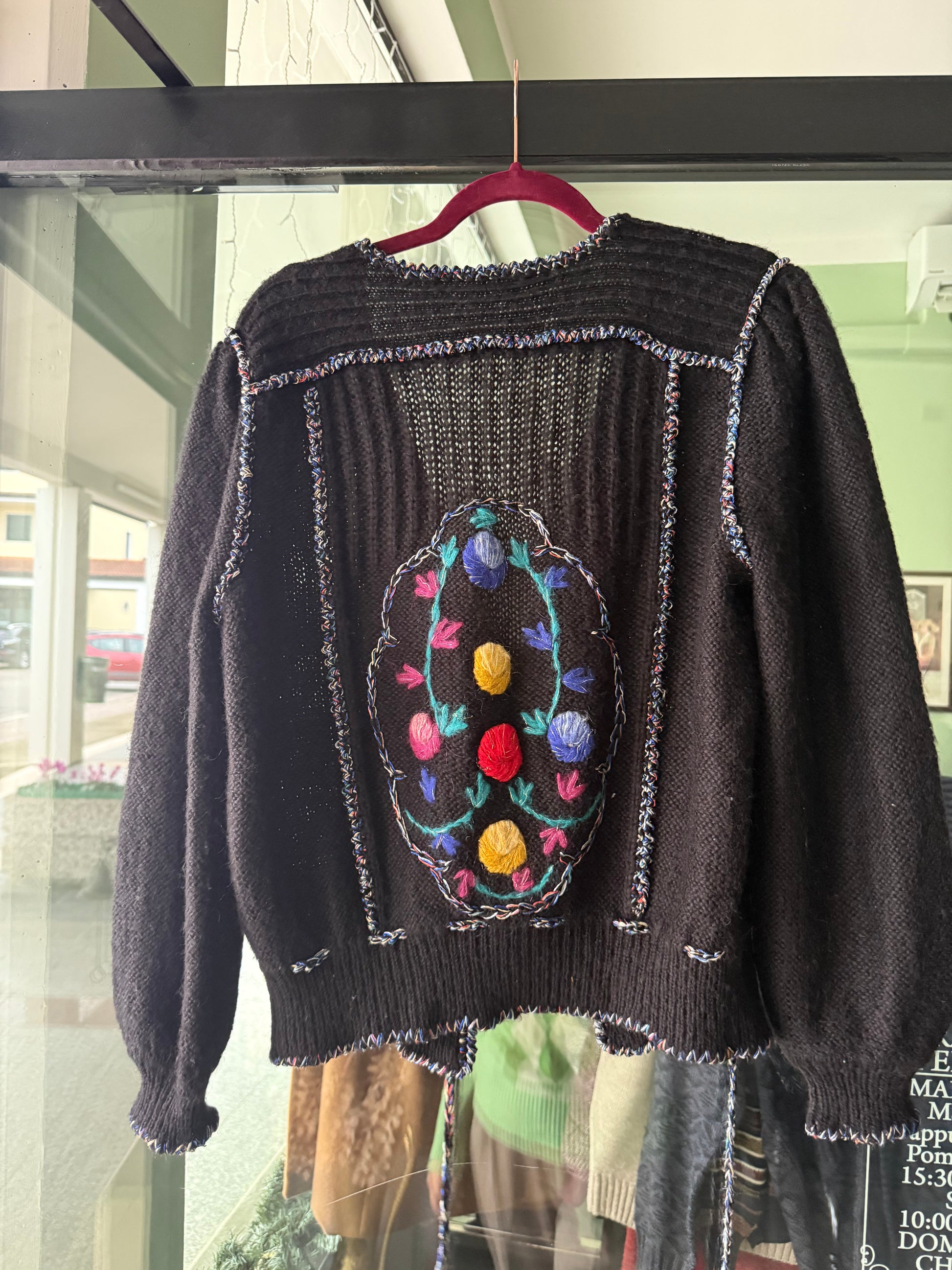 Cardigan tirolese in lana nera lavorata a maglia, con ricami frontali e posteriori a motivo floreale multicolore realizzati con filati in rilievo. Il capo presenta bordure intrecciate applicate lungo scollo, apertura, spalle, fondo e polsini, maniche leggermente blusanti con polsino rifinito, chiusura frontale con piccoli bottoni metallici decorativi e laccetto in lana al fondo.