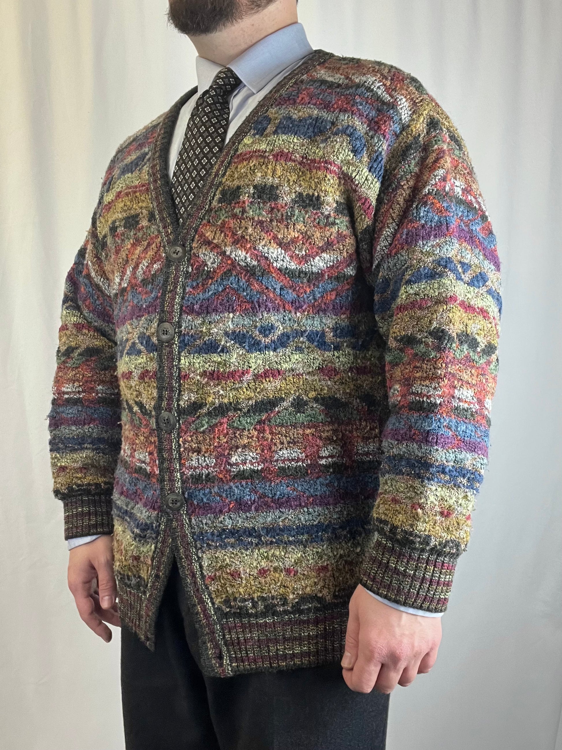 Il cardigan presenta sei bottoni e fantasia astratta in stile Missoni.