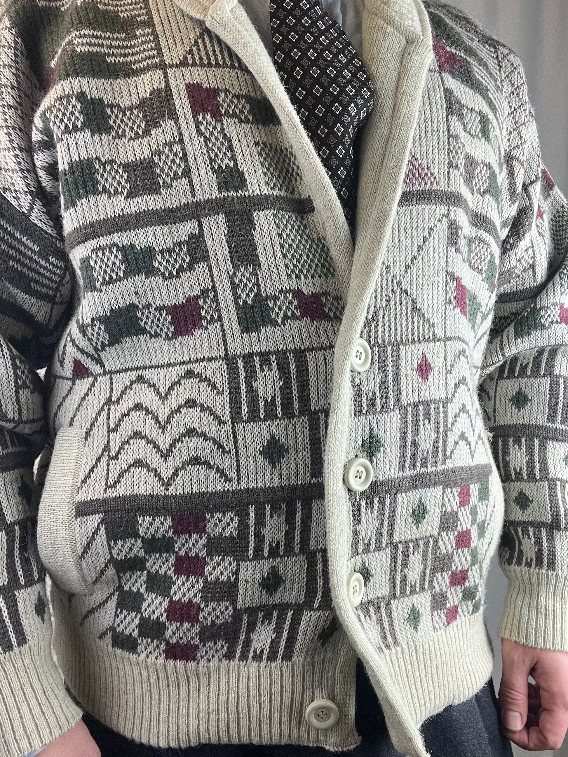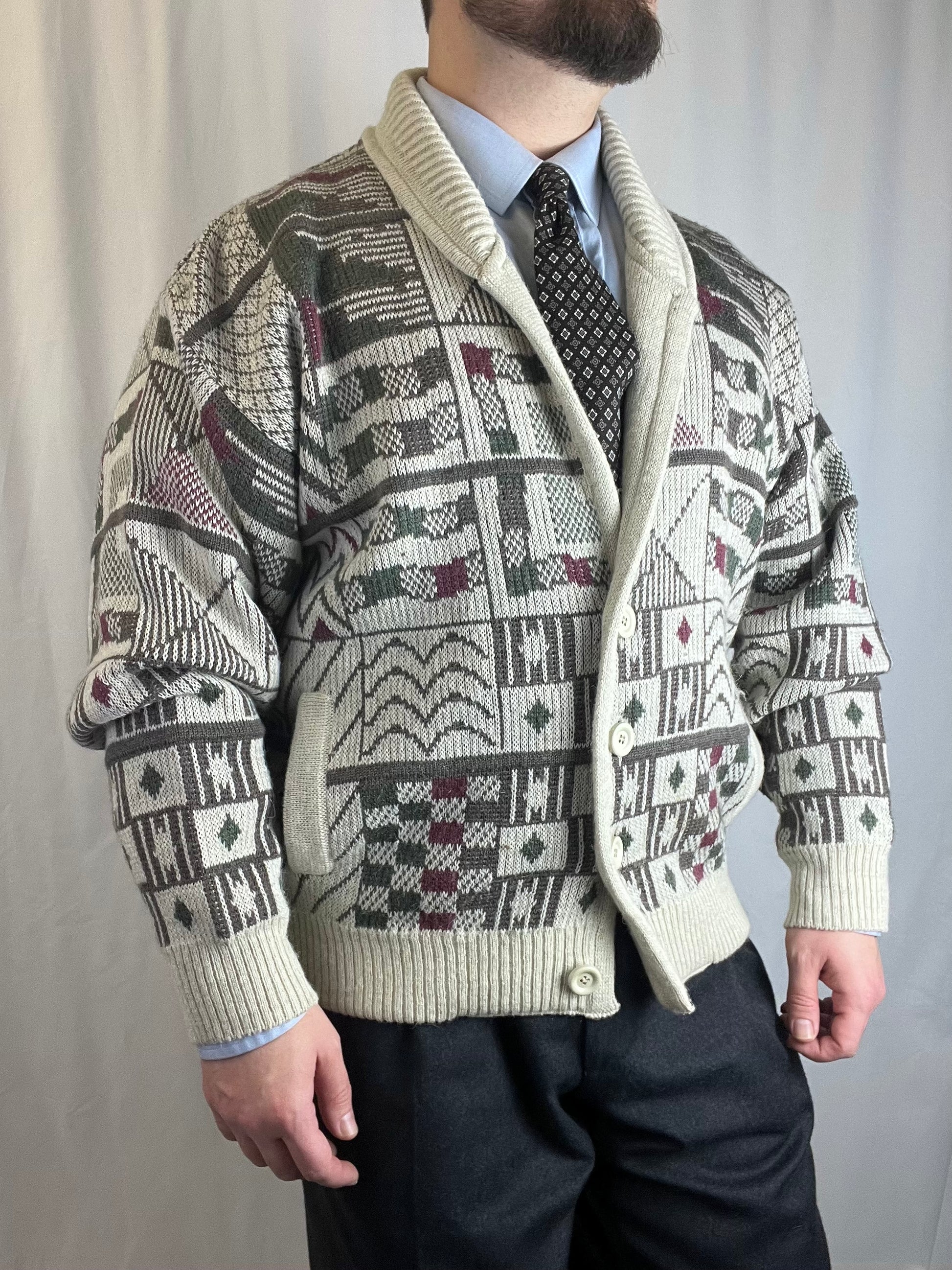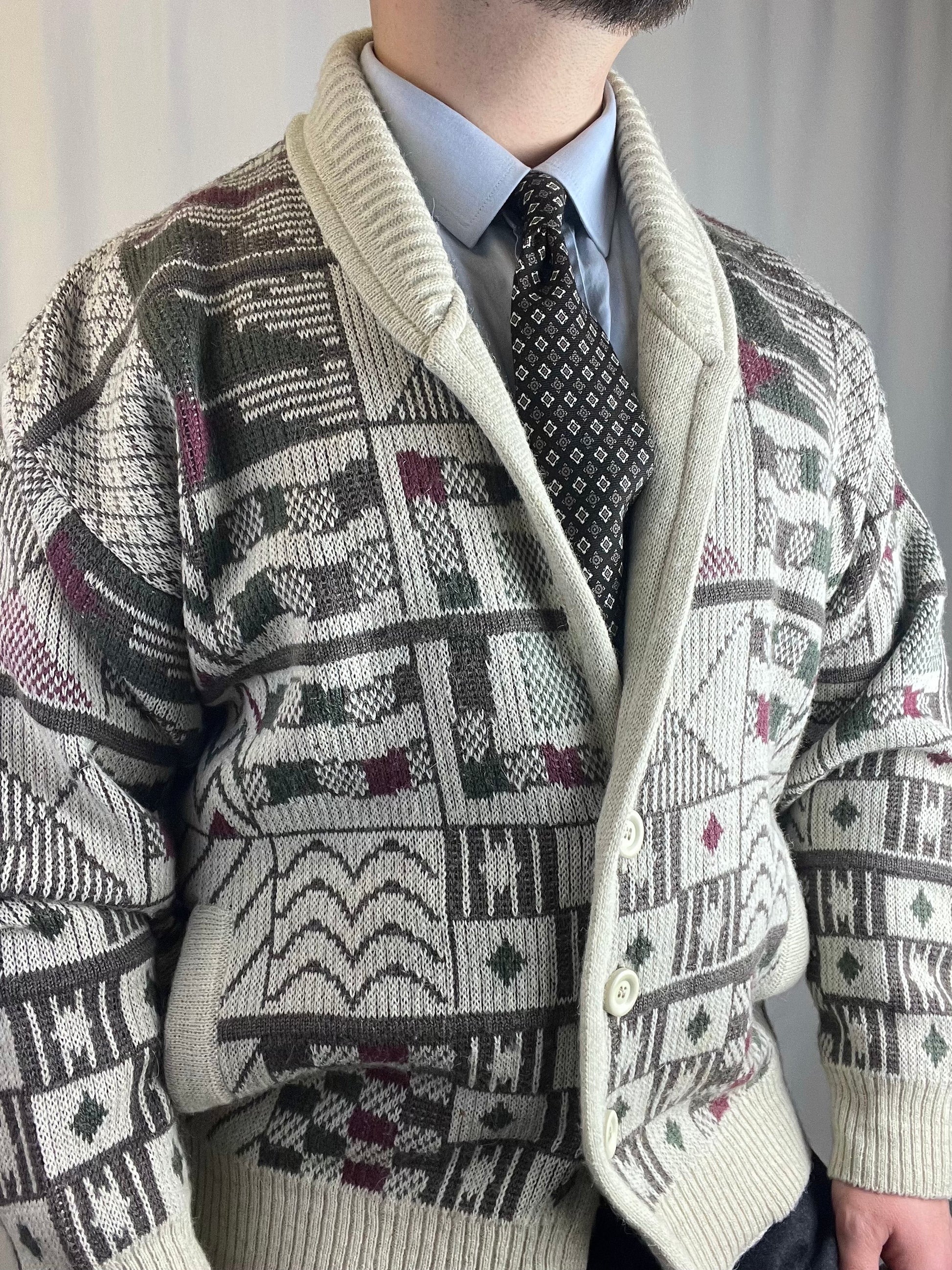 Cardigan anni '90, in pura lana, di colore crema, verde e borgogna.