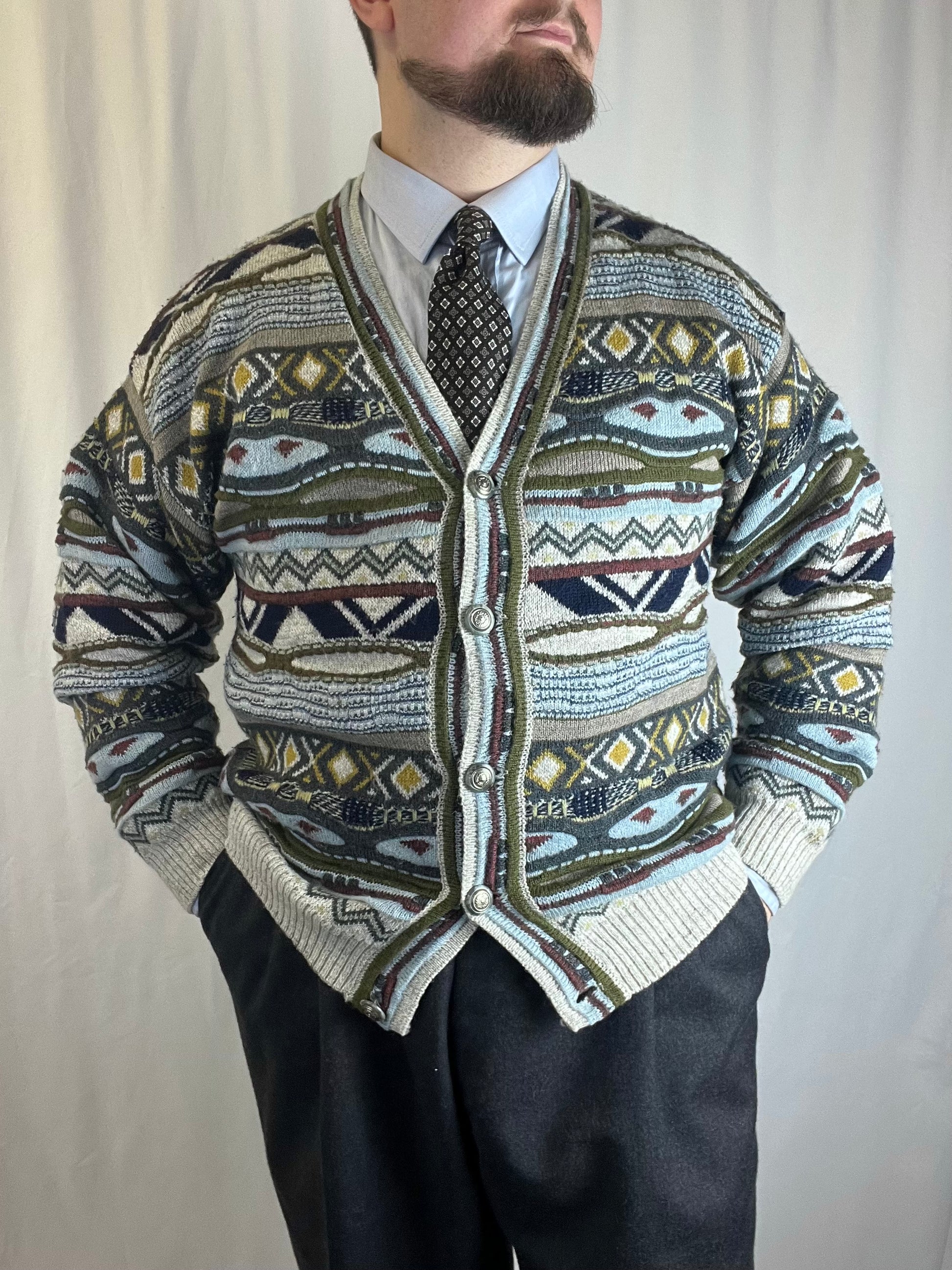 Cardigan anni '80, in pura lana, di colore grigio, verde e blu e borgogna.