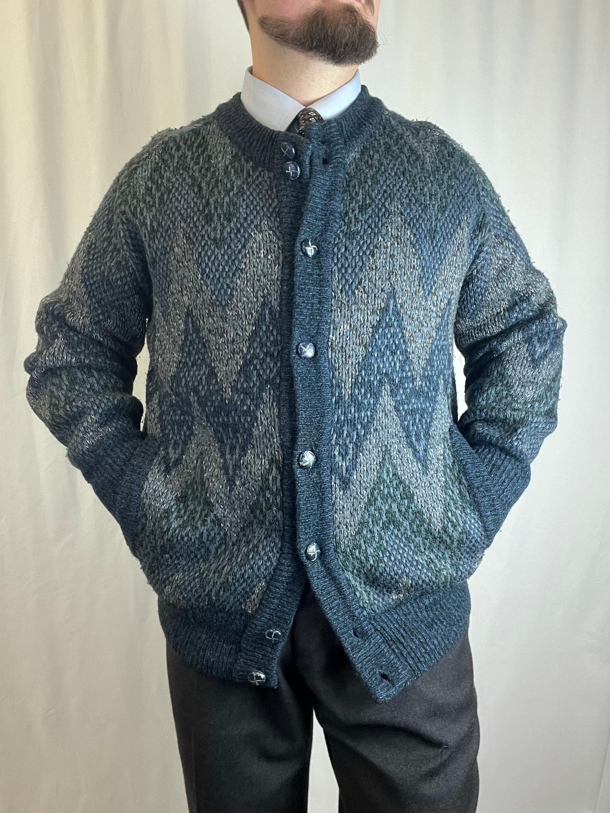 Cardigan anni '80, in pura lana, di colore grigio e blu.