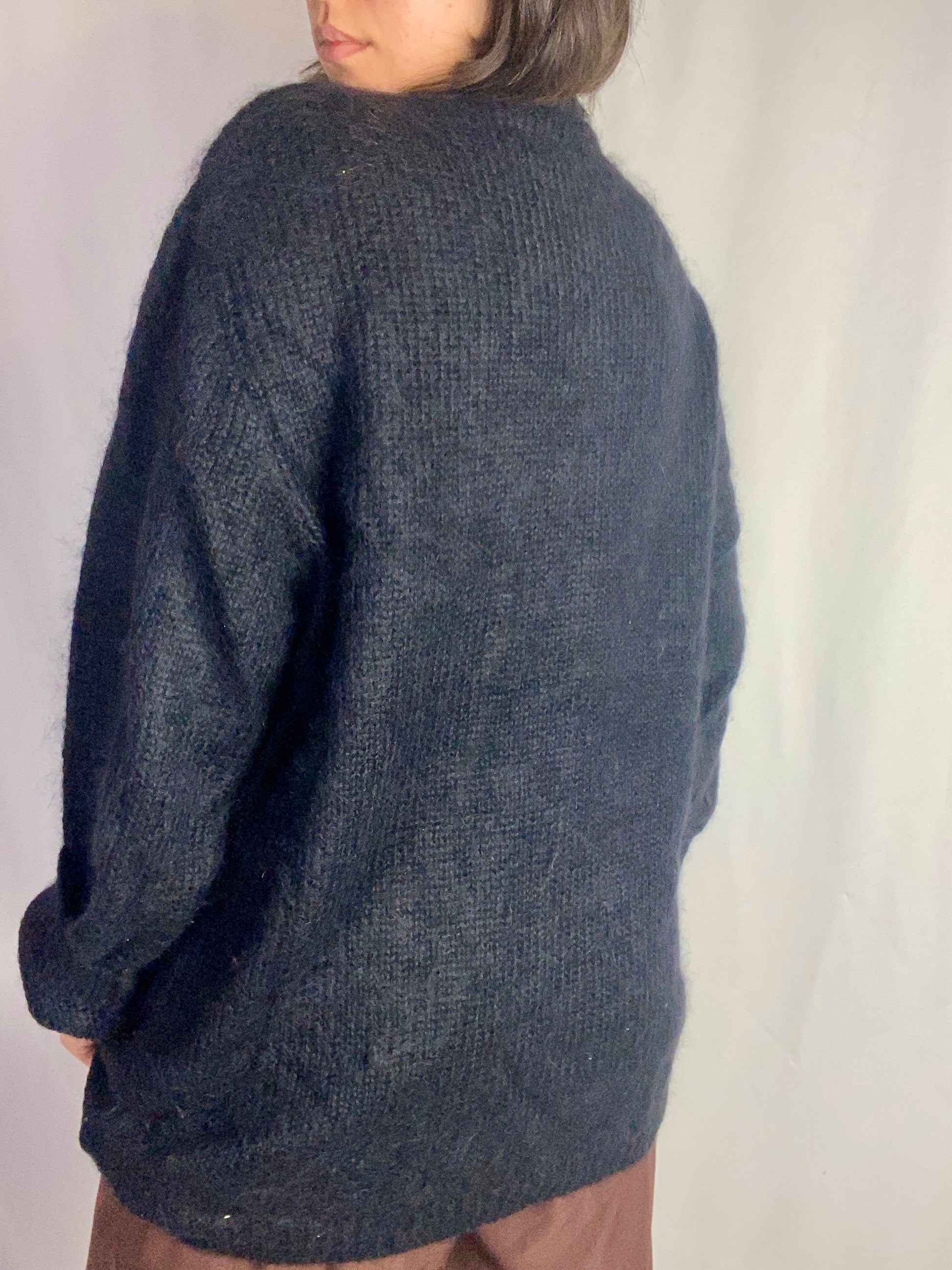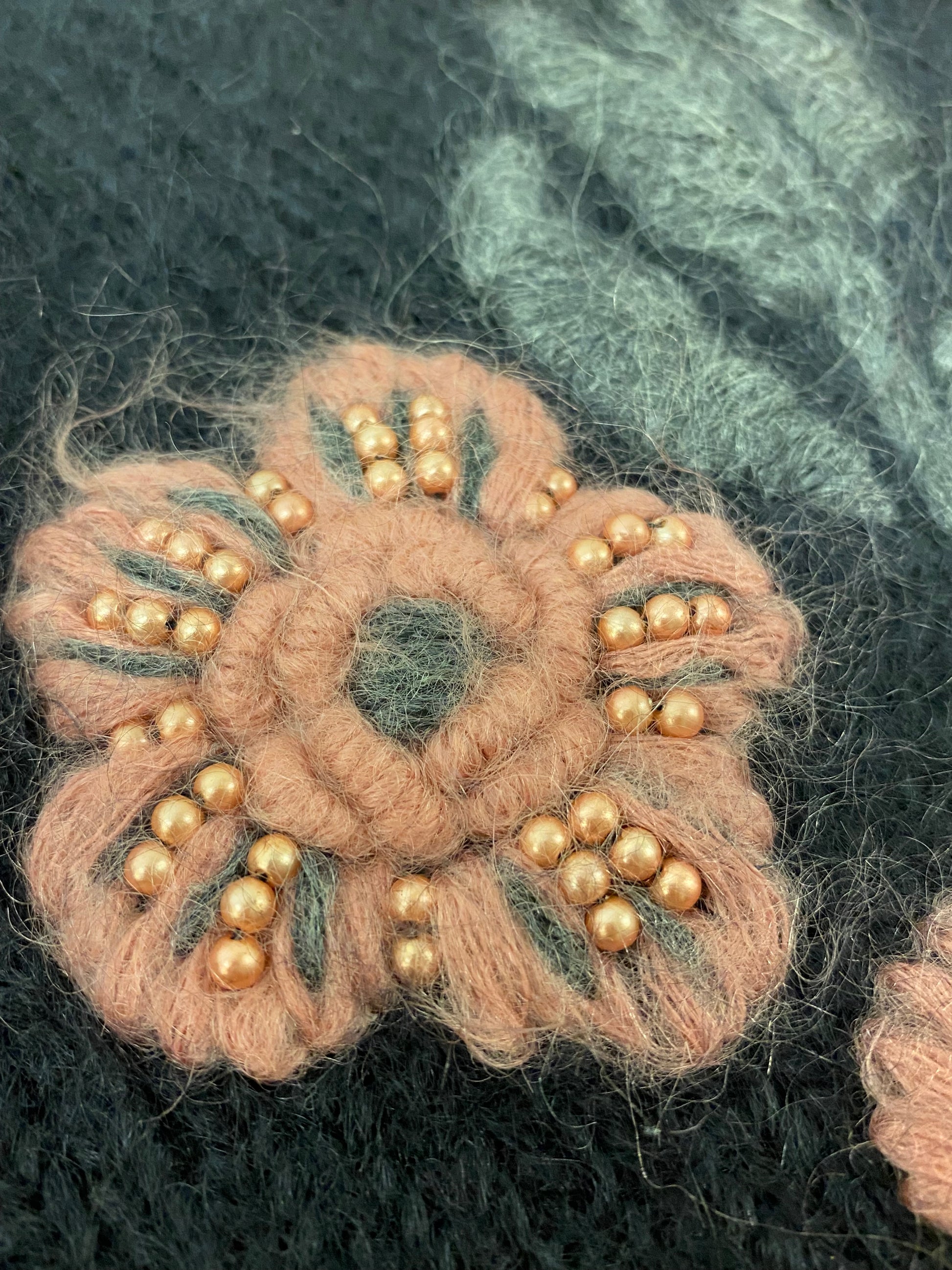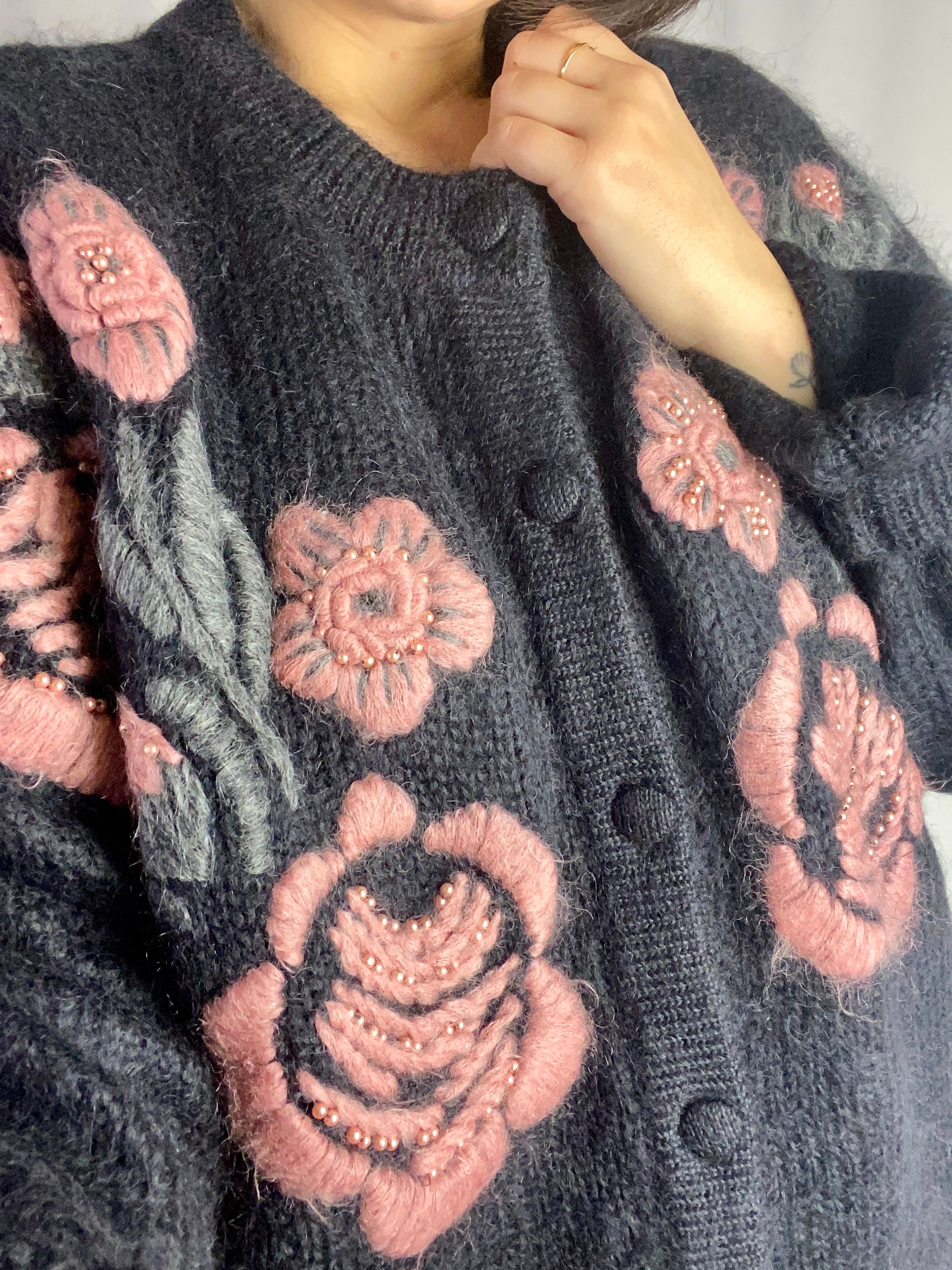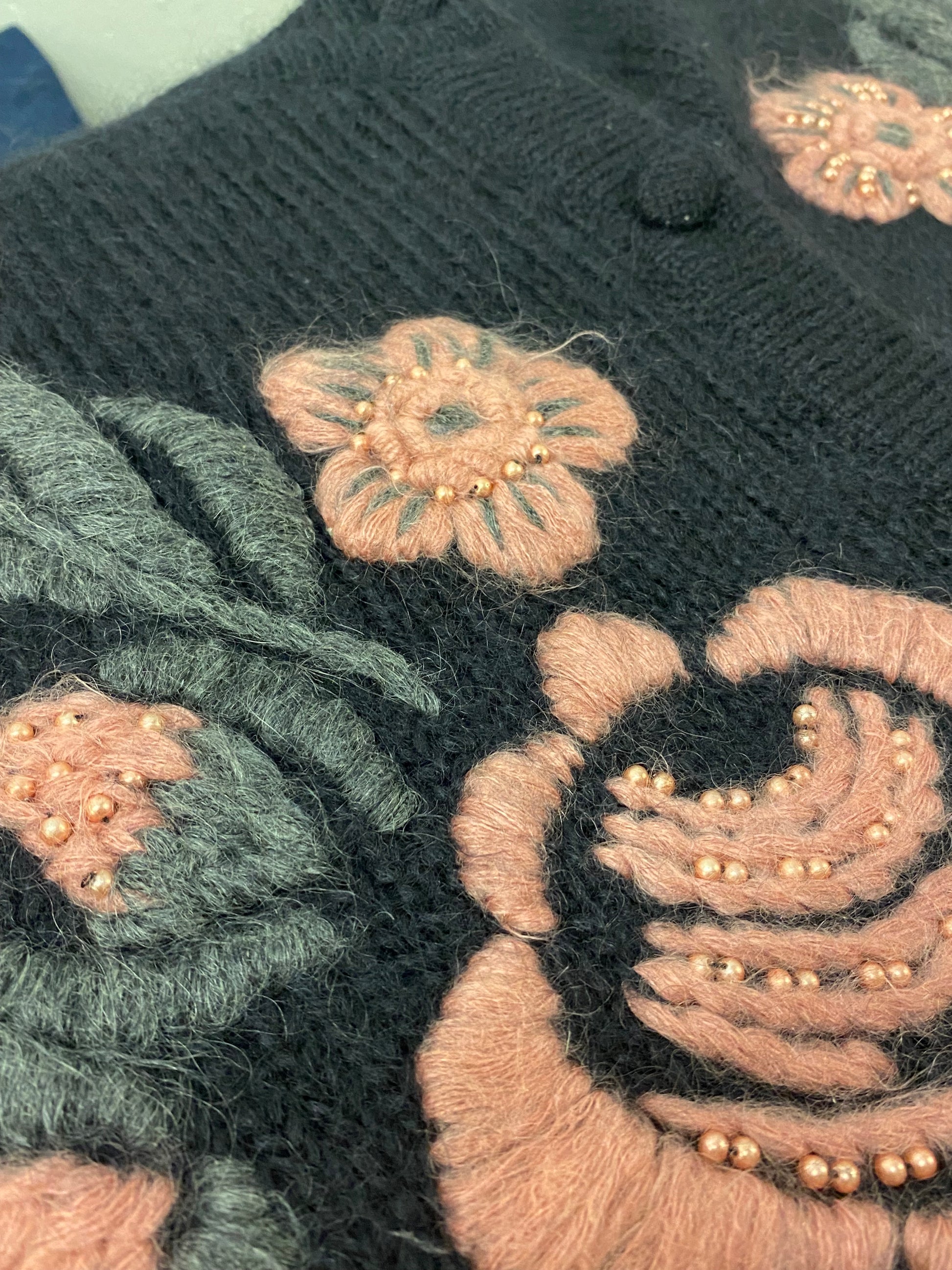 Cardigan anni ‘80 colore nero, con raffinata fantasia floreale rosa con delicate perline
