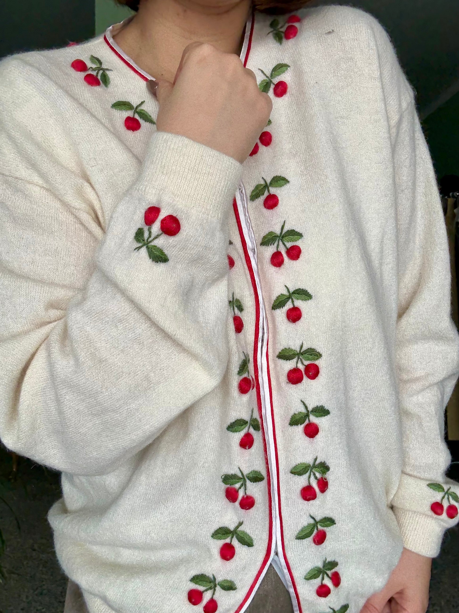 Cardigan vintage in morbida lana bianca, caratterizzato da ricami a motivo ciliegia distribuiti su fronte, scollo e polsini. Presenta bordatura in filato rosso lungo l’apertura e lo scollo, struttura morbida con spalla scesa, maniche lunghe e chiusura frontale con gancetti nascosti. Il capo è interamente foderato.