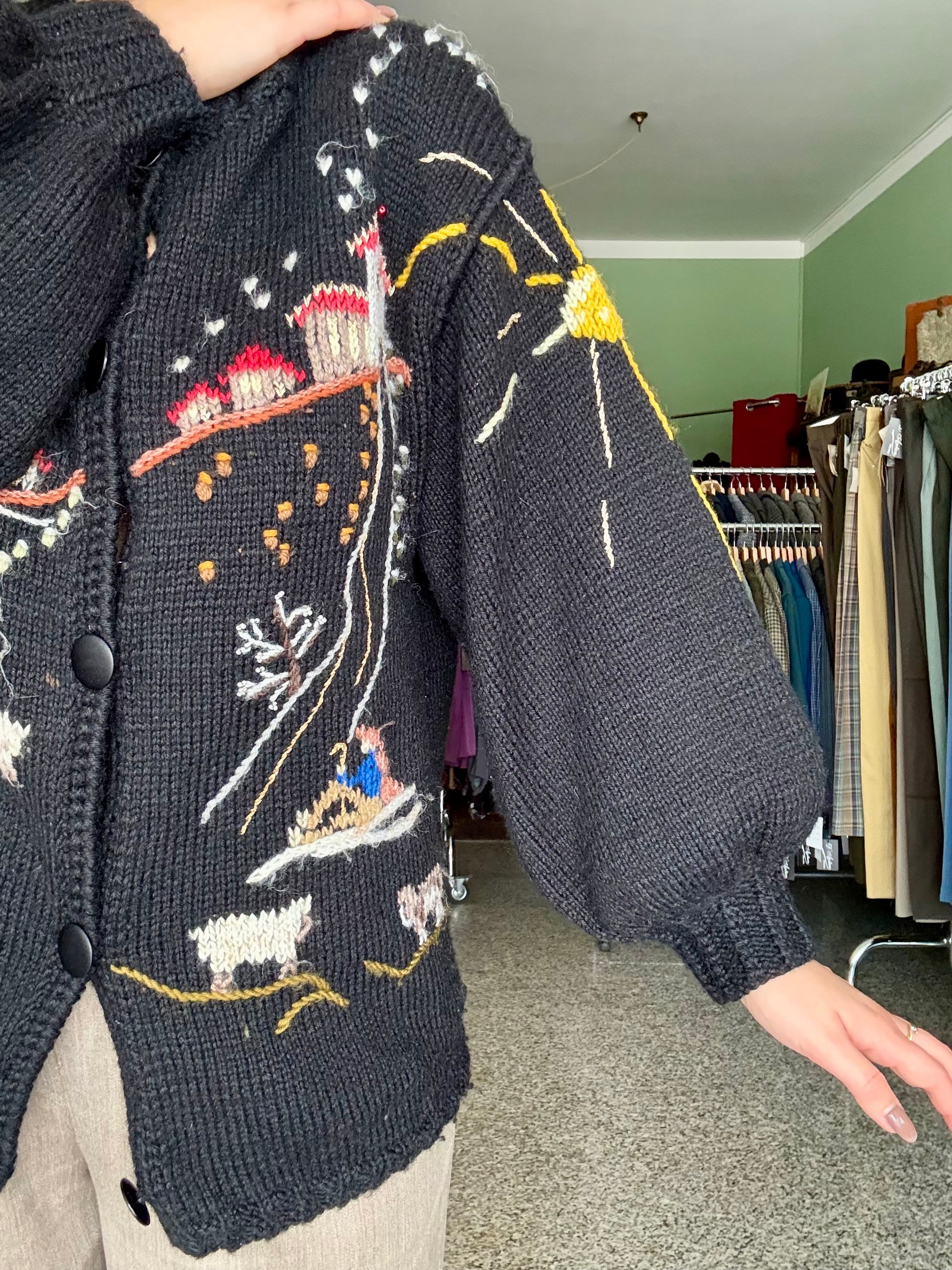 Cardigan tirolese in lana lavorata a maglia, decorato con ampio ricamo frontale e posteriore raffigurante scena montana con case, animali e dettagli naturali, realizzato con filati multicolore in rilievo. Presenta maniche lunghe a volume con polsini a coste, scollo rotondo strutturato, bordature a maglia grossa e chiusura frontale con bottoni neri opachi.