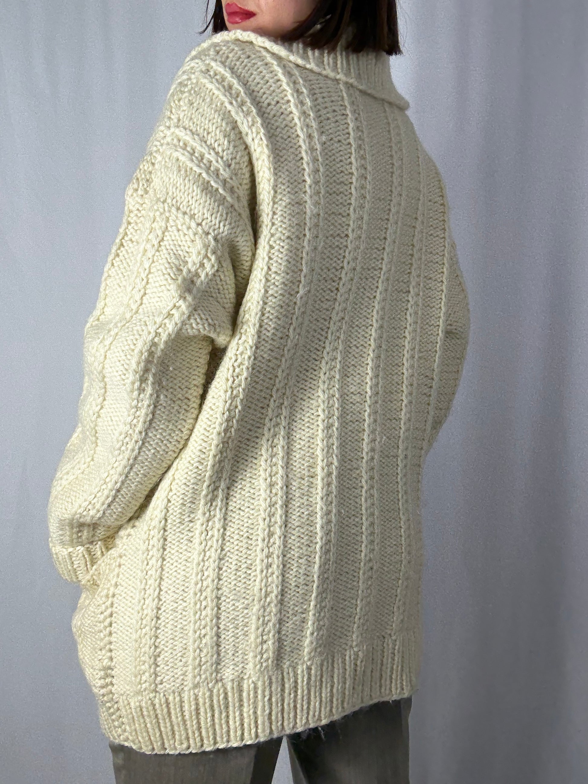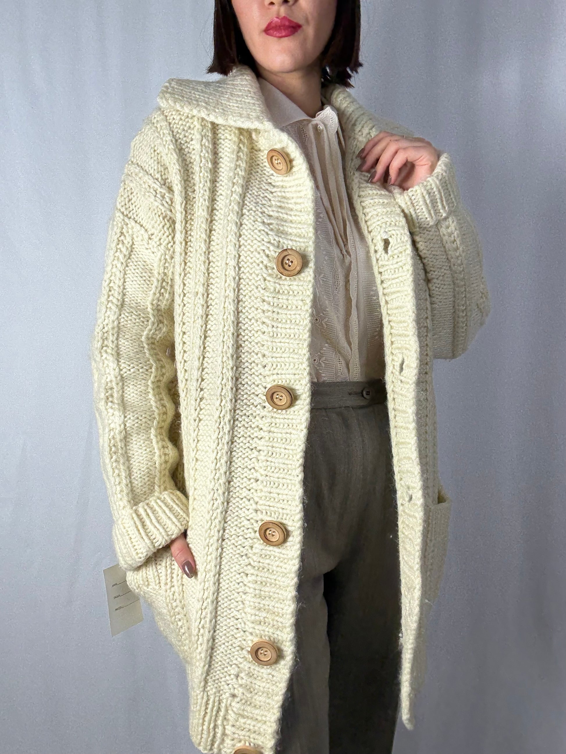 Cardigan lungo in lana grossa color crema, con lavorazione a treccia e ampio colletto strutturato. Dotato di bottoni in legno e grandi tasche frontali, è un capo caldo, avvolgente e perfetto per l’inverno. Ideale per chi cerca maglieria artigianale di qualità e uno stile cozy dal tocco retrò.