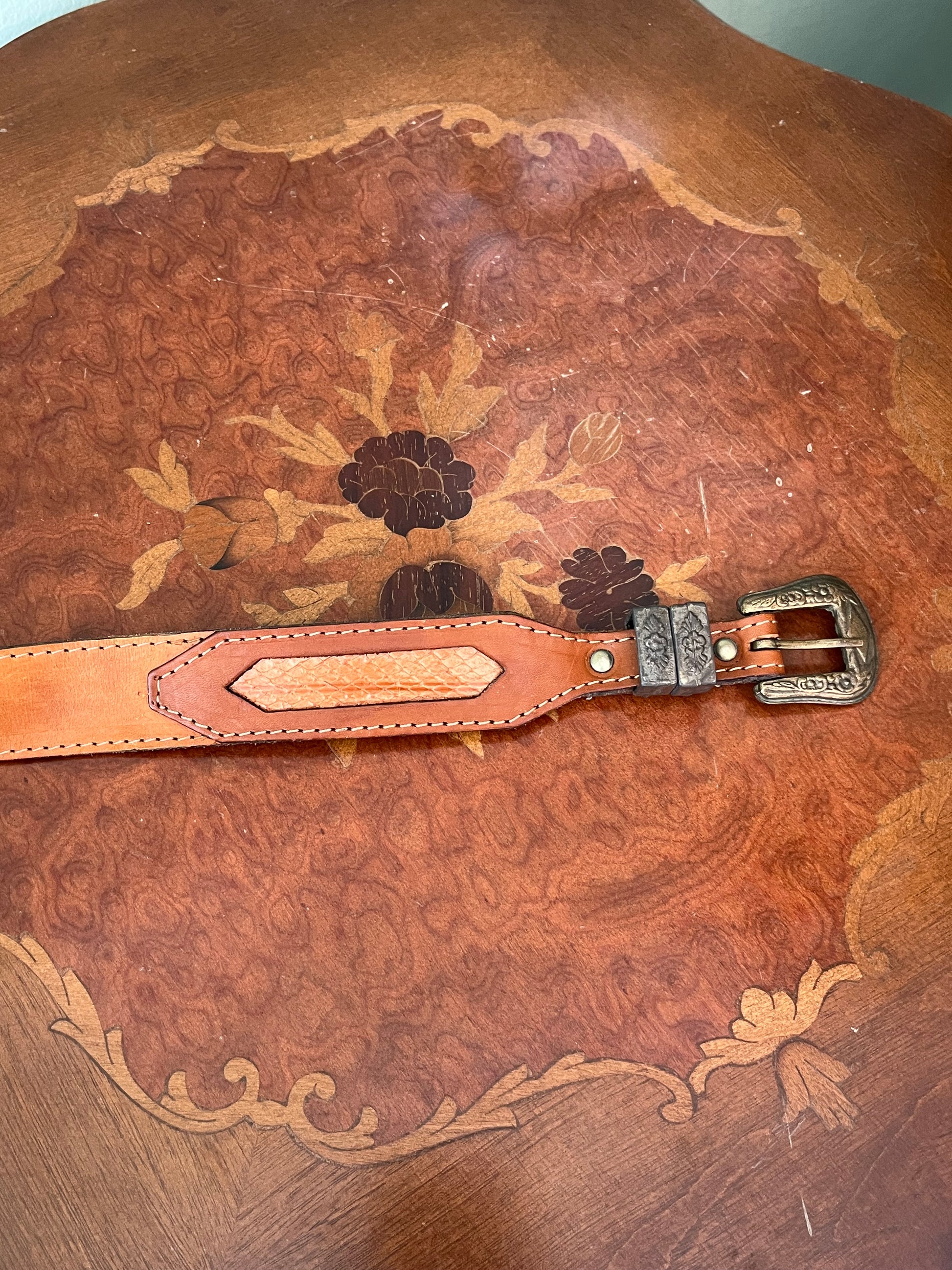 Cintura in vera pelle, colore marrone, con fibbia texana color bronzo. La parte metallica presenta alcune scoloriture (il prezzo ne tiene conto).