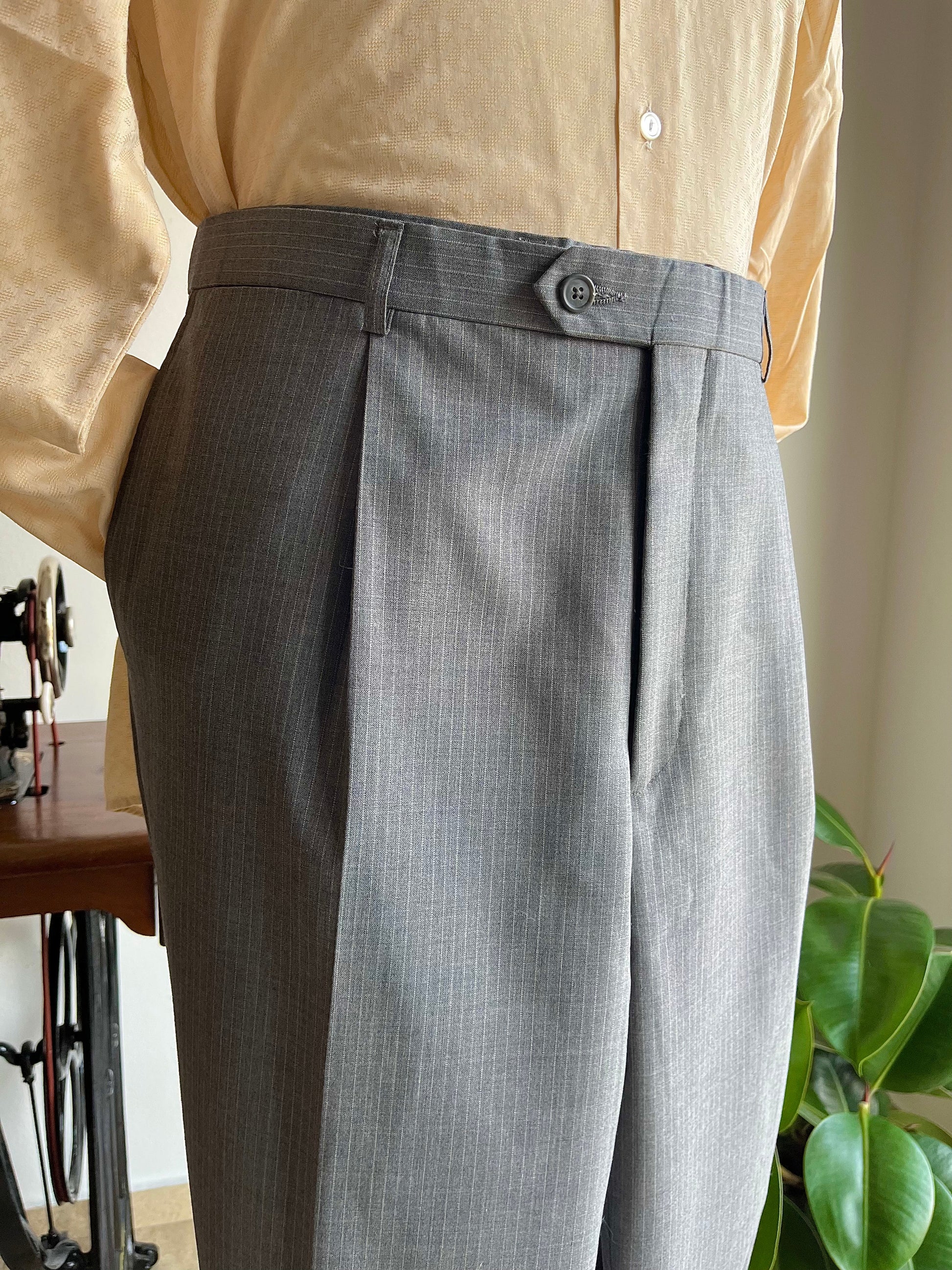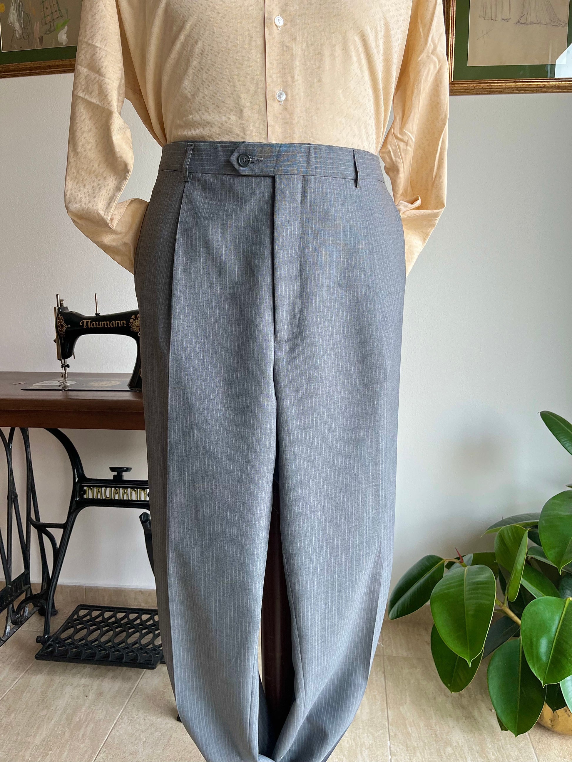I calzoni hanno un taglio classico, con vita alta, una piega in vita ed un taglio dritto. Si presentano nuovo con l’orlo ancora da chiudere.