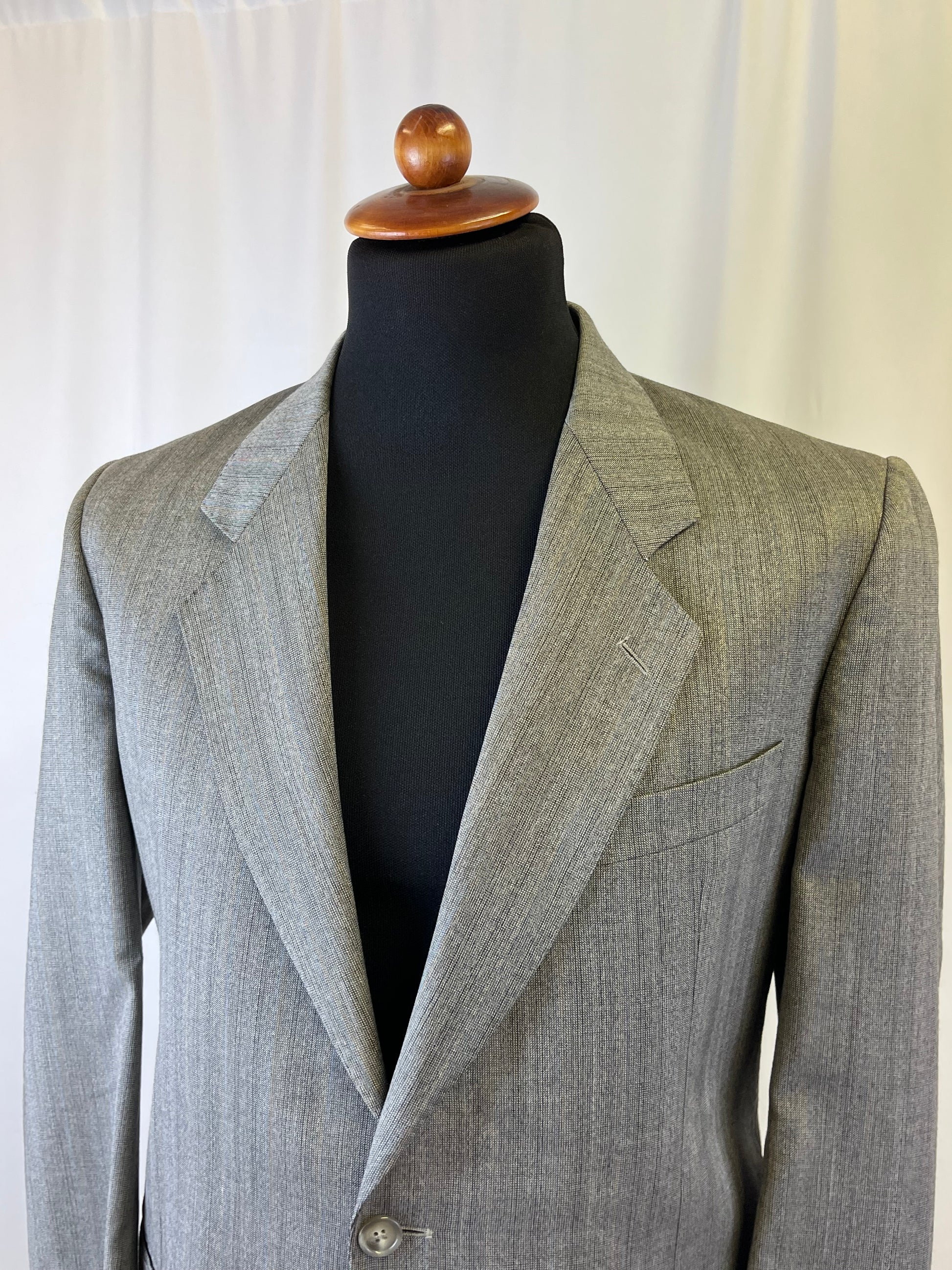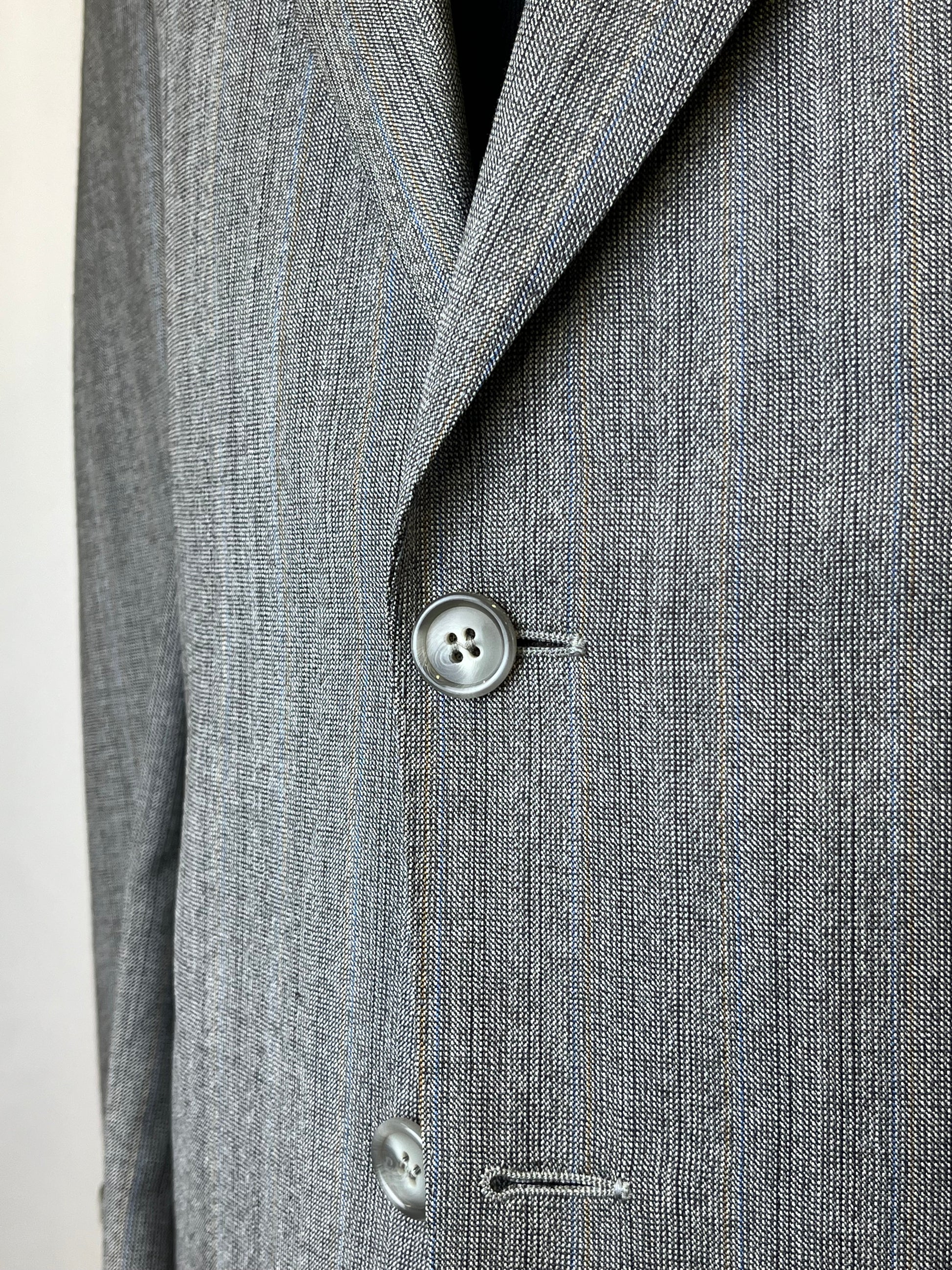 La giacca è un monopetto, dUe bottoni, baveri a dente, tasche a filetto.
