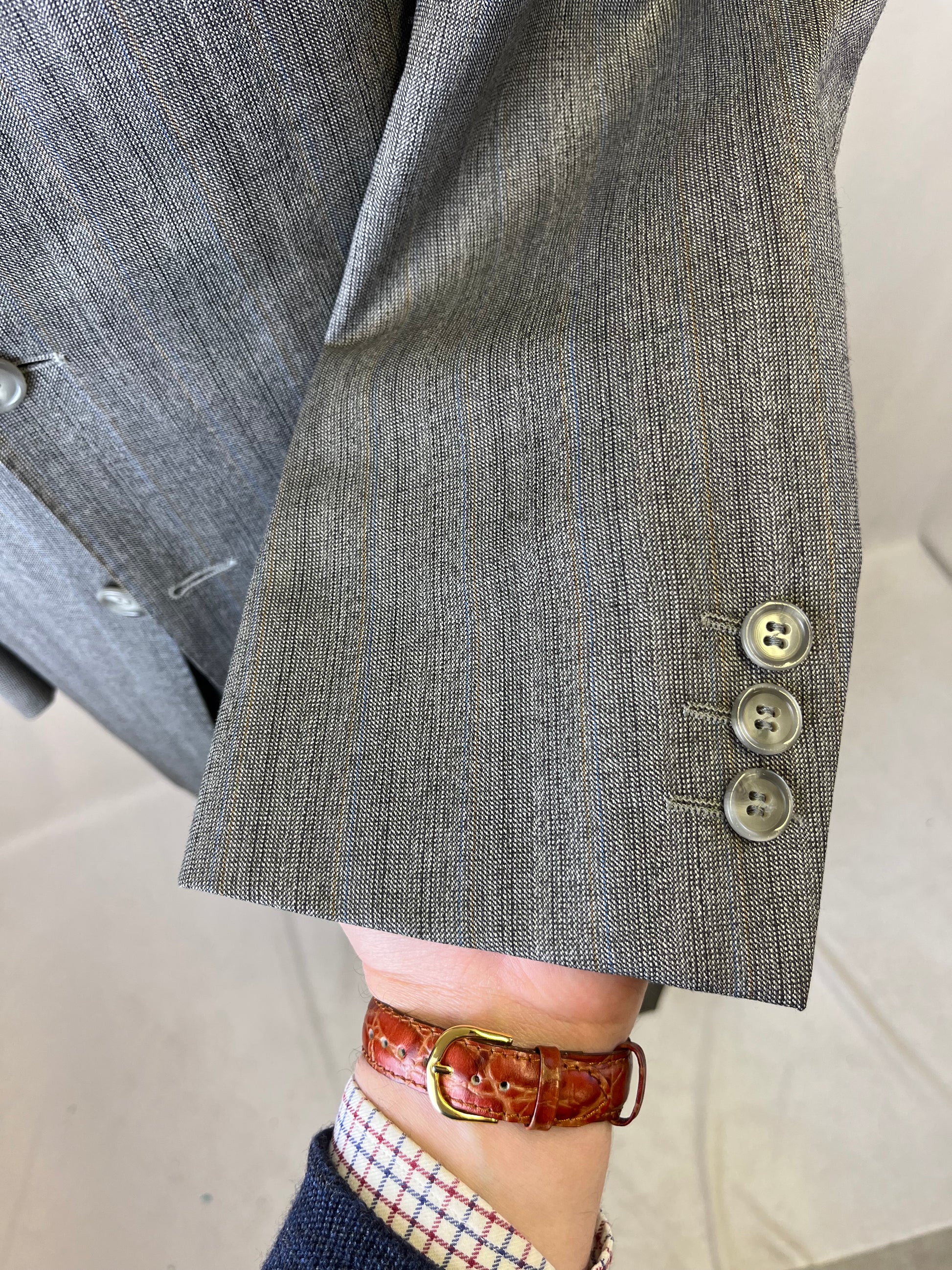 Il tessuto è un 100% fresco di lana, di colore grigio chiaro, con leggera gessatura blu e senape.