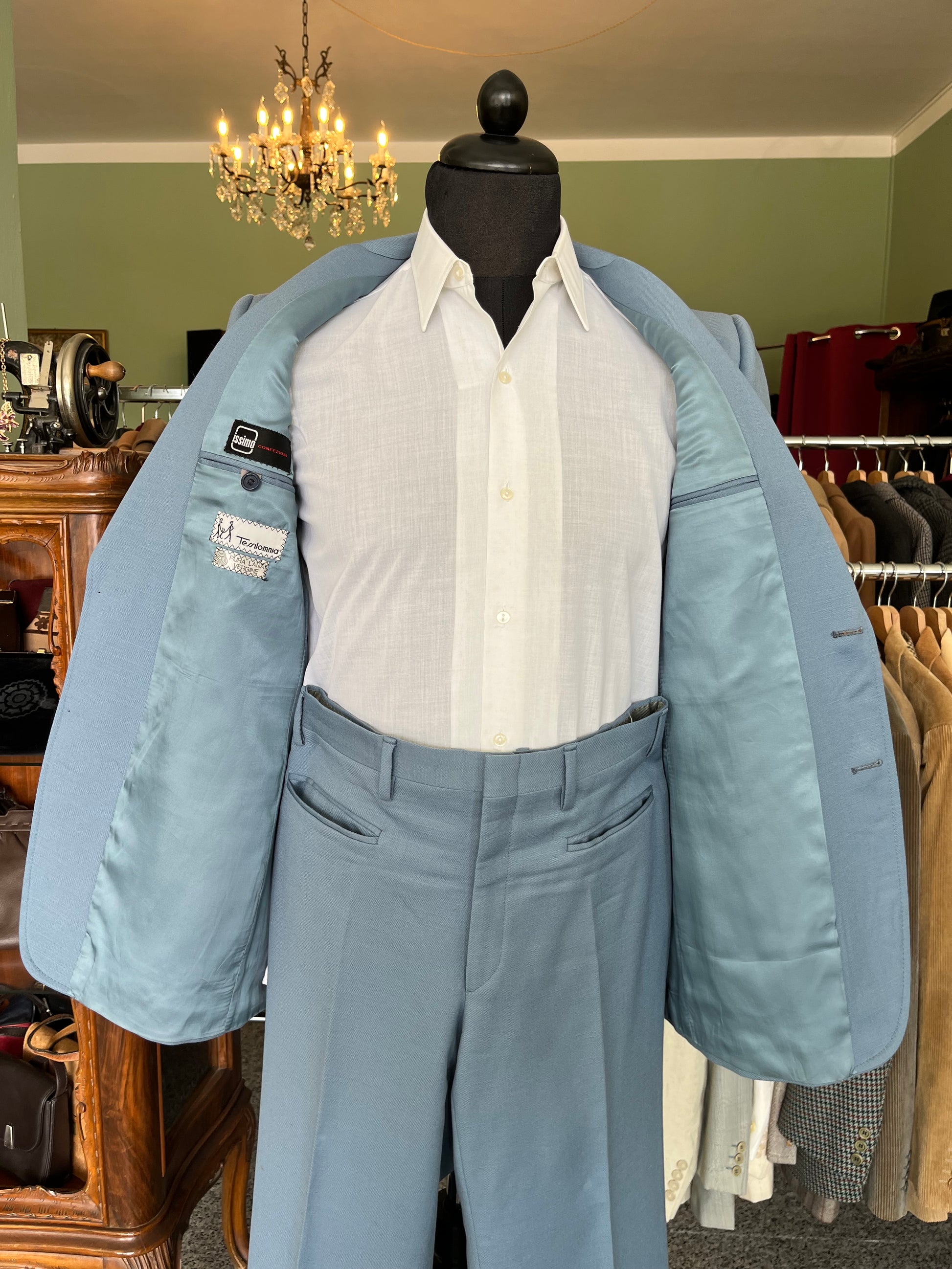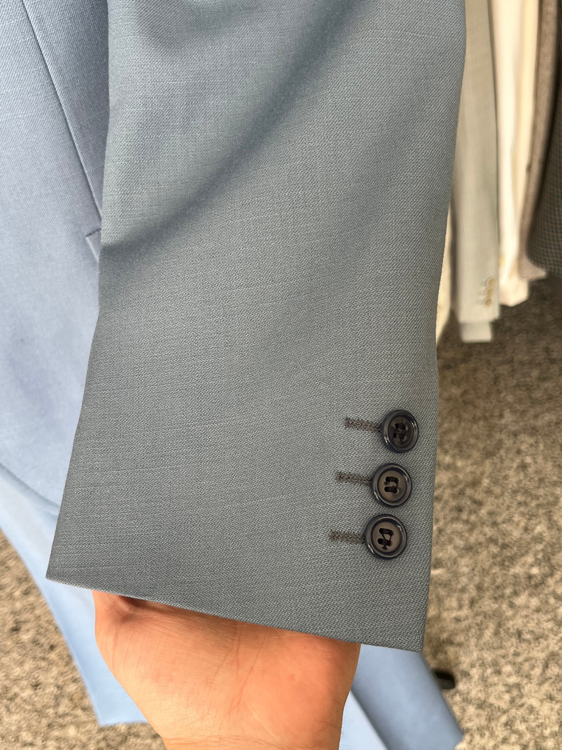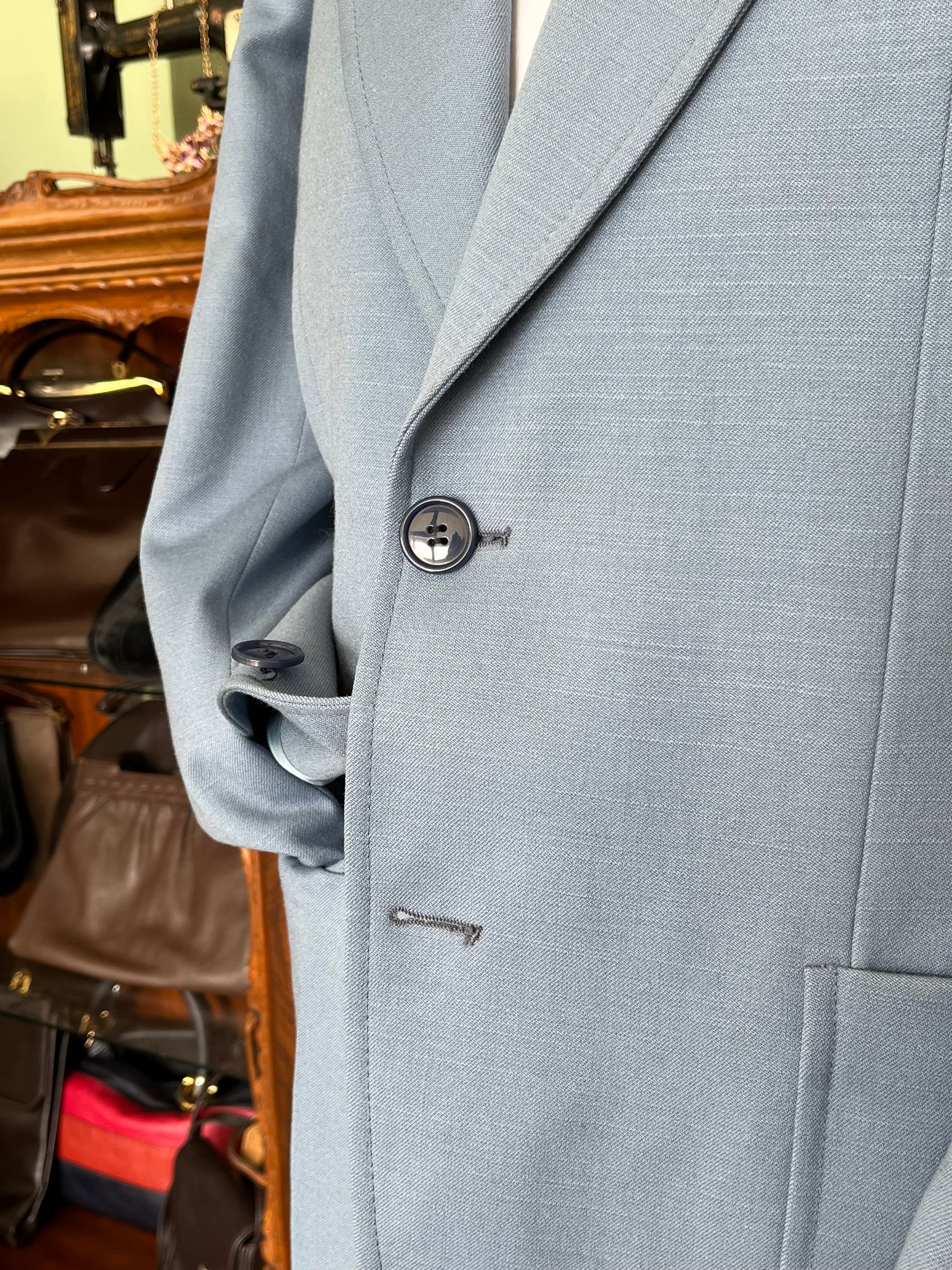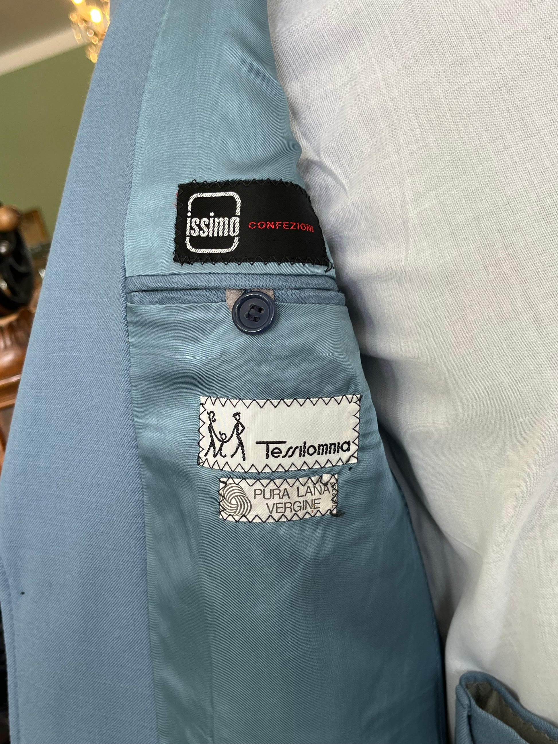 Il tessuto è un 100% pura lana di pesantezza media, di colore celeste.