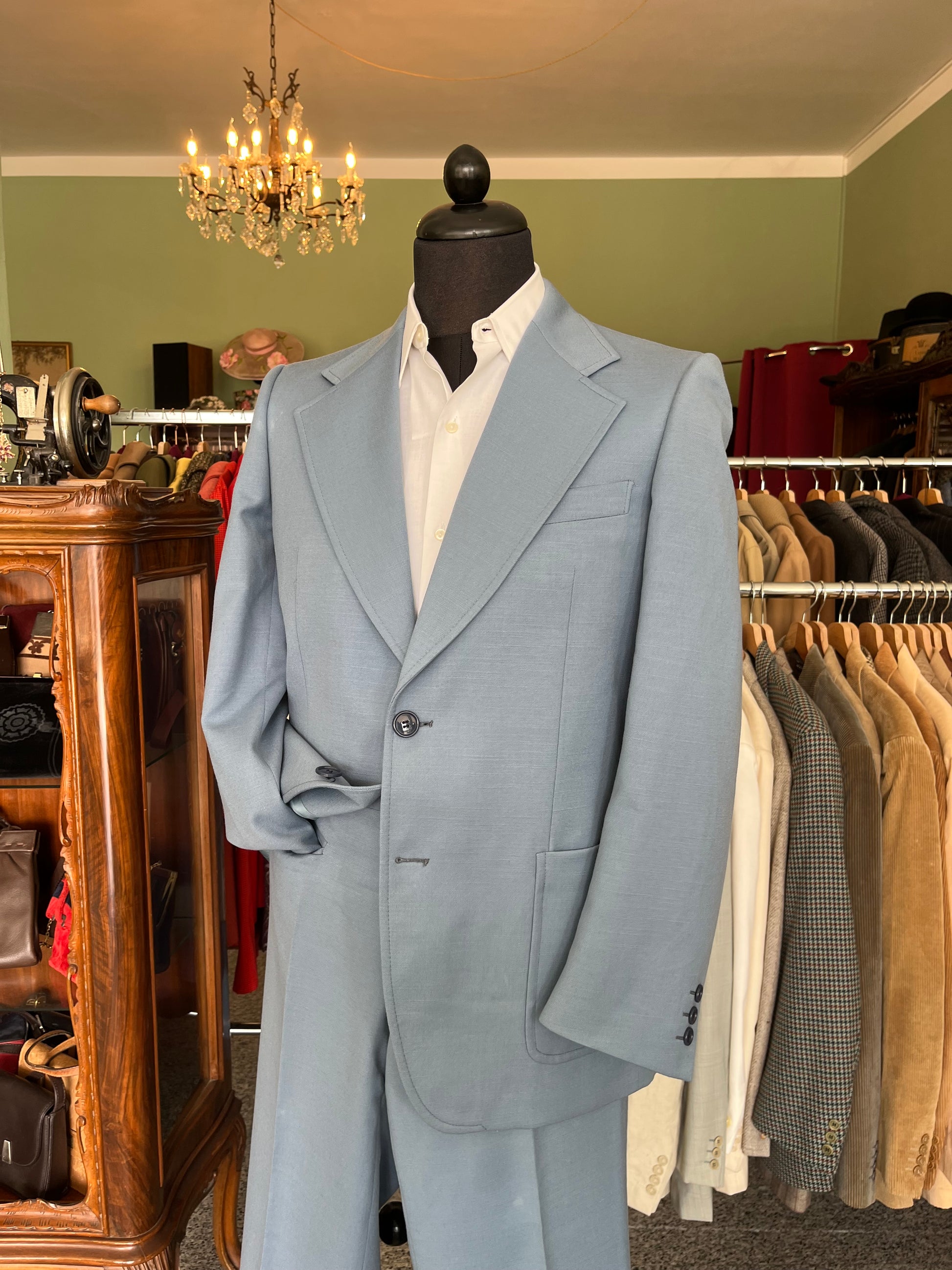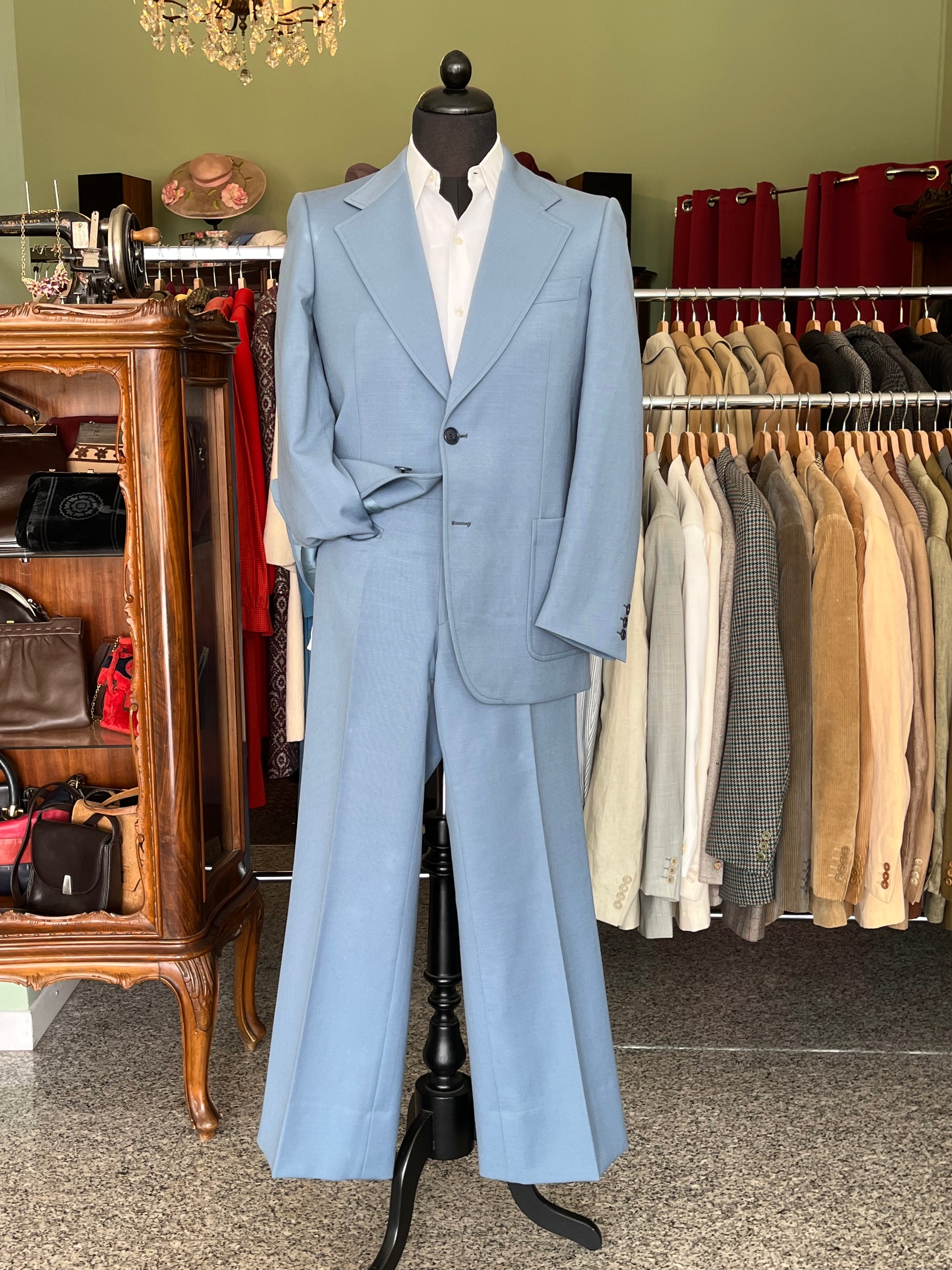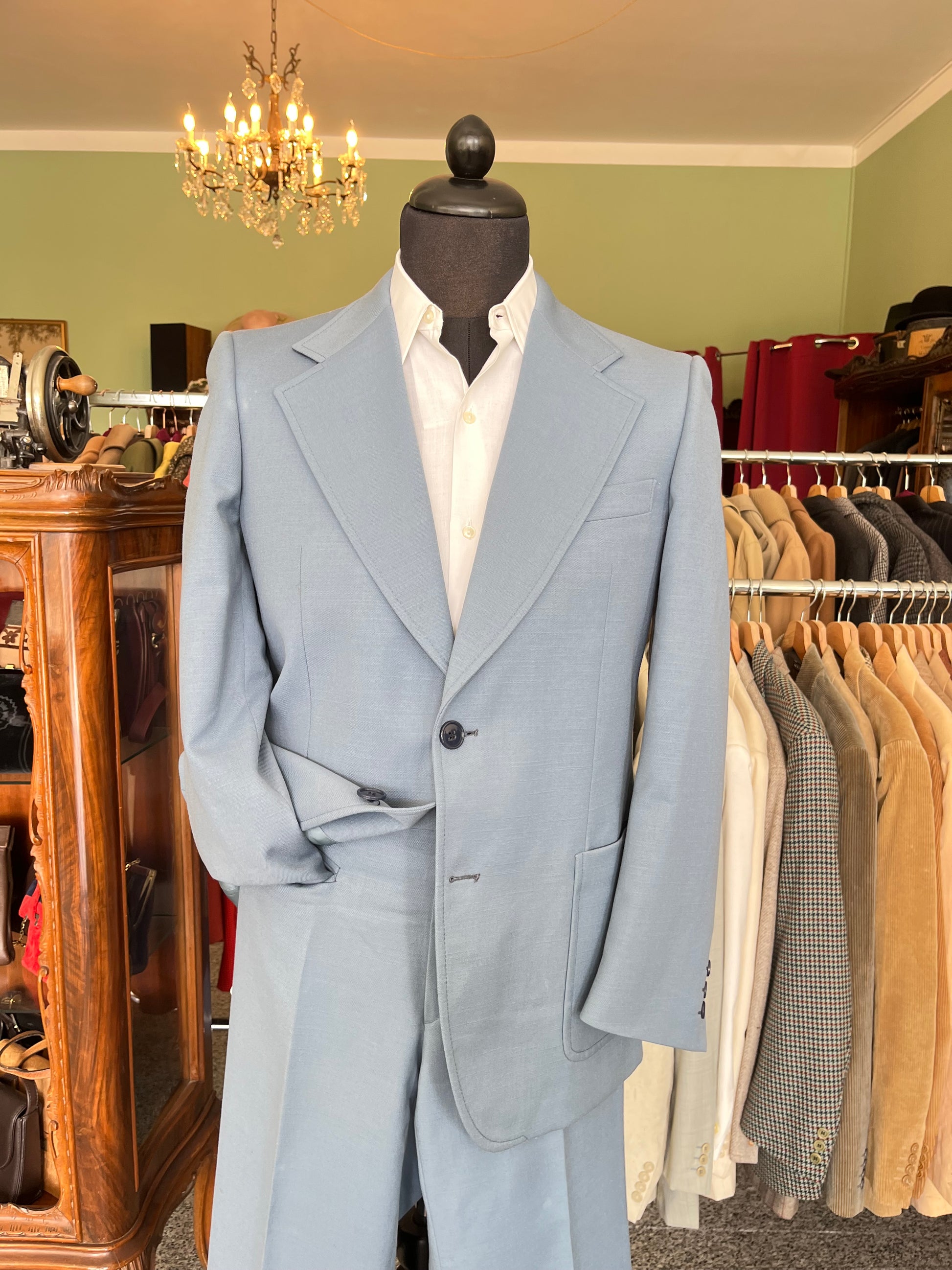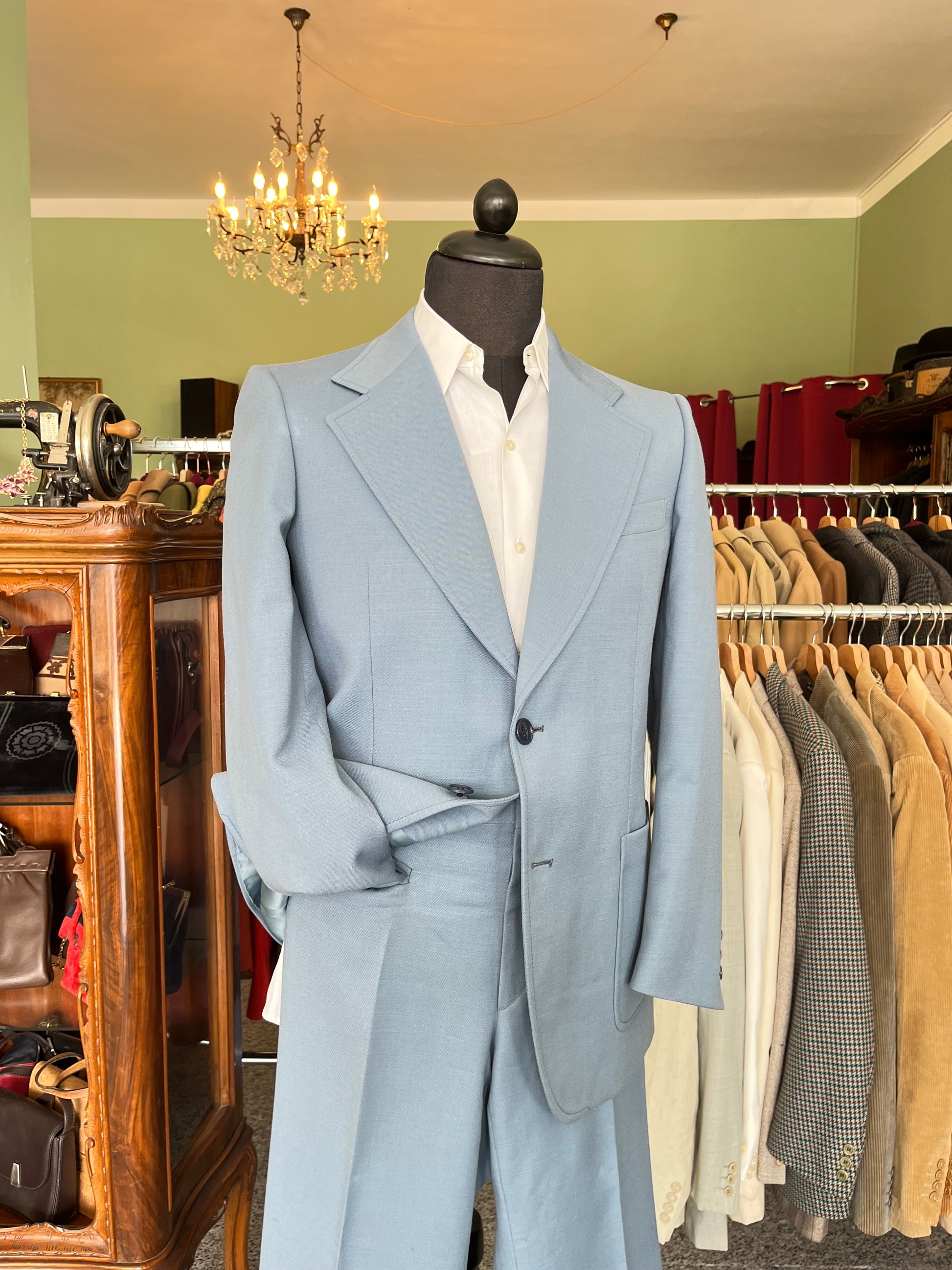 Il tessuto è un 100% pura lana di pesantezza media, di colore celeste.