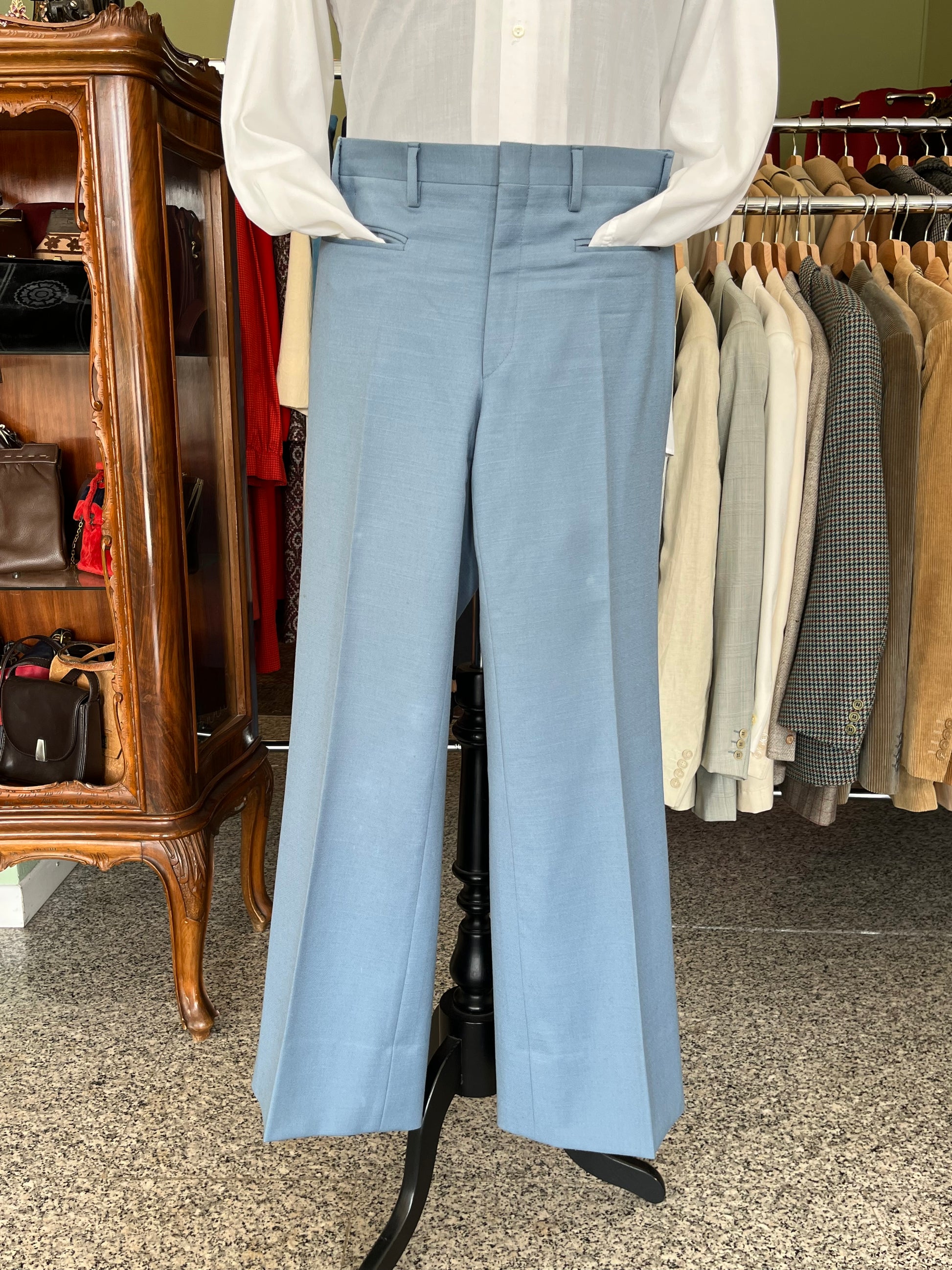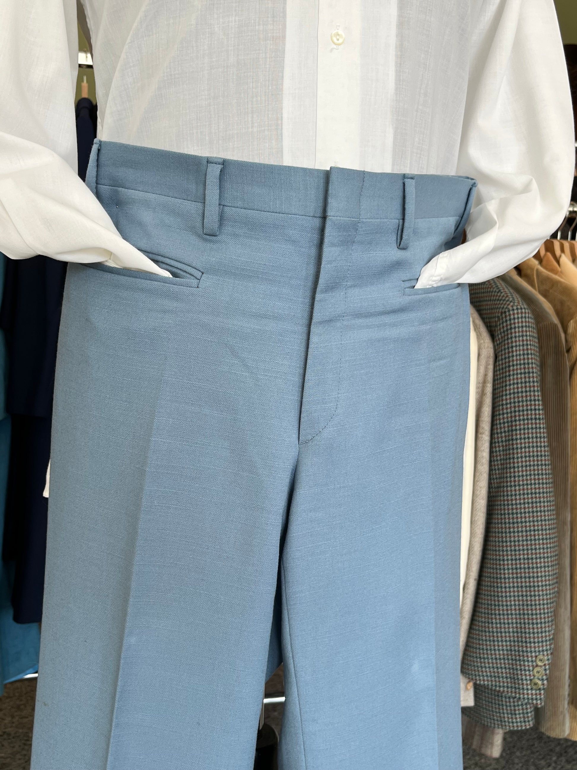 I calzoni hanno un taglio scampanato tipico degli anni ‘70, con tasche alla carrettiera e gamba a zampa (28 cm).